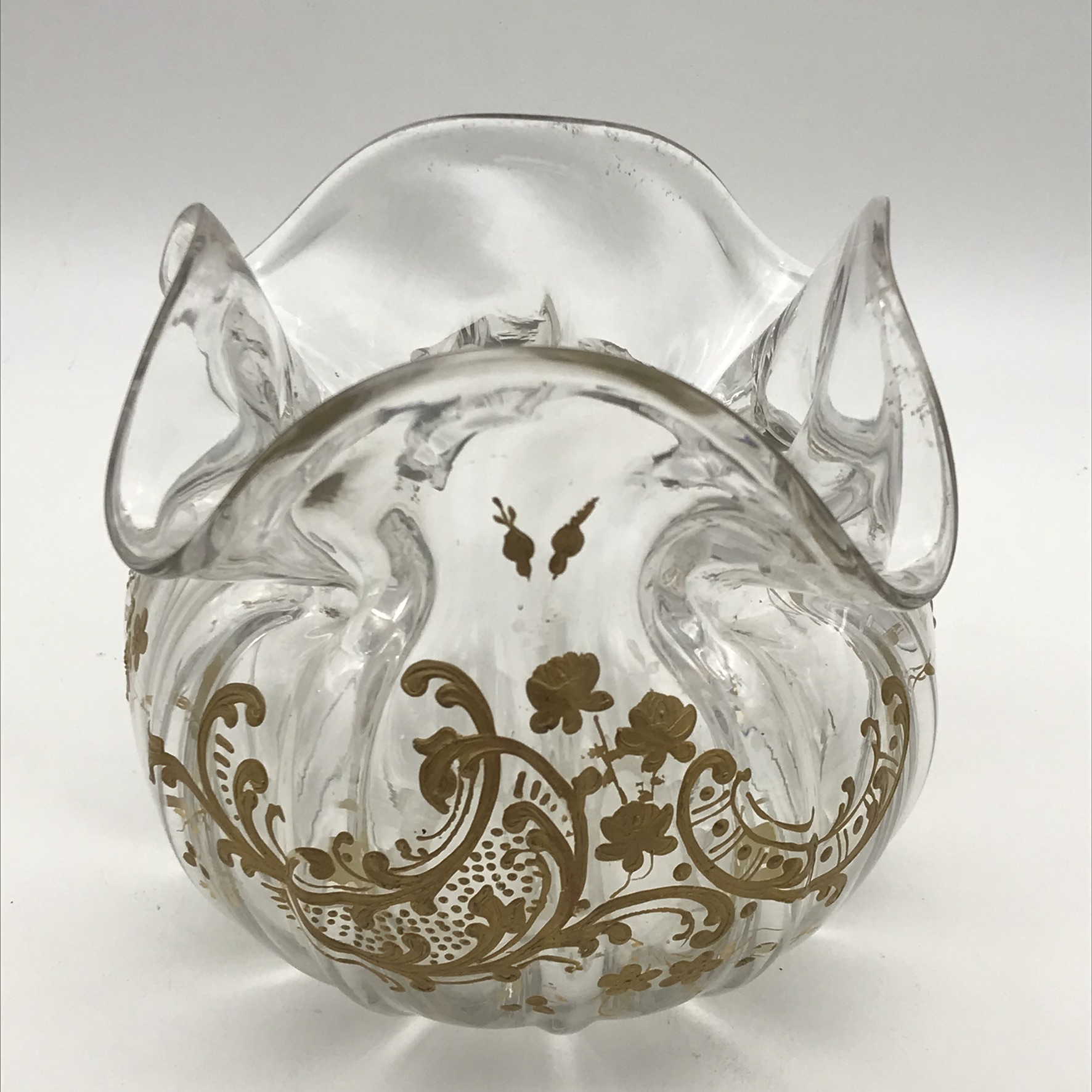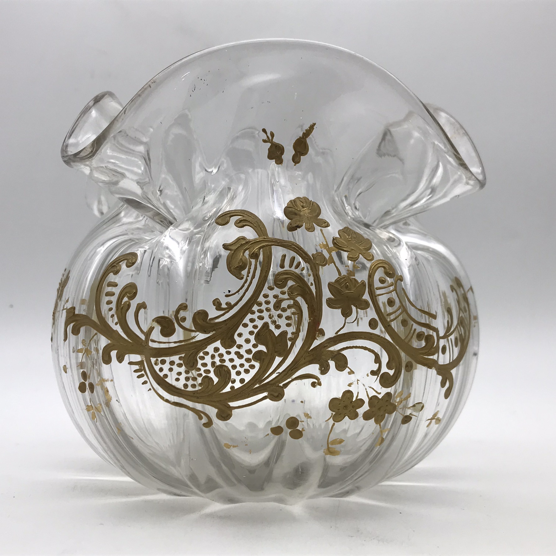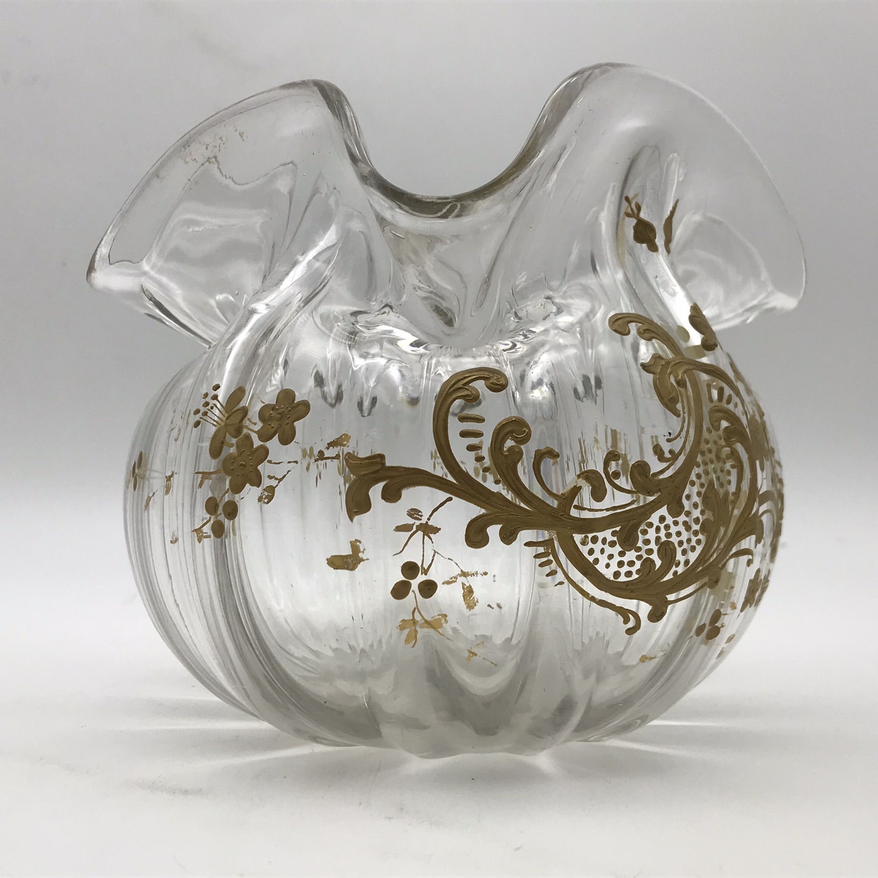 This amazing, antique, hand-blown ‘handkerchief’ glass vase from the late 1800’s, has a wonderful shape and is beautifully hand decorated in gold, with garlands of flowers. It has an unusual round and squat shape with a handkerchief, ruffle shaped top and scalloped rounded sides, and other than very minor gilt loss it’s in great condition. It stands 13,5cm with a diameter of 16,5cm, and weighs 745g.