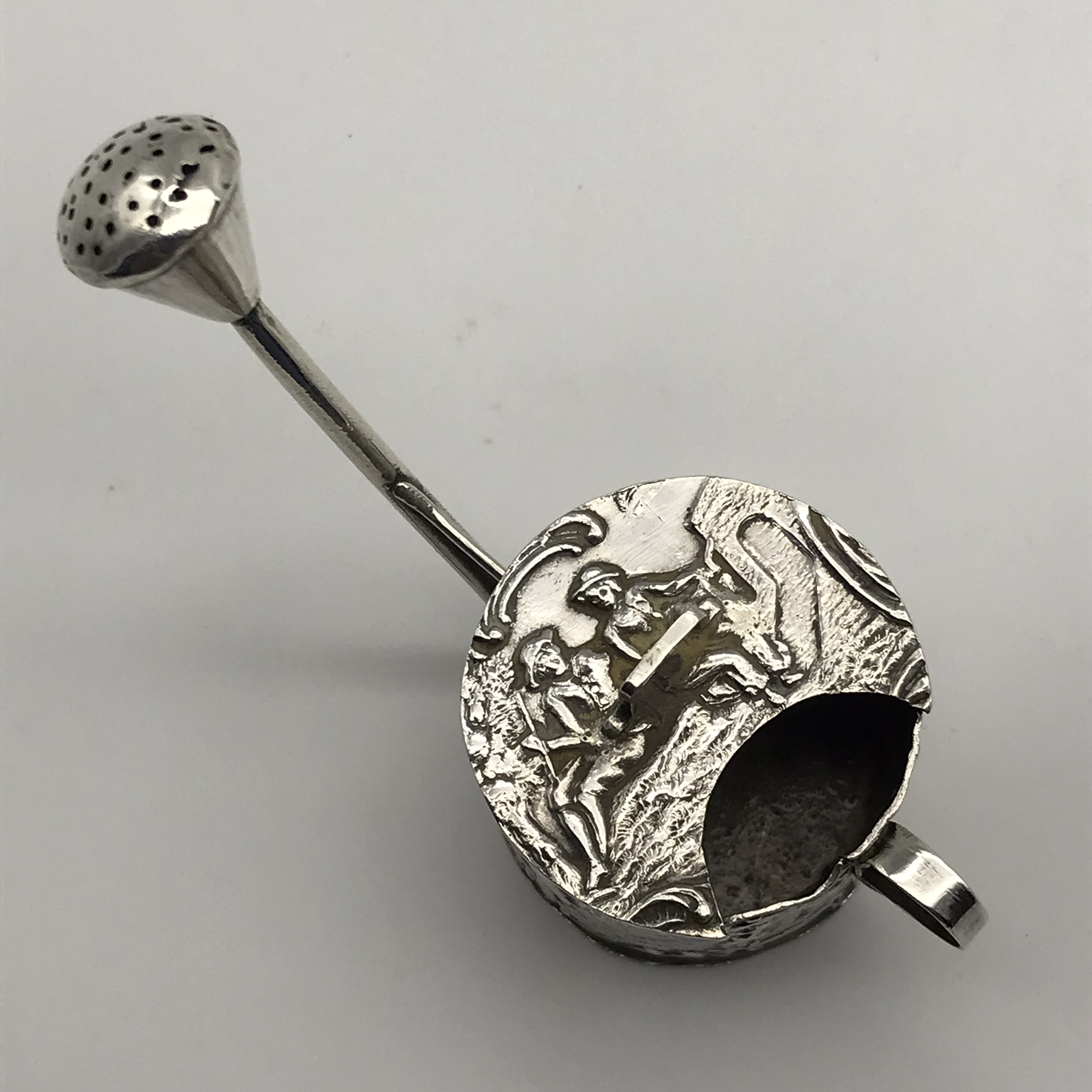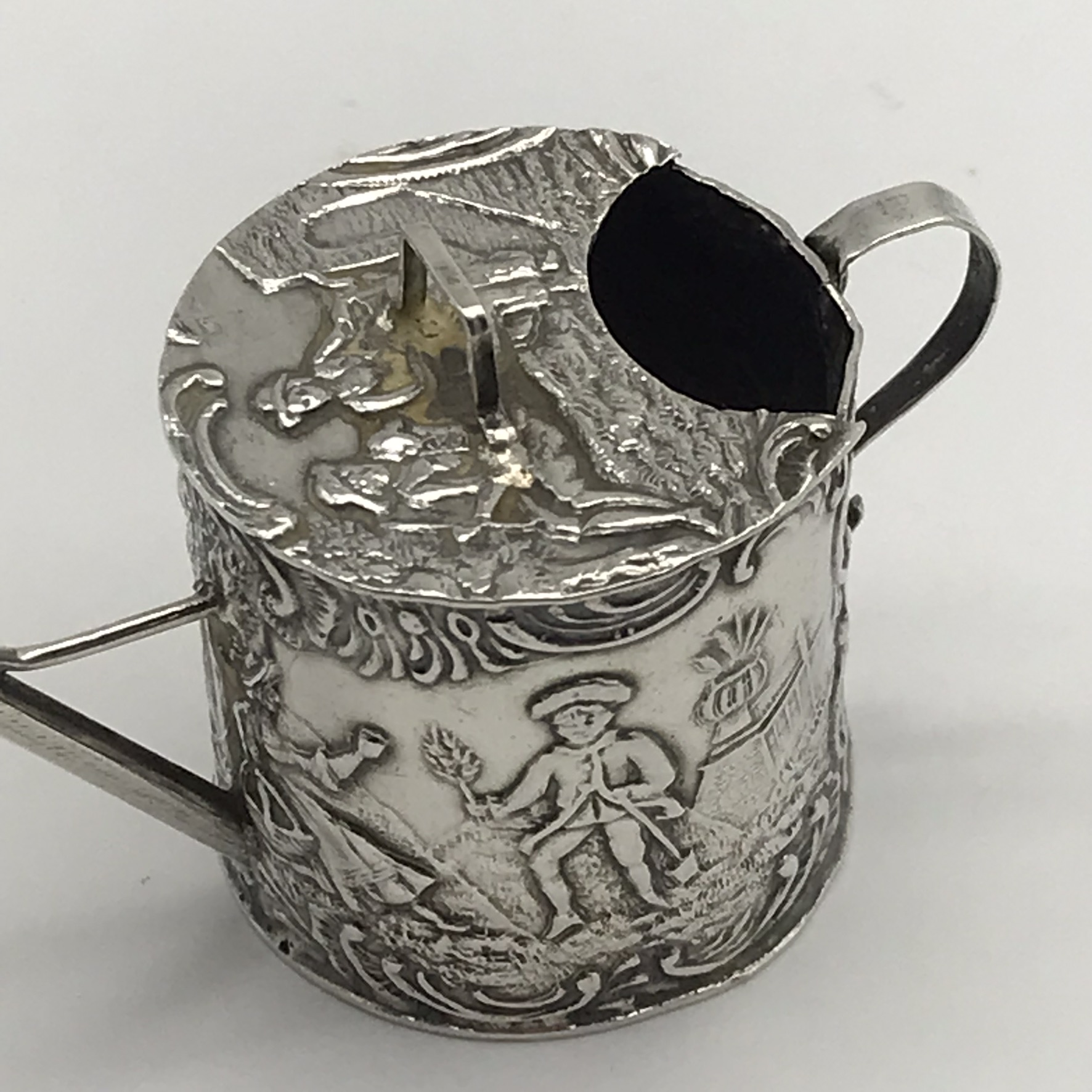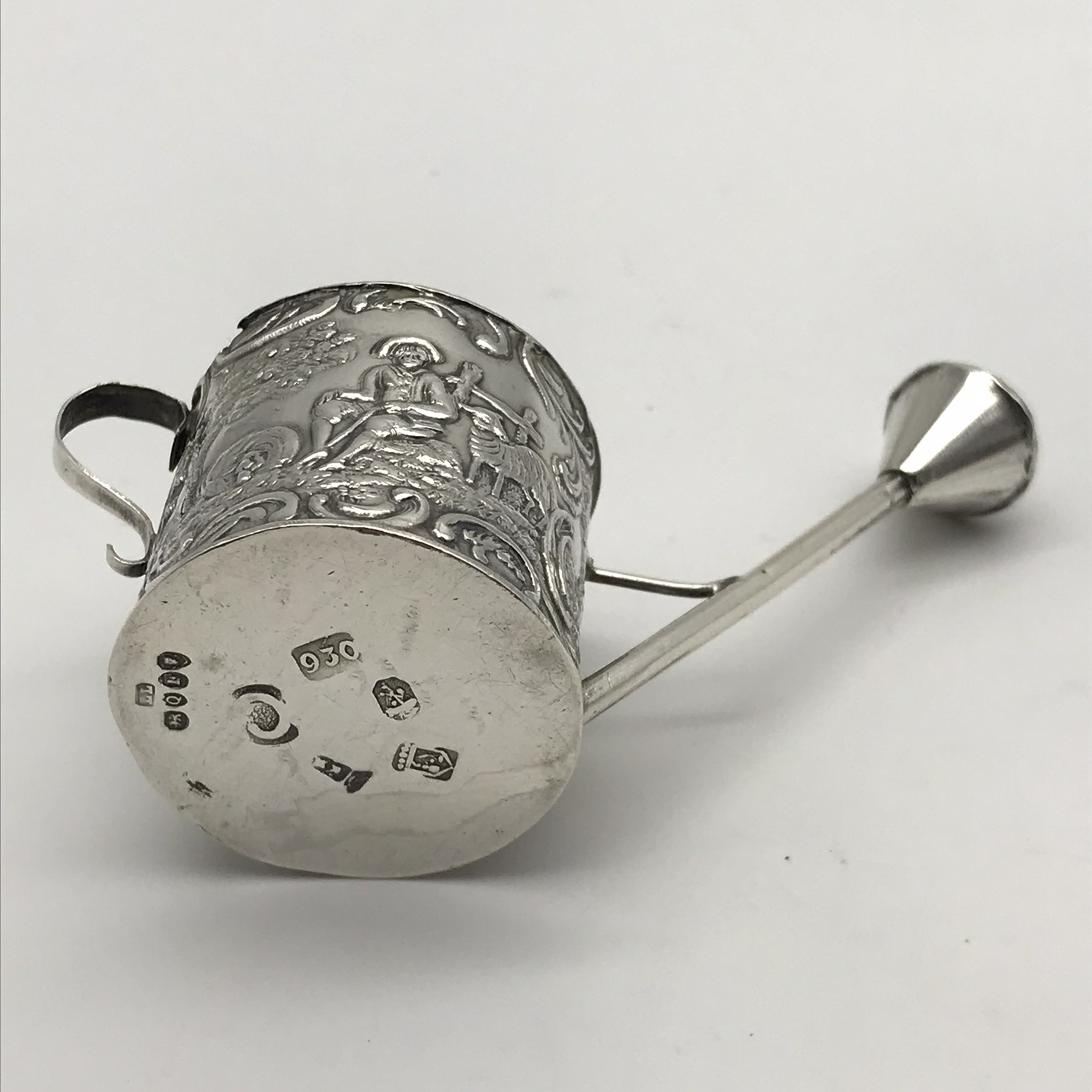 This charming, very collectable, scarce solid silver Victorian miniature novelty ‘Watering Can’ is beautifully made with lovely repousse detail. It features various rural scenes, with trees and sheep, a seated lady receiving flowers from a gentleman, as well as other scenes. It is stamped on the base with numerous continental silver marks, and English import hallmarks for London 1891, with silversmith’s initials ‘LL’ for ‘Lewis Lewis’. The lovely miniature is in great condition and functions as a watering can with water coming out the spout nozzle. It measures 75mm from handle to nozzle x 32mm, stands 34mm high (50mm to top of nozzle) and weighs 24,6g.