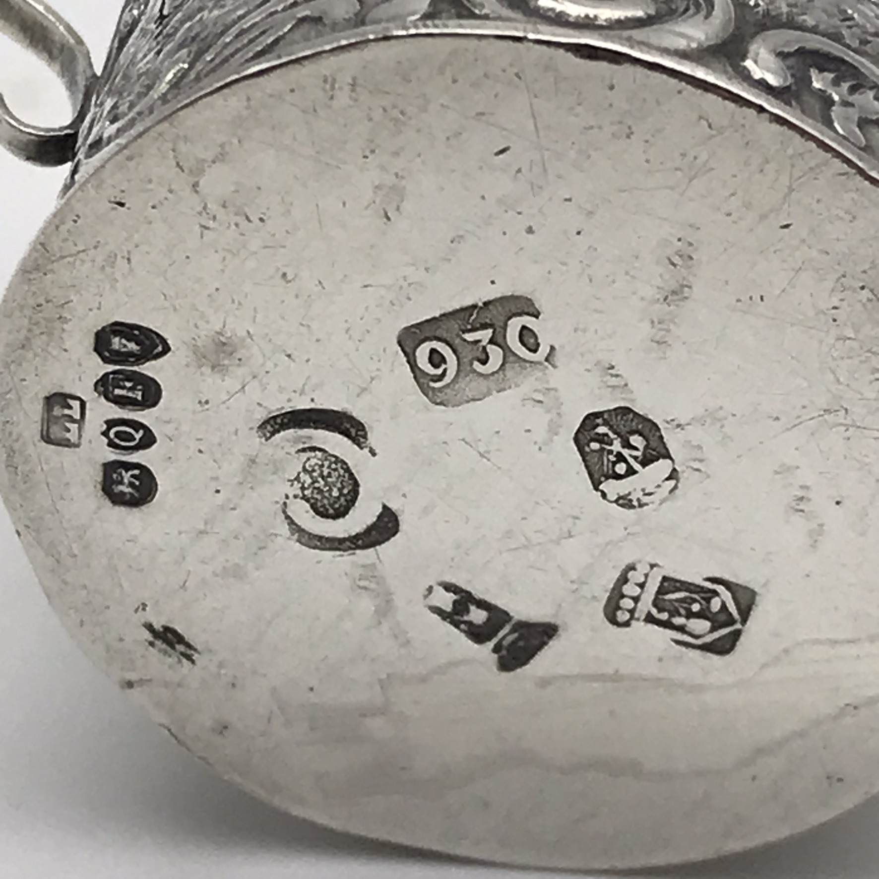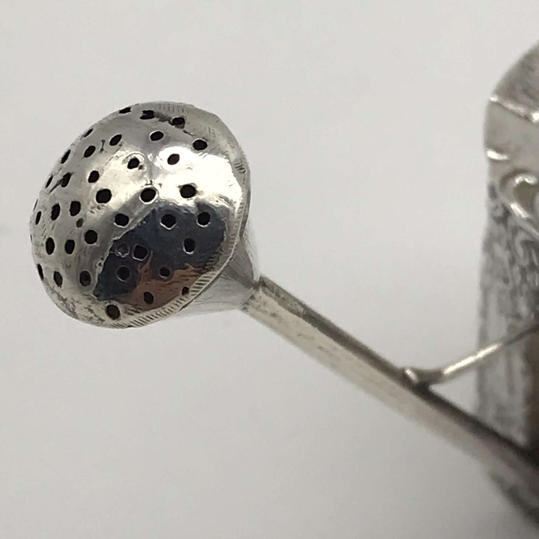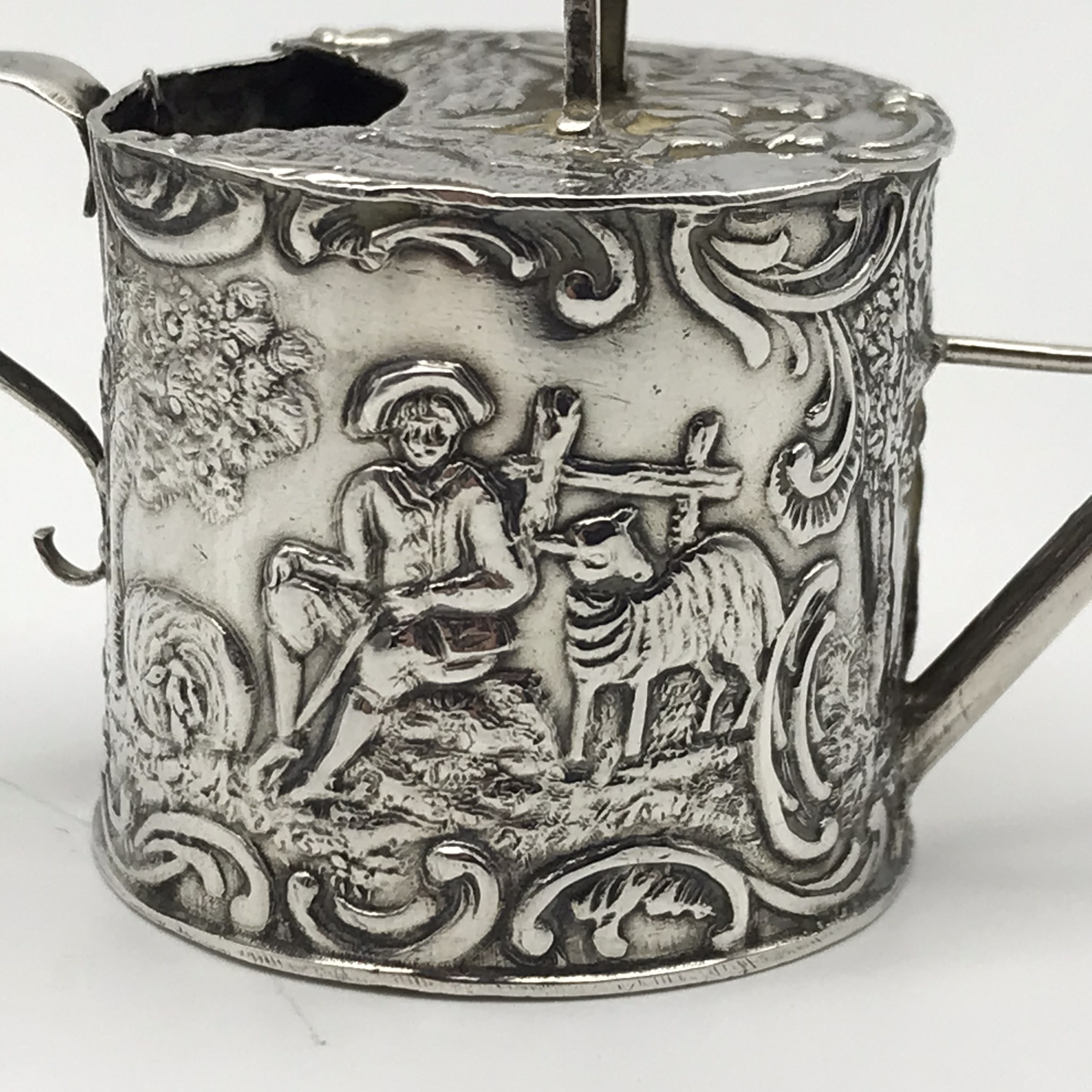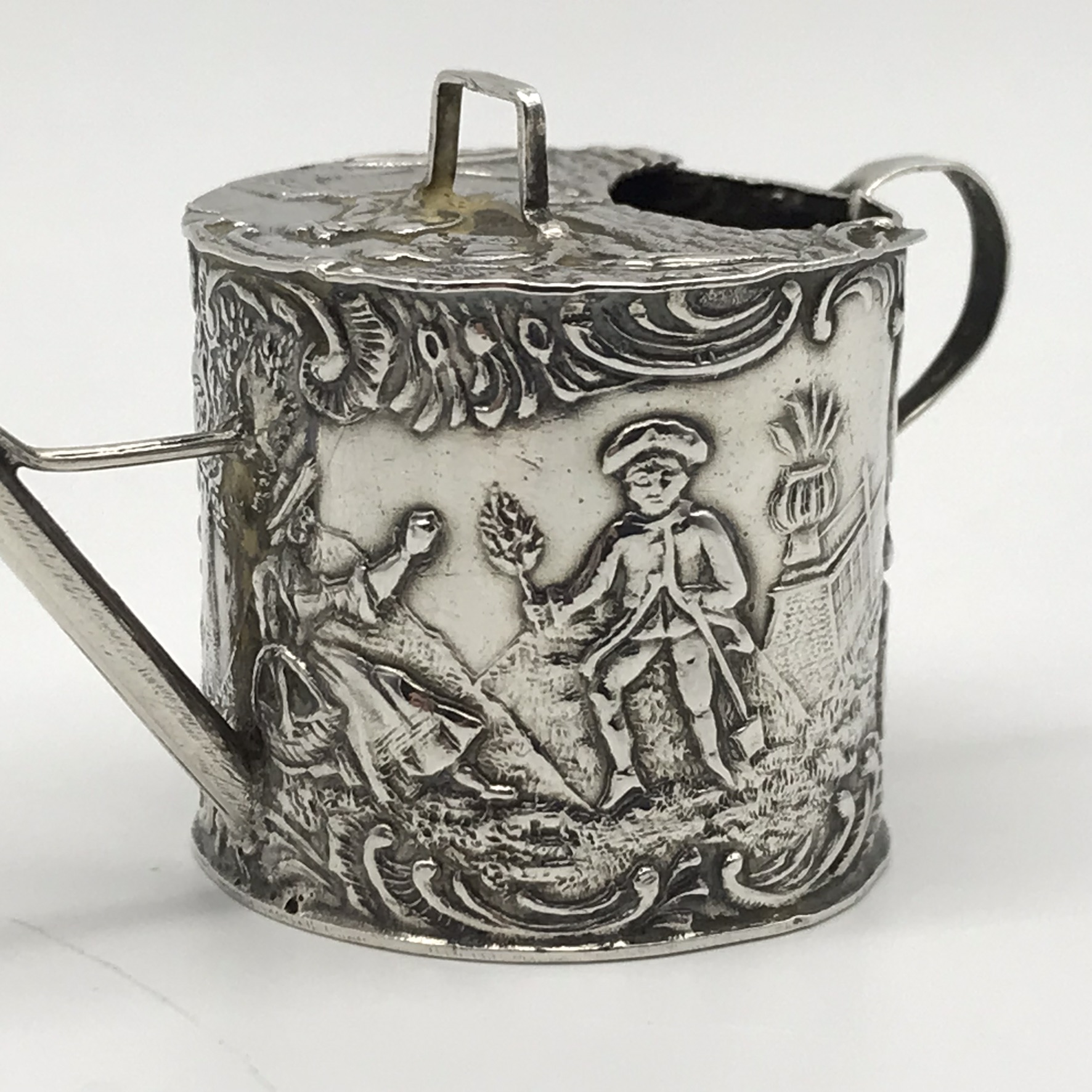 This charming, very collectable, scarce solid silver Victorian miniature novelty ‘Watering Can’ is beautifully made with lovely repousse detail. It features various rural scenes, with trees and sheep, a seated lady receiving flowers from a gentleman, as well as other scenes. It is stamped on the base with numerous continental silver marks, and English import hallmarks for London 1891, with silversmith’s initials ‘LL’ for ‘Lewis Lewis’. The lovely miniature is in great condition and functions as a watering can with water coming out the spout nozzle. It measures 75mm from handle to nozzle x 32mm, stands 34mm high (50mm to top of nozzle) and weighs 24,6g.