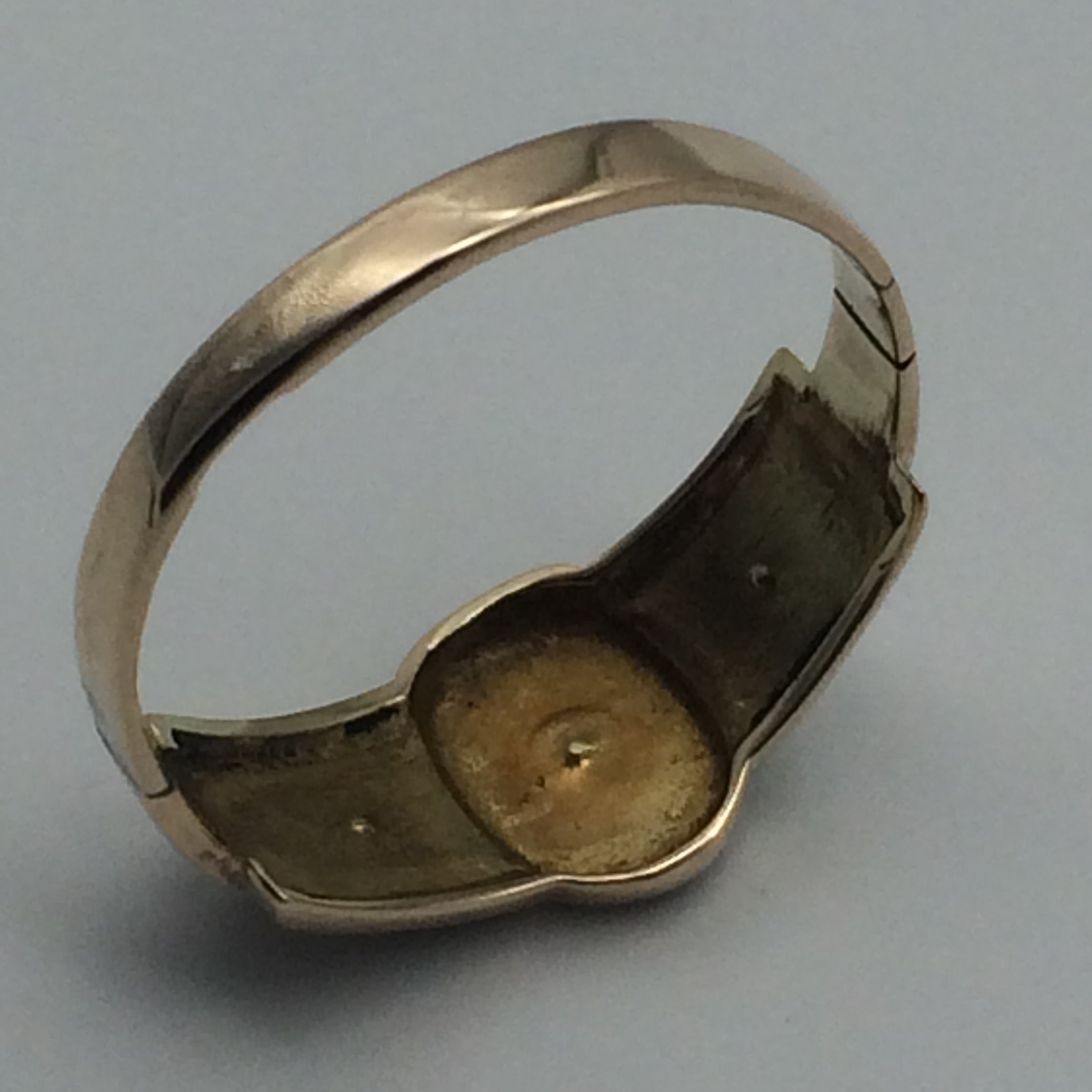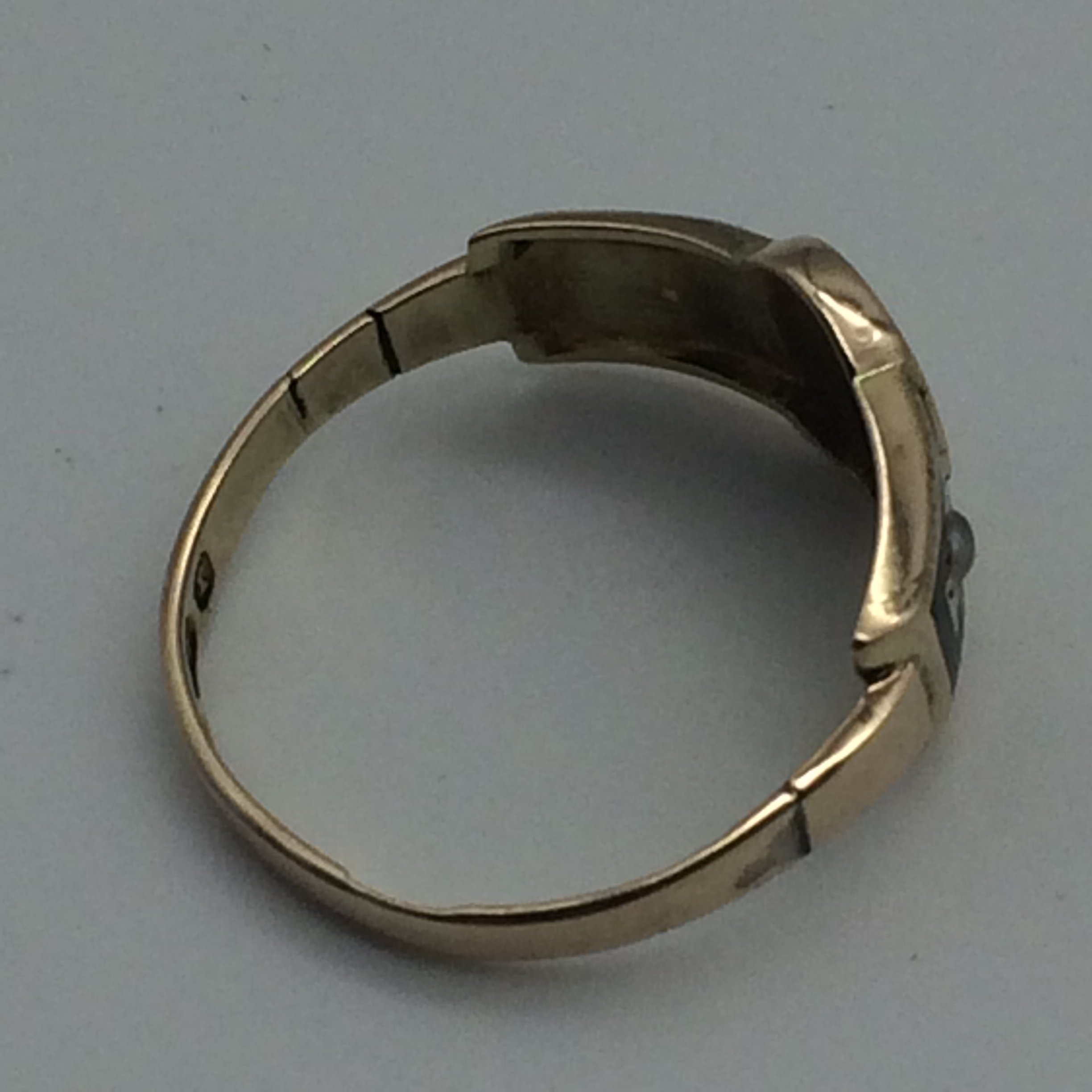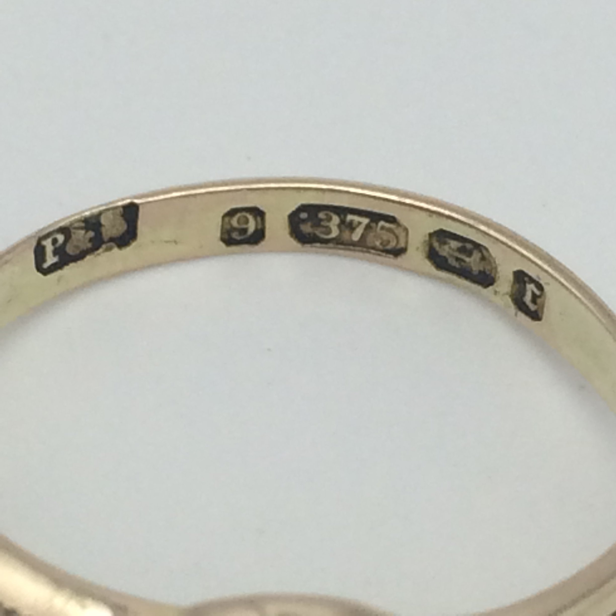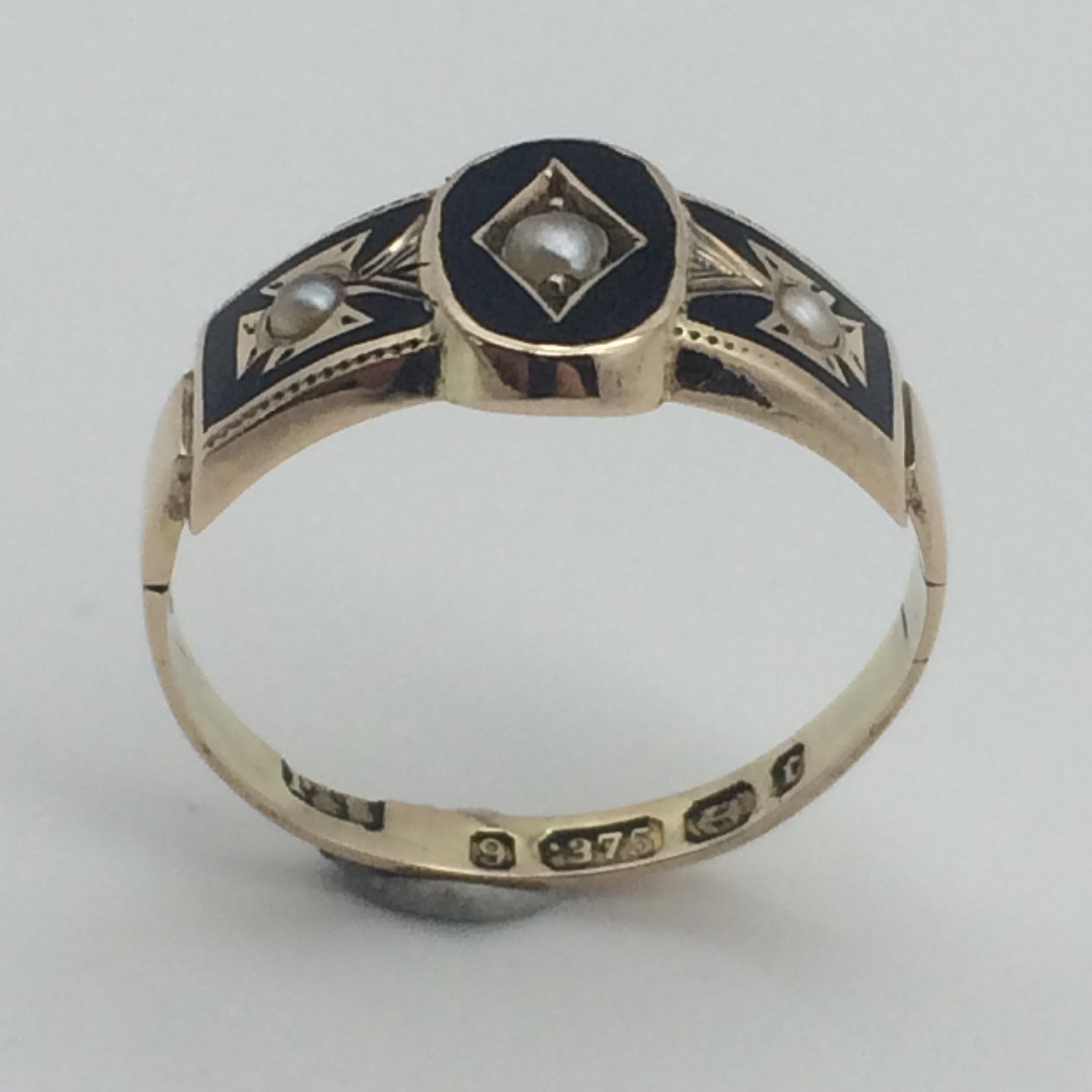 This wonderful, rose gold, antique mourning ring is English hallmarked for Birmingham 1891, stamped ‘9’ ‘.375’ for 9ct gold, with a maker’s mark ‘P & S’. The ring is set with 3 seed pearls that are surrounded by black enamel. There is a mark on either side of the shank, probably due to an old sizing, other than that its in excellent condition.