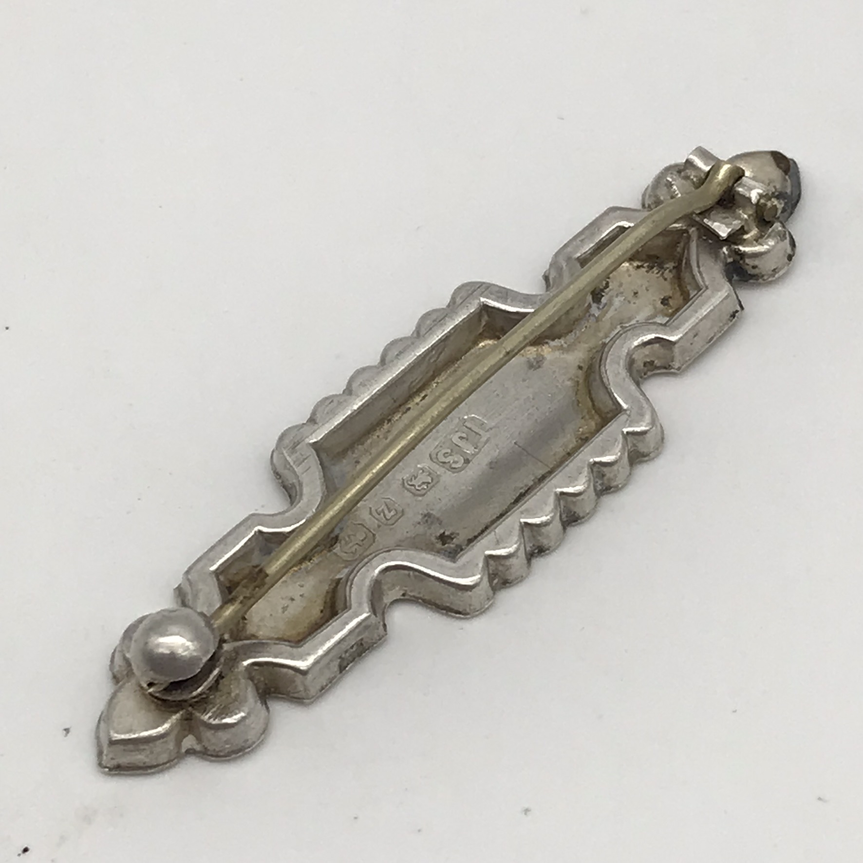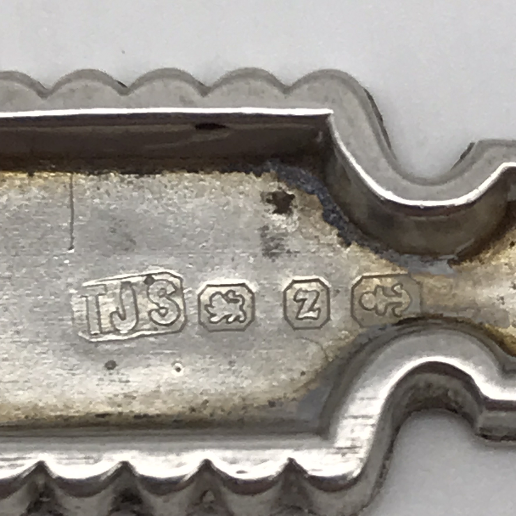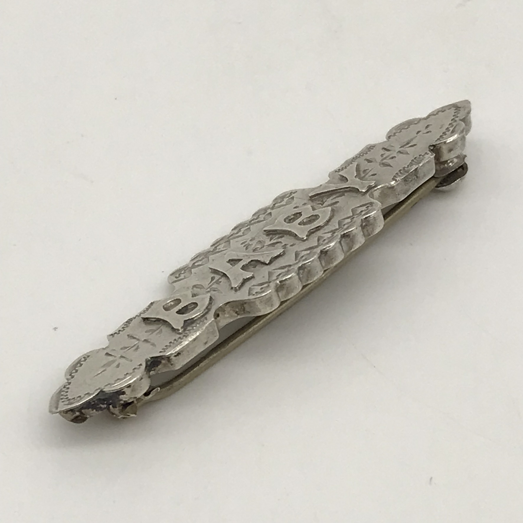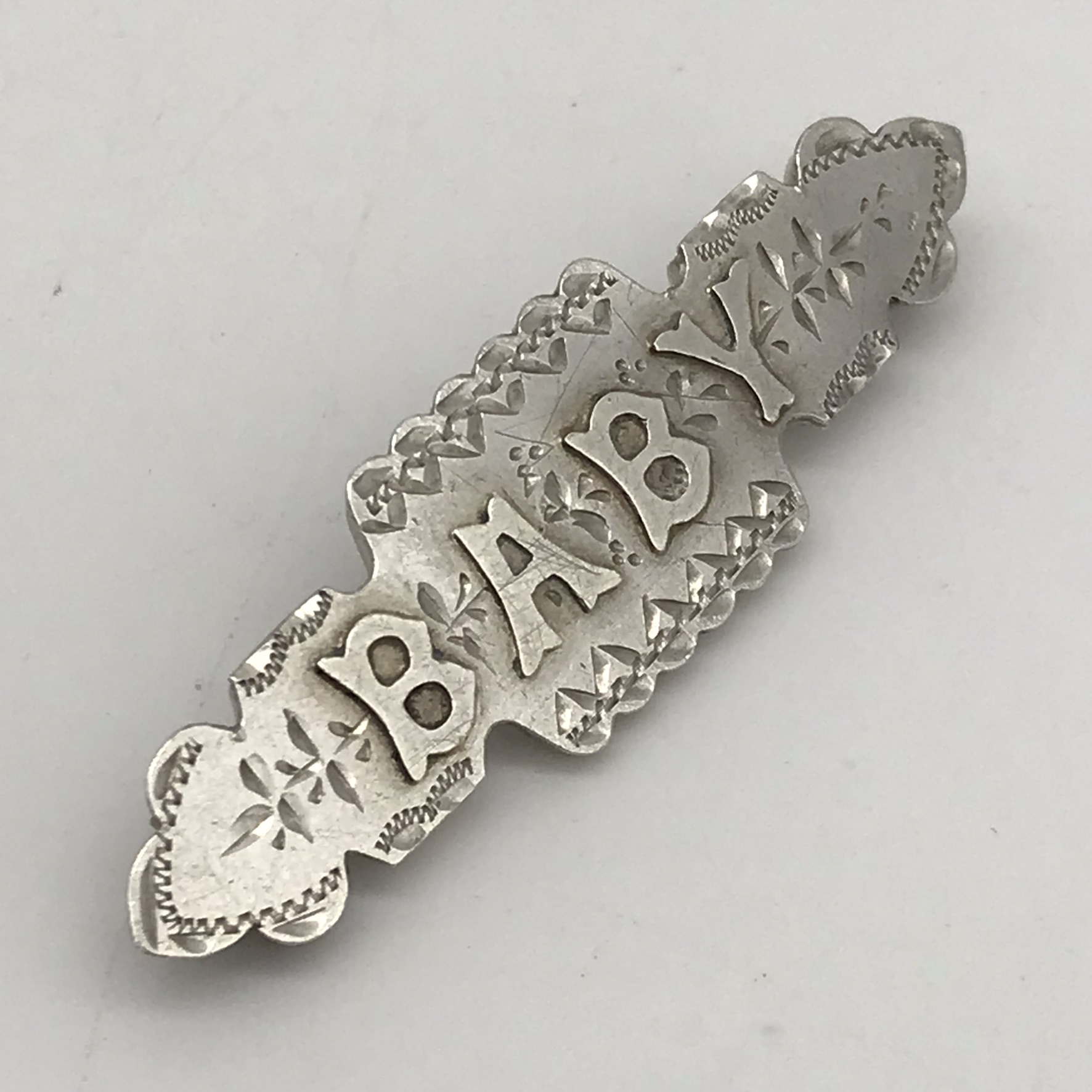 This cute, Victorian sterling silver christening brooch has an unusual oval shape with ‘BABY’ in raised letters in the middle, and pretty engraving in between the letters and around the edge. It is English hallmarked on the back, informing us that it was made in Birmingham in 1899, and stamped ‘TJS’ for the makers ‘Thomas James Skelton’. This cute brooch is in excellent condition and measures 50mm x 14mm.