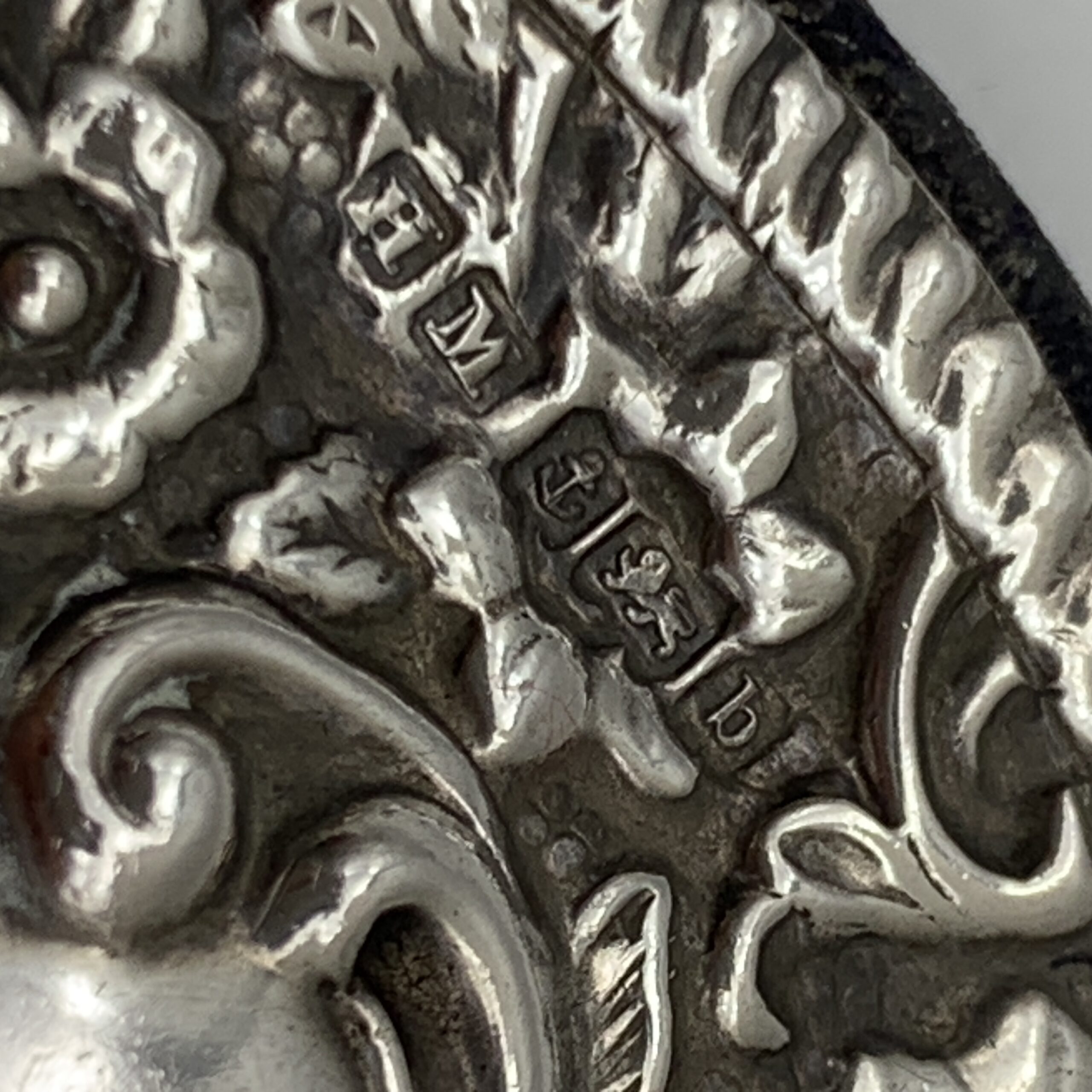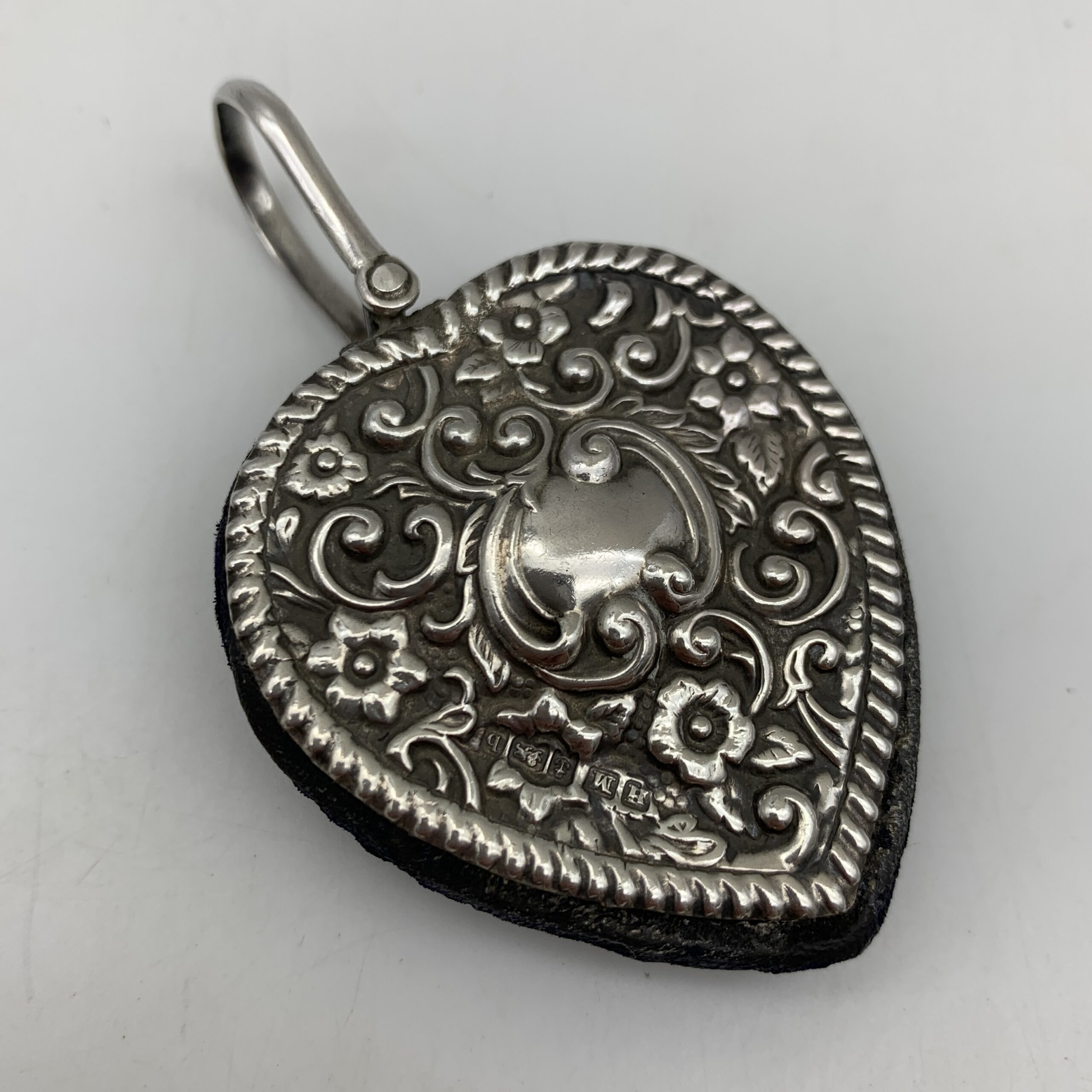 This charming, antique, sterling silver, heart shaped repousse pin cushion with a suspension loop for a chatelaine was made in Birmingham, England in 1901 by silversmiths ‘Henry Matthews’ (HM). It has its original blue velvet cushion sandwiched between two attractive silver panels with floral and scroll decoration, with a clear cartouche on both sides. This lovely piece is in excellent condition with clear hallmarks and would have originally been one of the numerous accessories a lady would attach to her chatelaine. It measures 4,3cm x 5cm (7cm with loop), and weighs 18g.