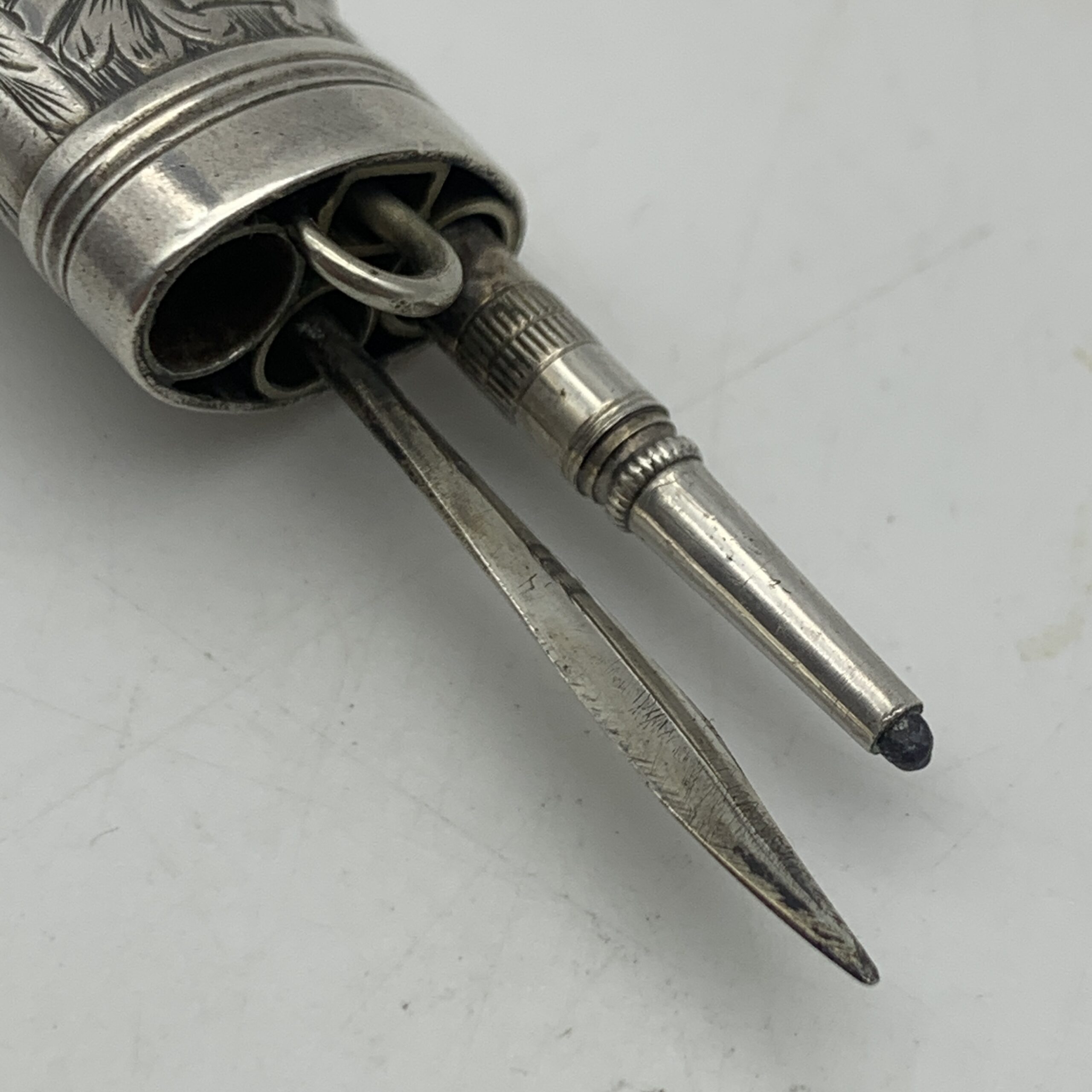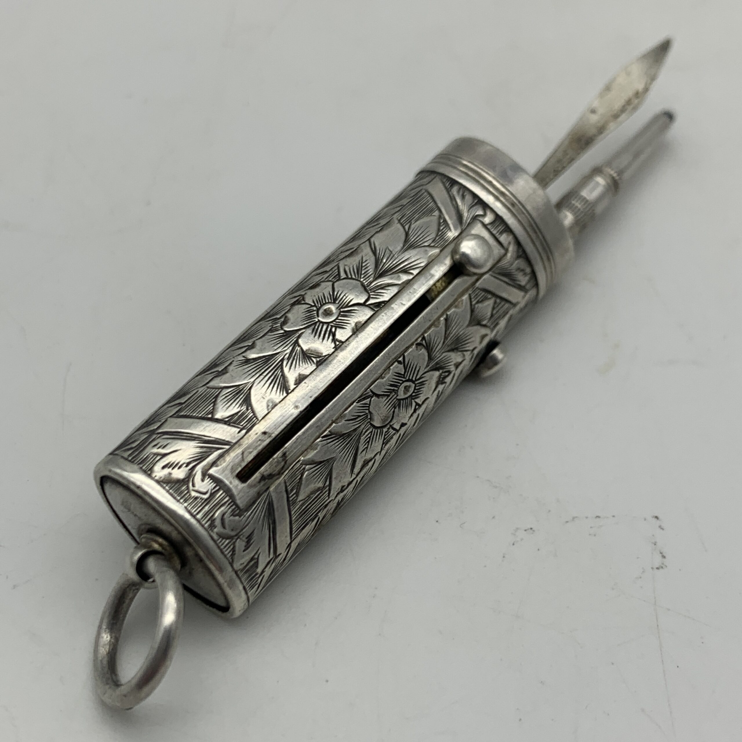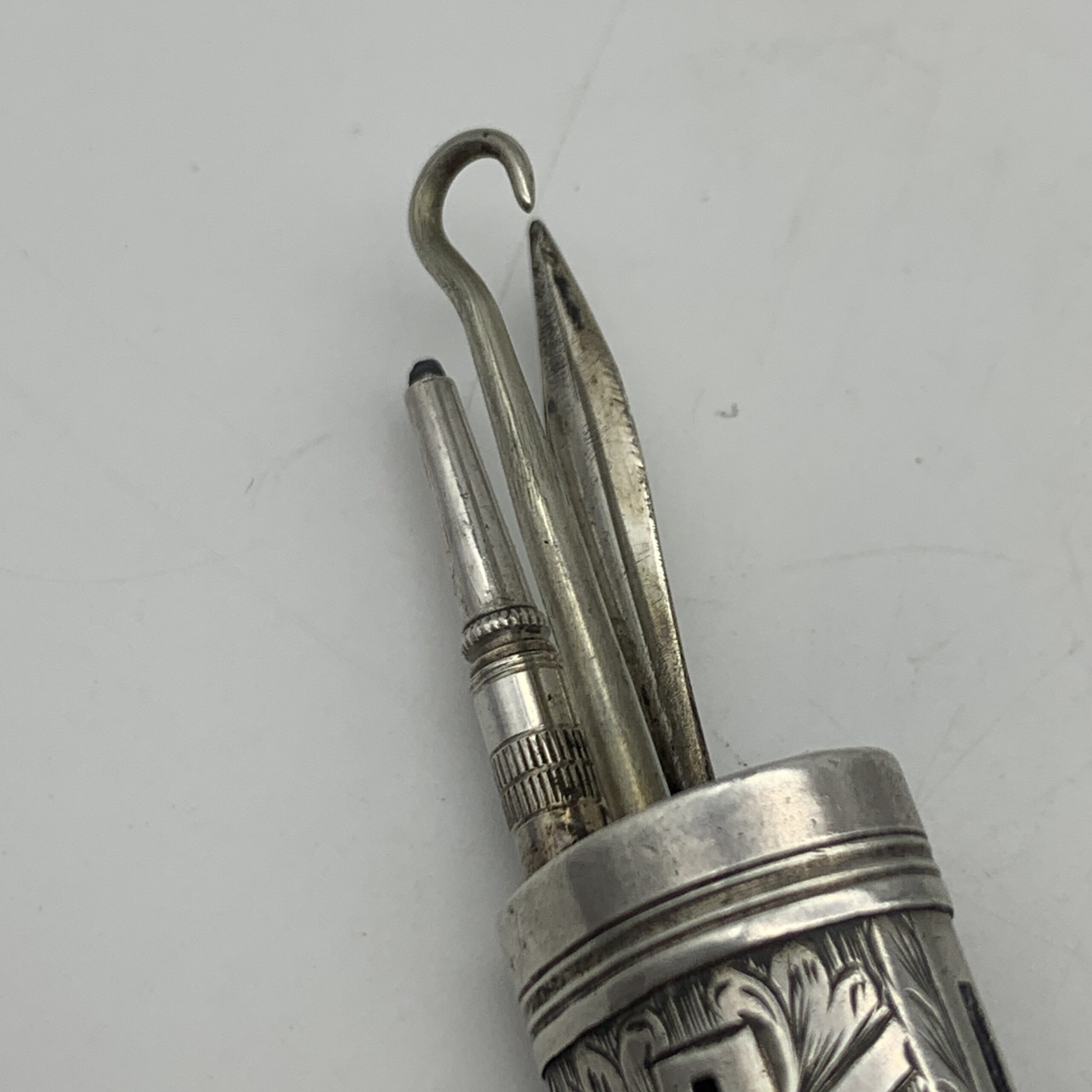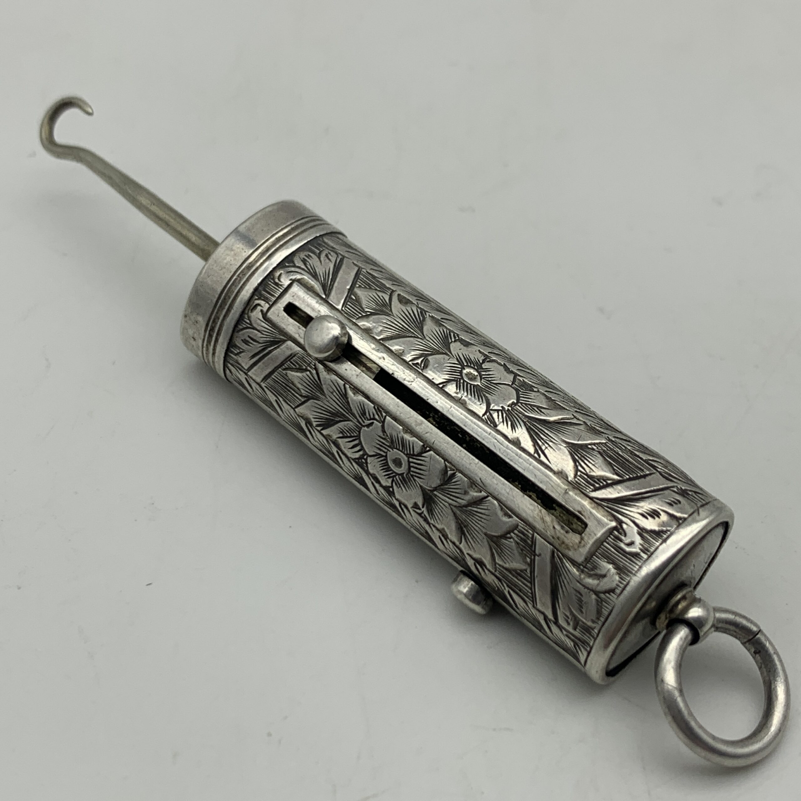 This charming, Victorian, sterling silver combination, chatelaine accessory features a small propelling pencil, a toothpick and a button hook, exposed by sliding down three small buttons. The case is finely engraved with lovely floral detail and is fitted with a suspension loop to attach to a chatelaine. Sadly, it appears the accessory is missing one small ‘tool’, otherwise it’s in excellent condition and functions well. This scarce collectable piece would have originally been one of the numerous accessories a lady would attach to her chatelaine, which in turn would hang on her waist belt. There are no identifying hallmarks on this, but it has been confirmed sterling silver. It measures 4,5cm in length (7cm extended) x 1,5cm and weighs 18g.