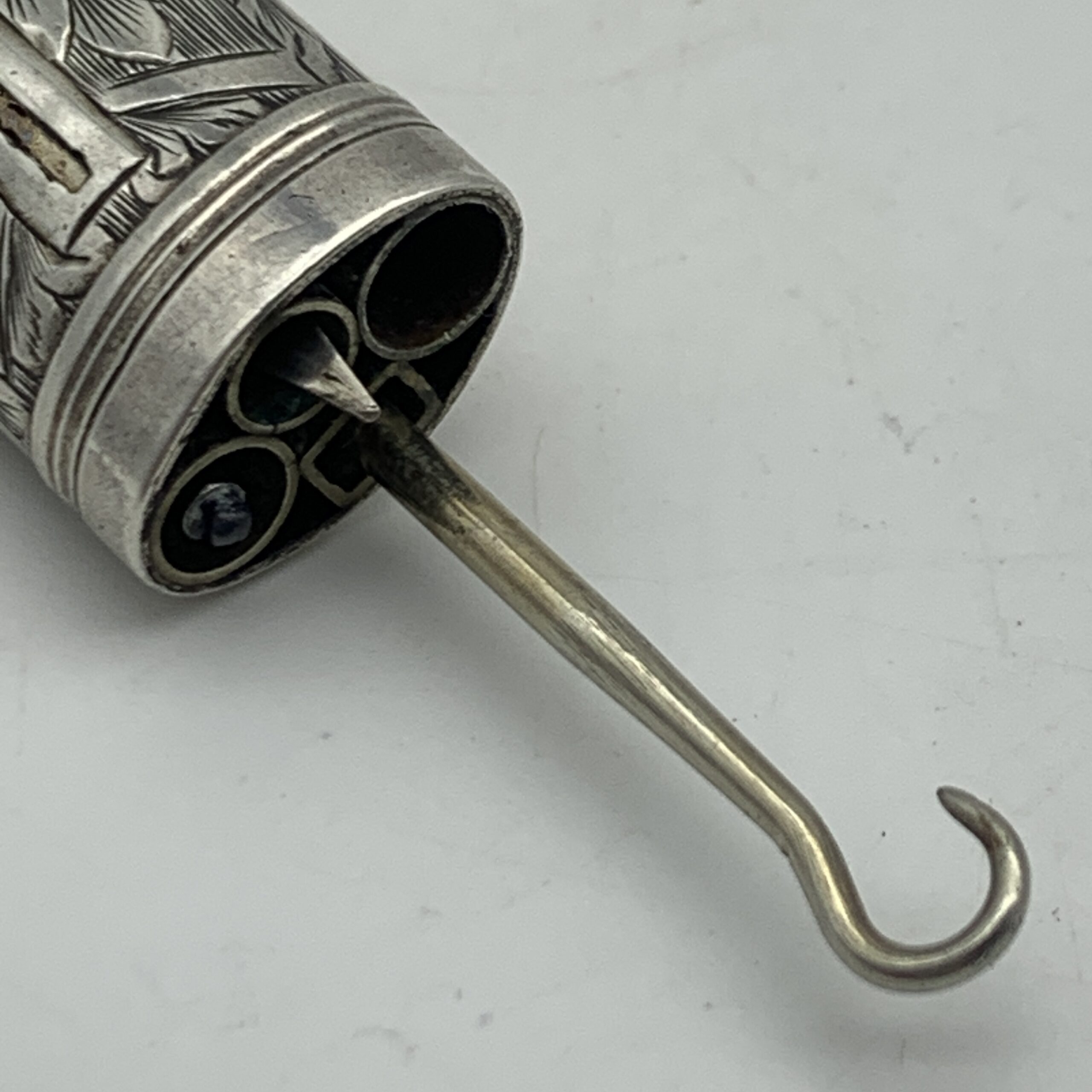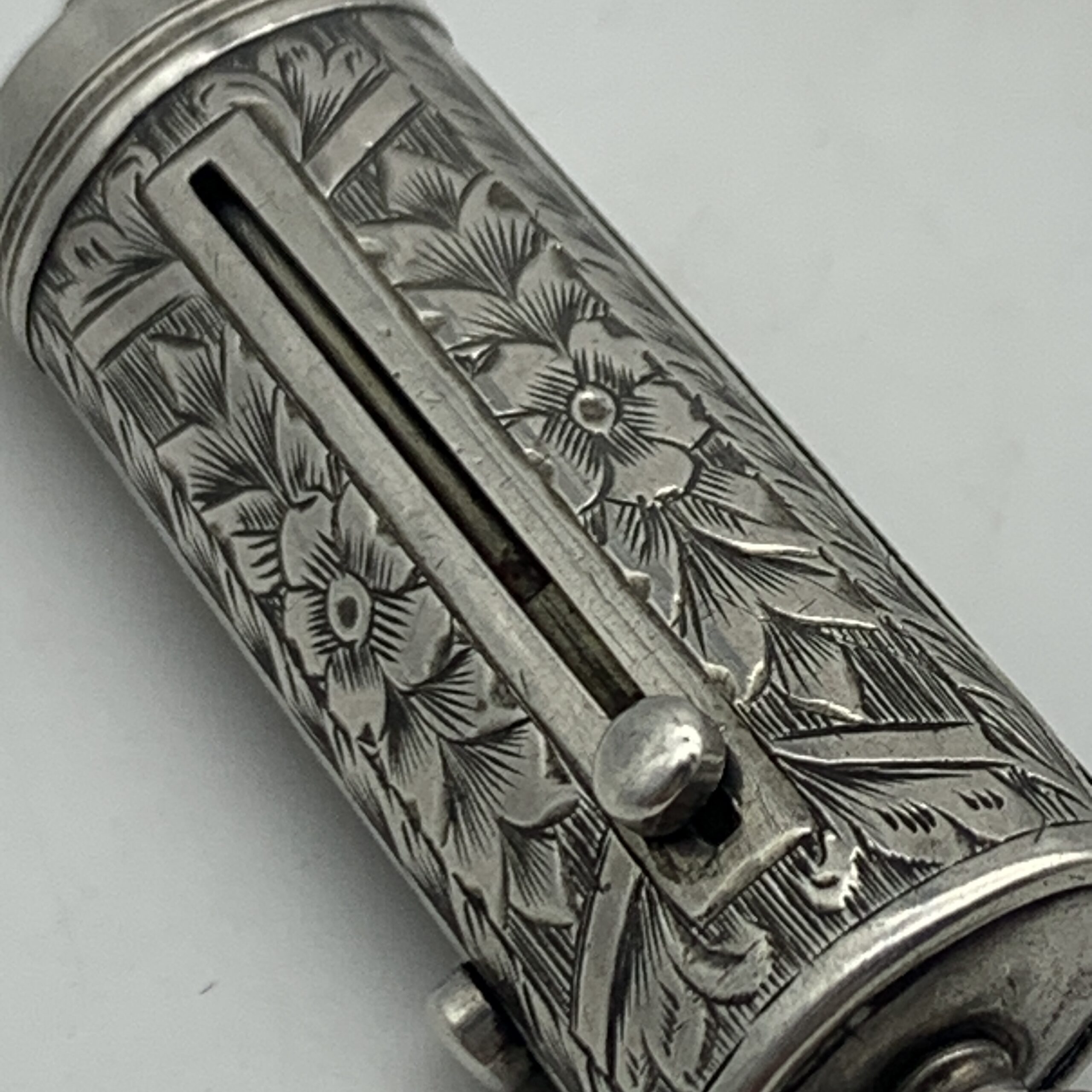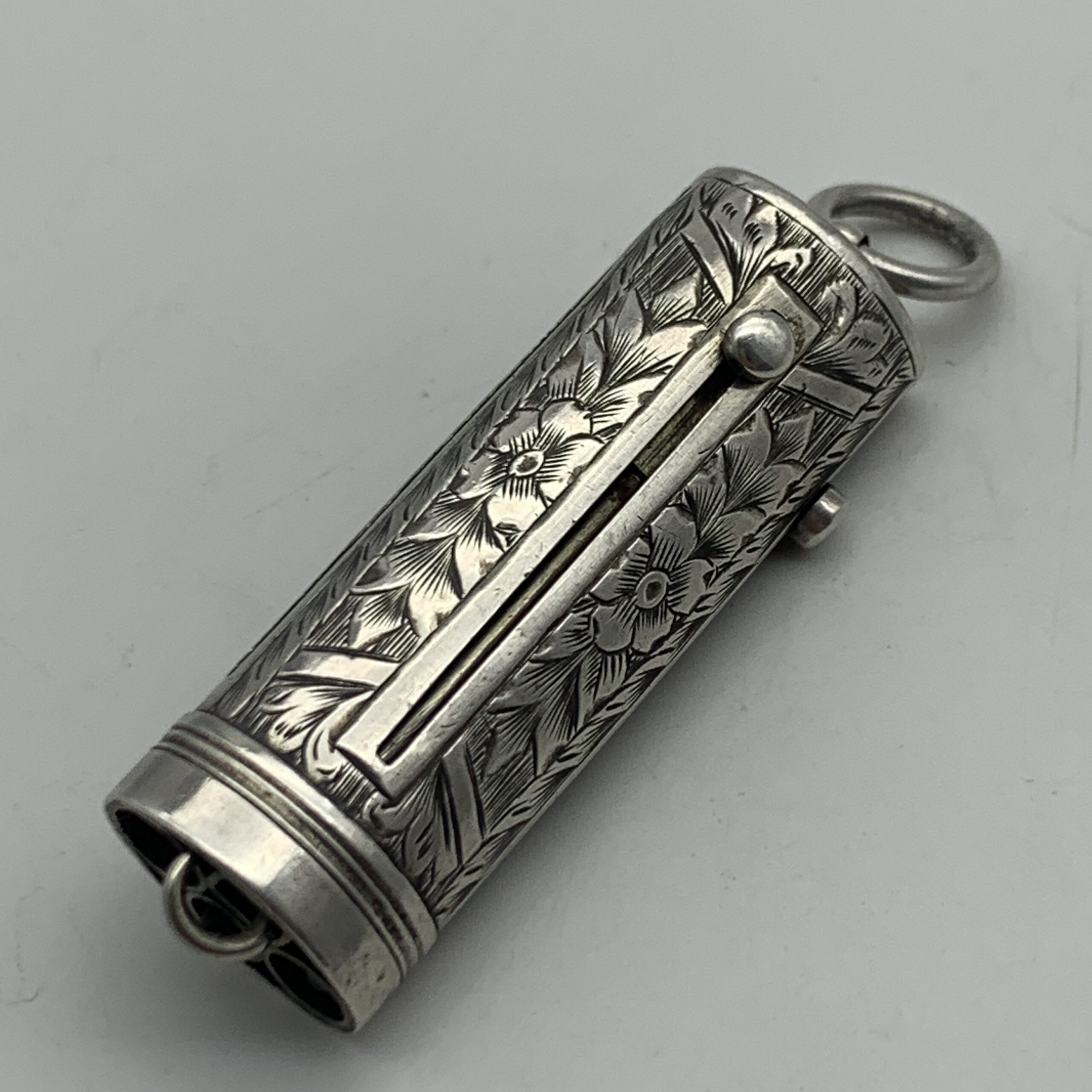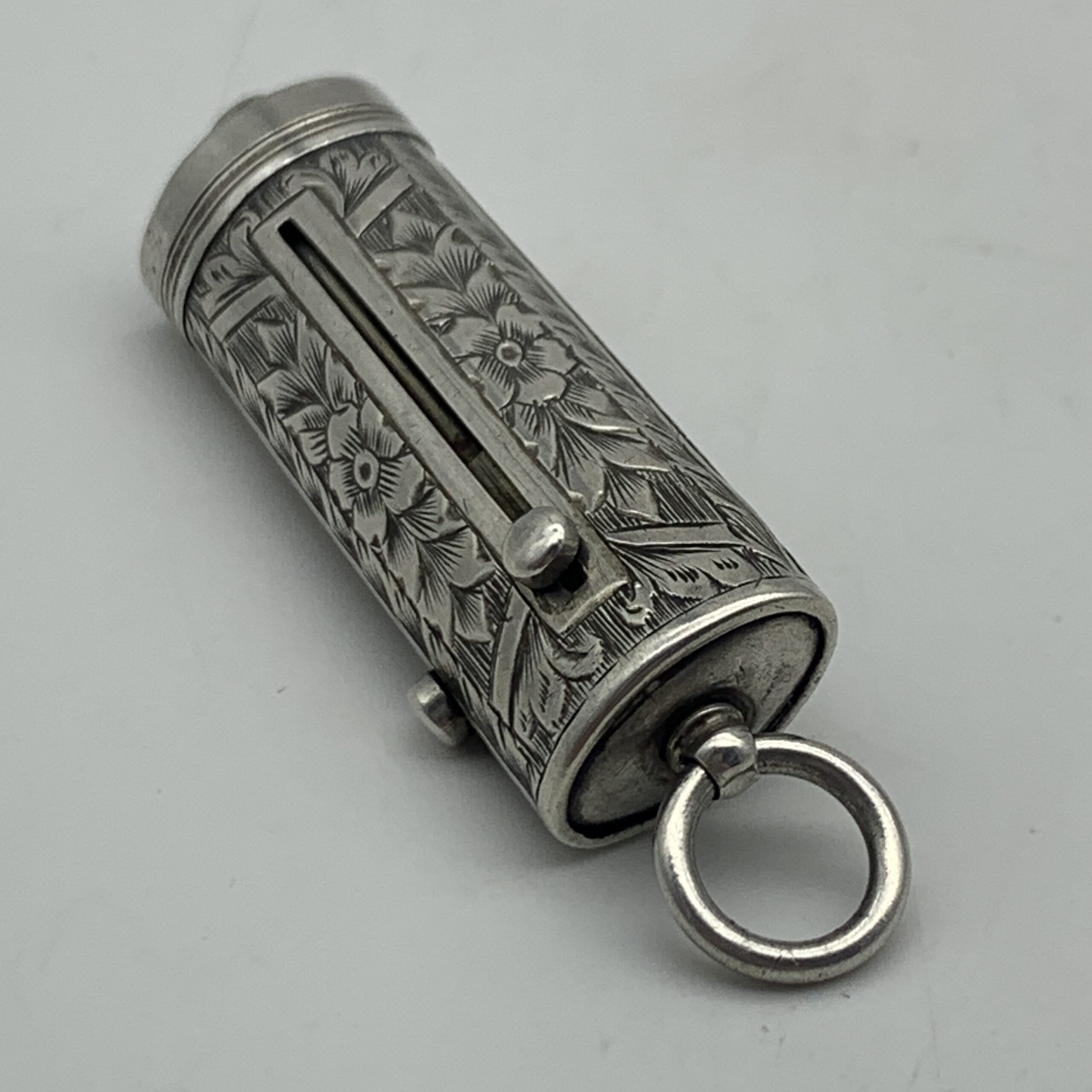 This charming, Victorian, sterling silver combination, chatelaine accessory features a small propelling pencil, a toothpick and a button hook, exposed by sliding down three small buttons. The case is finely engraved with lovely floral detail and is fitted with a suspension loop to attach to a chatelaine. Sadly, it appears the accessory is missing one small ‘tool’, otherwise it’s in excellent condition and functions well. This scarce collectable piece would have originally been one of the numerous accessories a lady would attach to her chatelaine, which in turn would hang on her waist belt. There are no identifying hallmarks on this, but it has been confirmed sterling silver. It measures 4,5cm in length (7cm extended) x 1,5cm and weighs 18g.