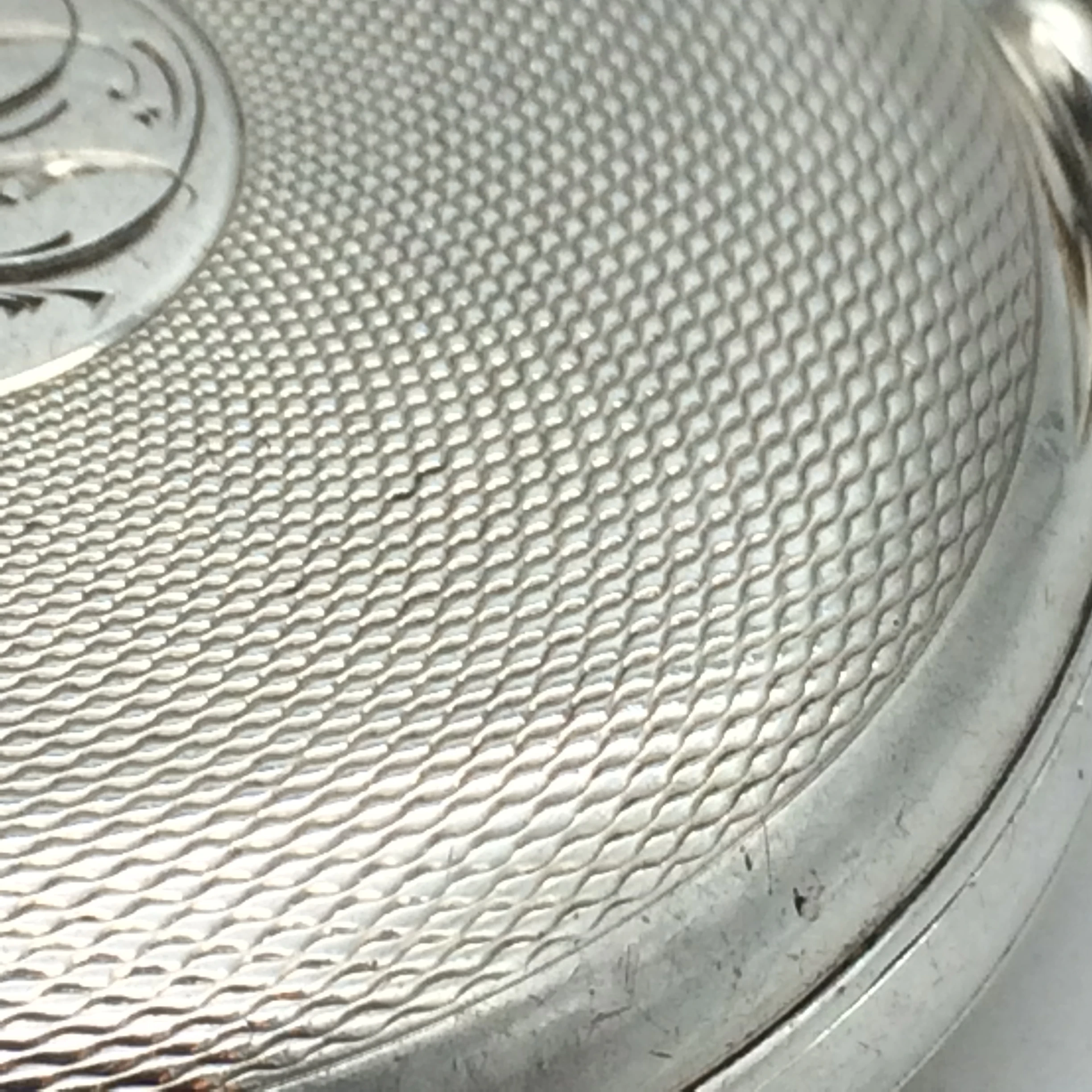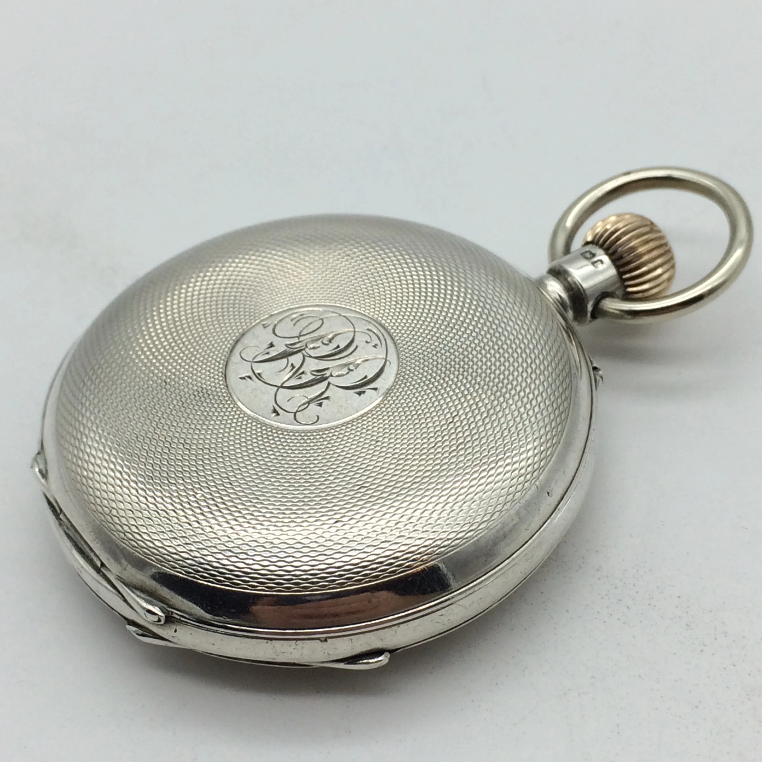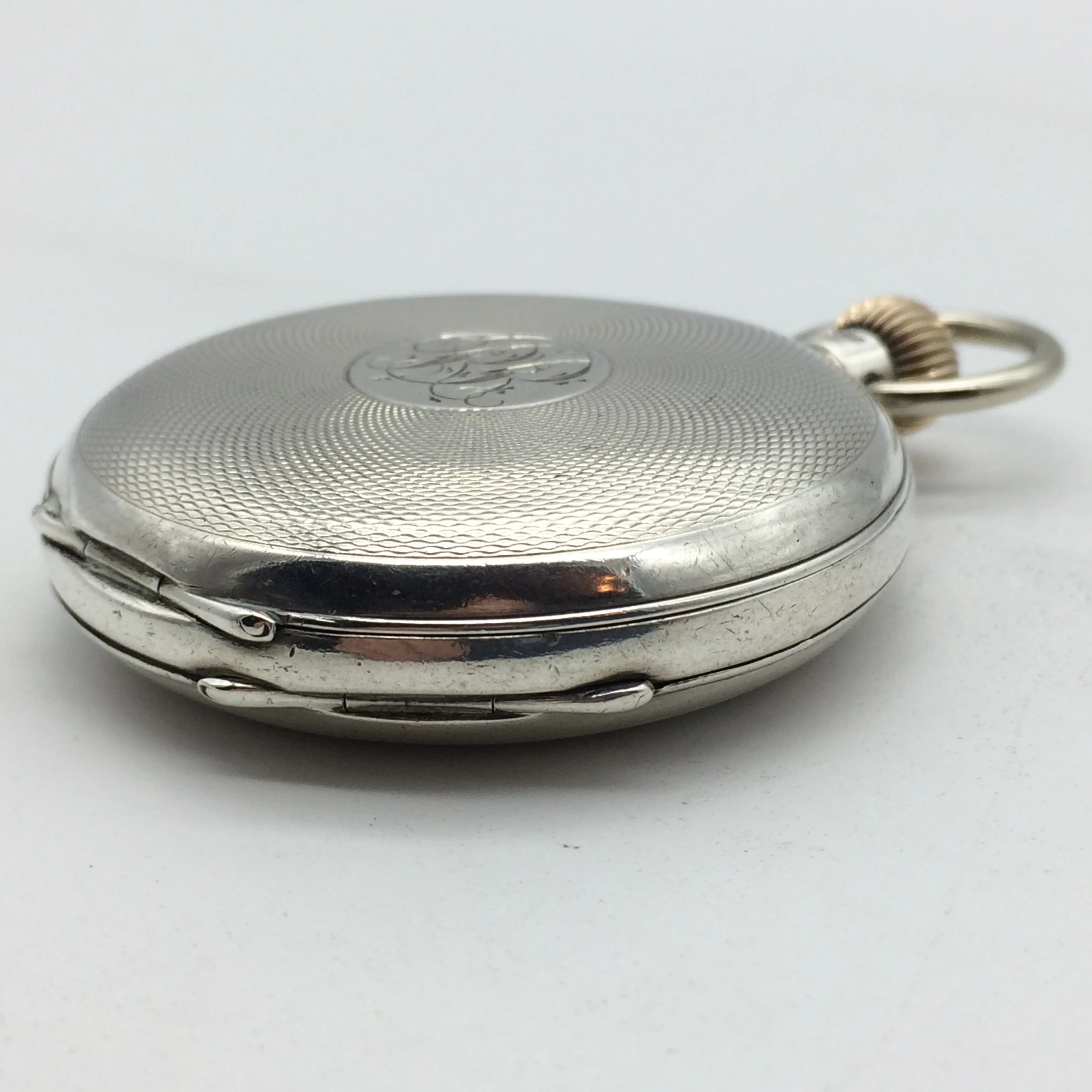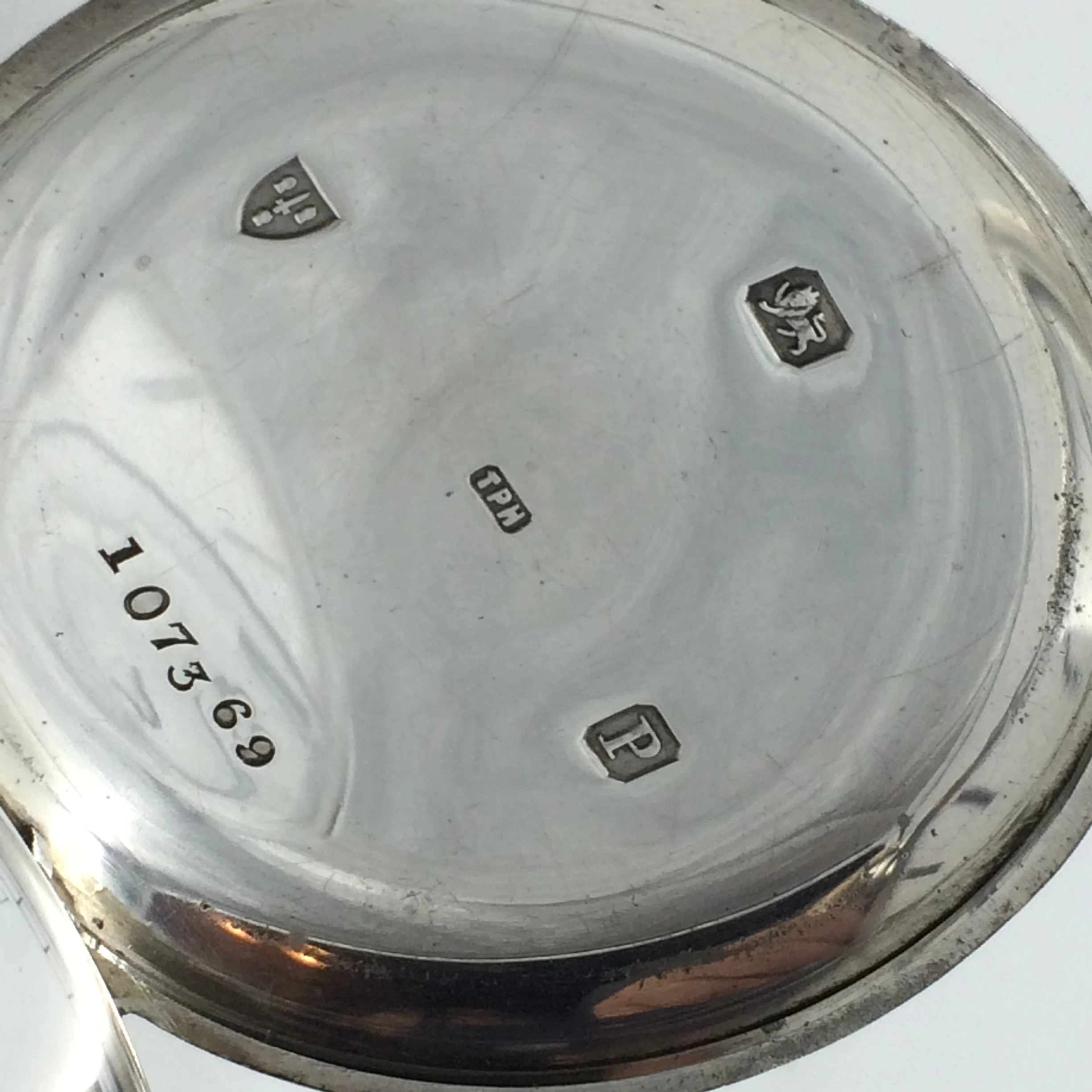 This fabulous, solid silver, working antique pocket watch was manufactured in 1898 by ‘Thomas Peter Hewitt (T.P.H.) from ‘The Lancashire Watch Company (L.W.C.). This full hunter pocket watch has a perfect white enamel dial with bold black roman numerals, with a second-hand dial. The case is in great condition with engine turned detail and an engraved cartouche on the front. The front, back and movement dust cover are all English hallmarked for Chester 1889 and stamped with a case number ‘107369’ and ‘TPH’ for ‘Thomas Peter Hewitt.’ The movement is working well and is stamped with the number ‘167886.’ It measures 4.8cm in diameter (6.1cm with the winder) and weighs 110.3g.