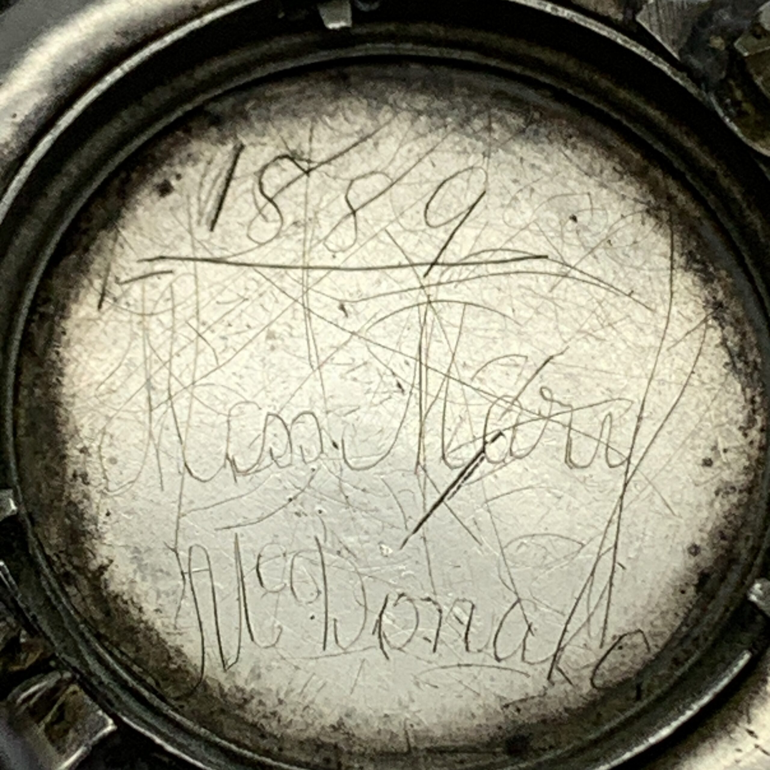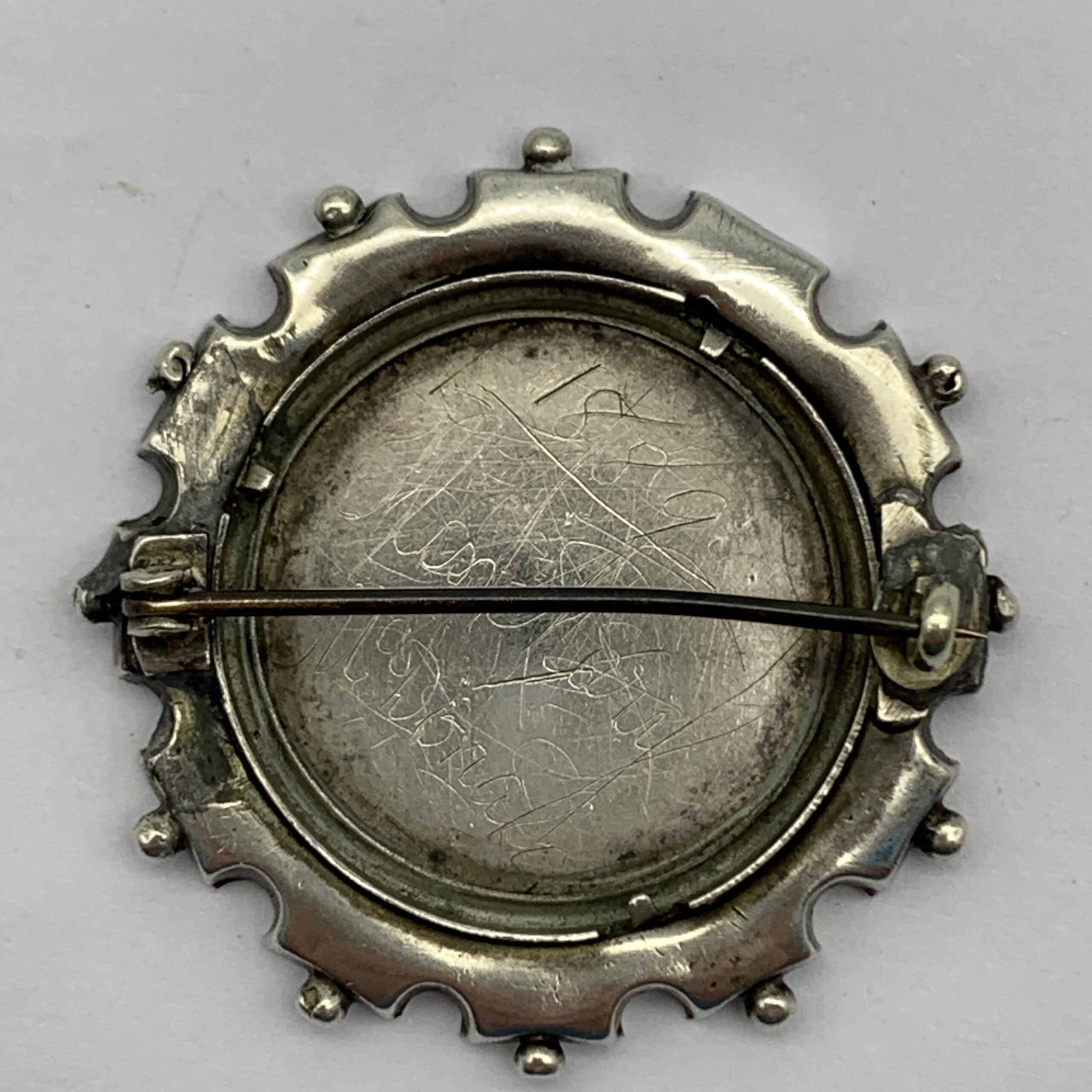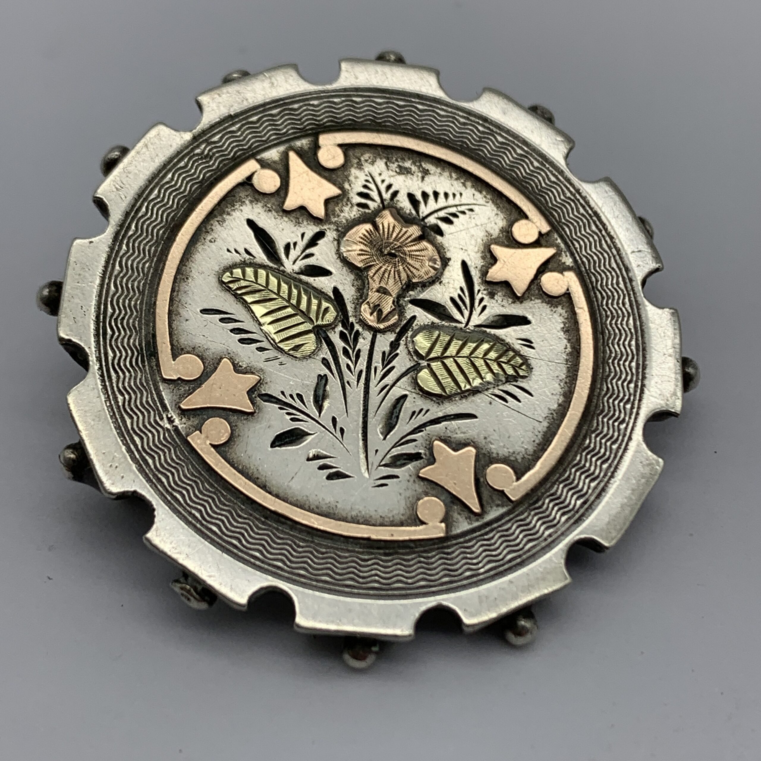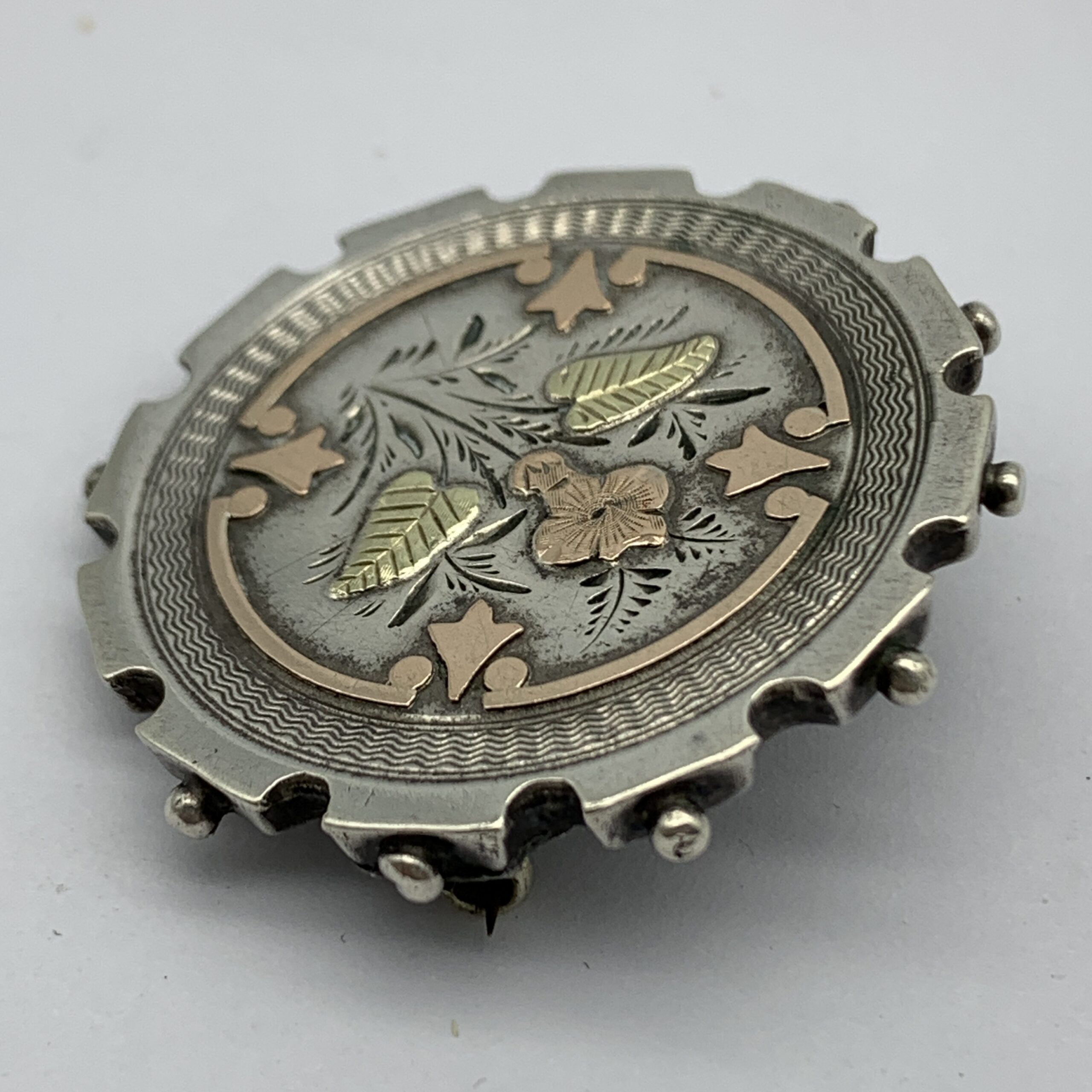This lovely quality, antique, sterling silver, floral sweetheart brooch from the late 1800’s, is beautifully decorated and engraved, featuring a rose-gold fancy border and flower with yellow gold leaves, which is bordered by a wide, circular, engine turned engraving with a beaded edge. There’s a personnel hand engraved name and date on the back ‘1889 Miss. Mary McDonald’, who was probably the original owner. This fabulous brooch is in great condition with a secure pin and measures 3,6cm in diameter, with a weight of 6g.