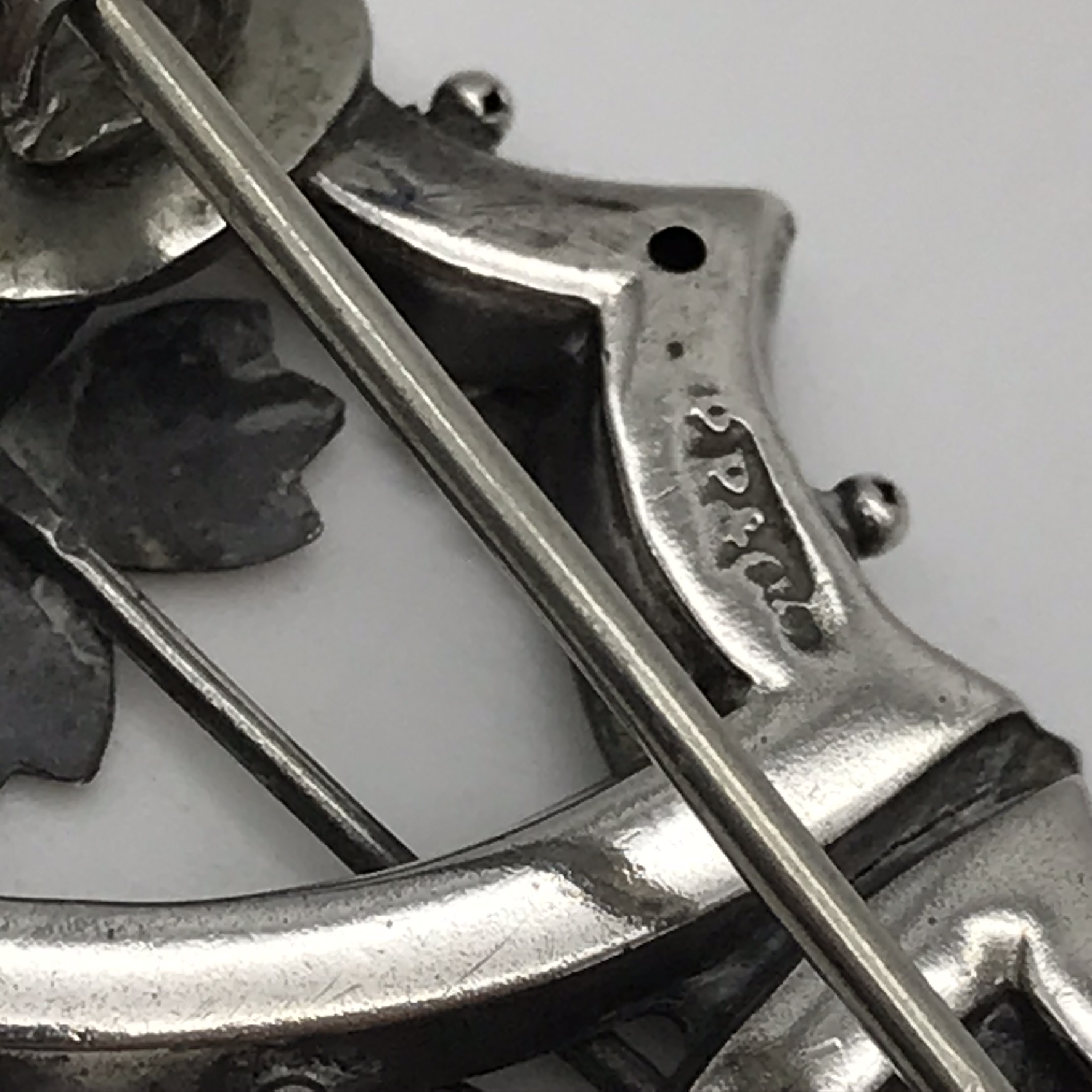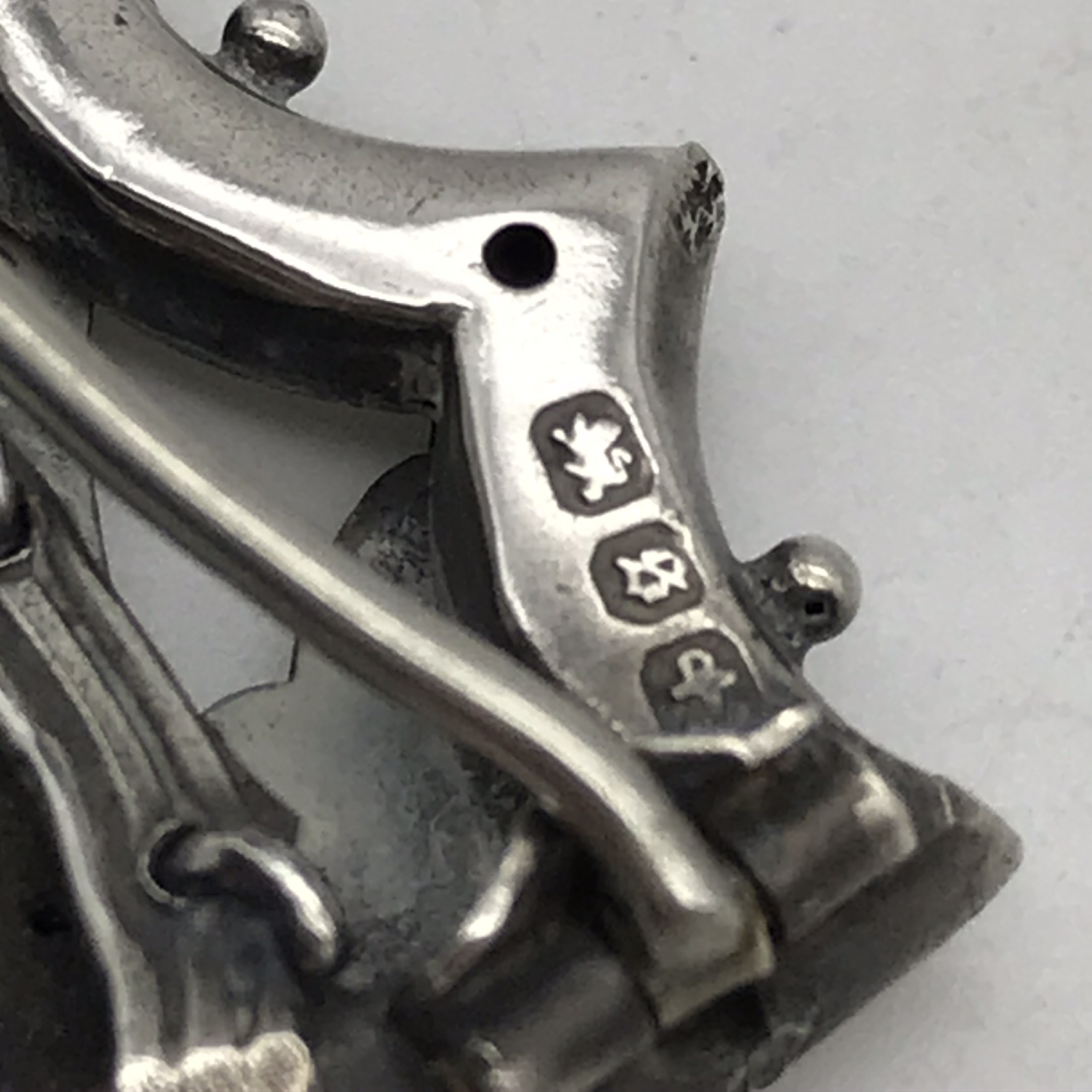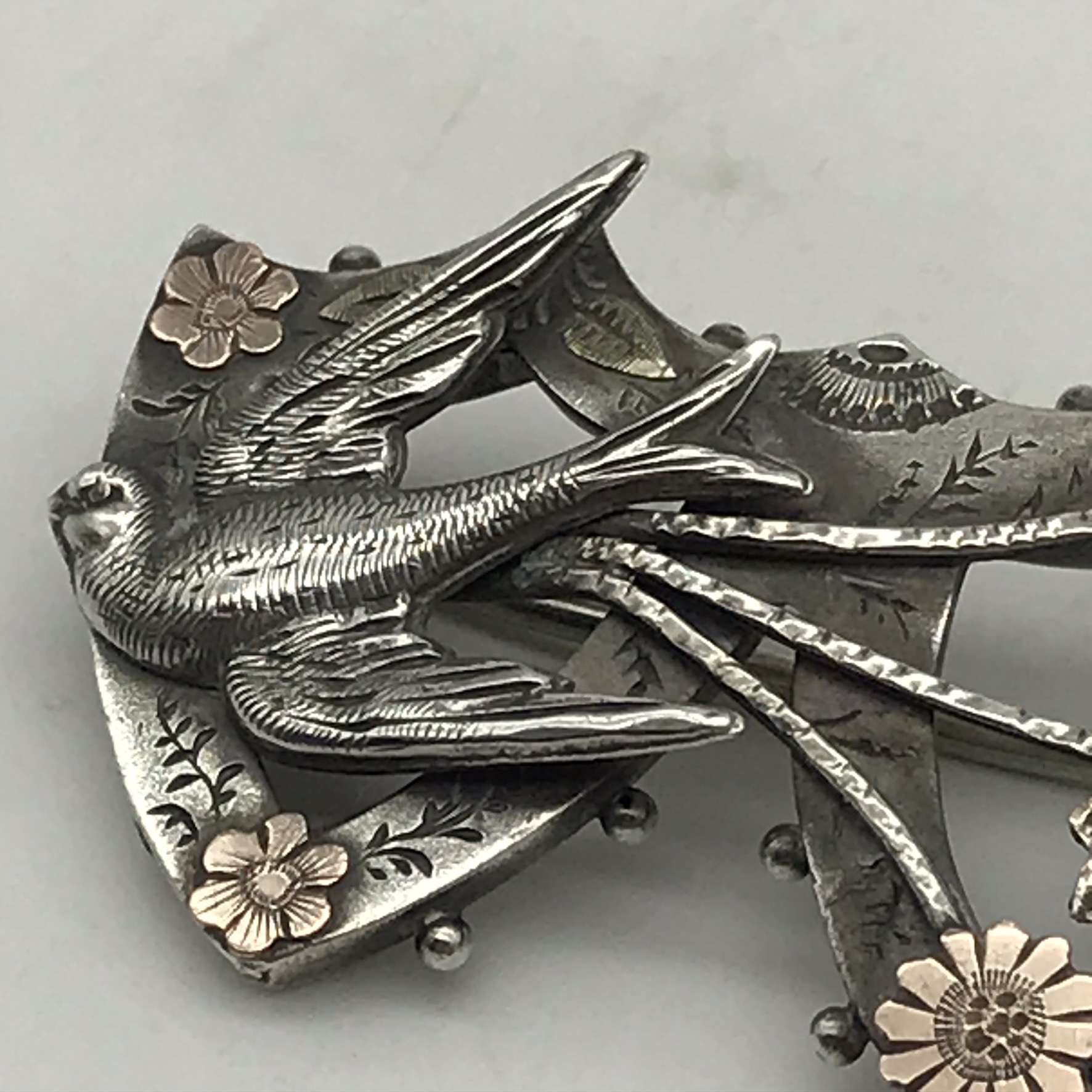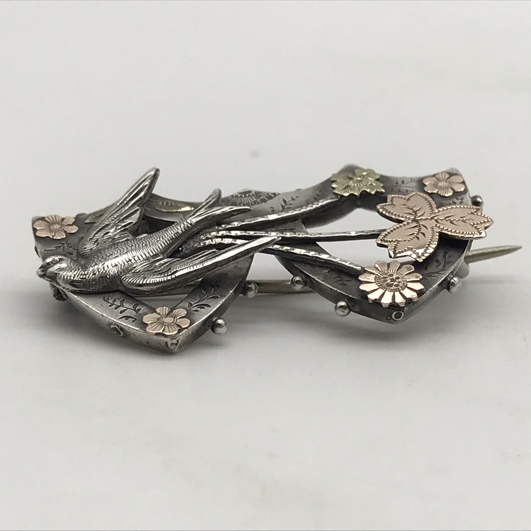 This fabulous, very attractive, English hallmarked, antique, silver sweetheart brooch with rose gold petals, has been beautifully made with wonderful detail and fine engraving. It’s in the shape of two joined shields, with a swallow in flight across one and a sprig of flowers across the other with rose gold petals. The brooch was made in Birmingham in 1892 by silversmiths ‘Payton, Pepper & Co’ (PP&Co). It’s in great condition for its age and measures 4cm x 2,5cm.