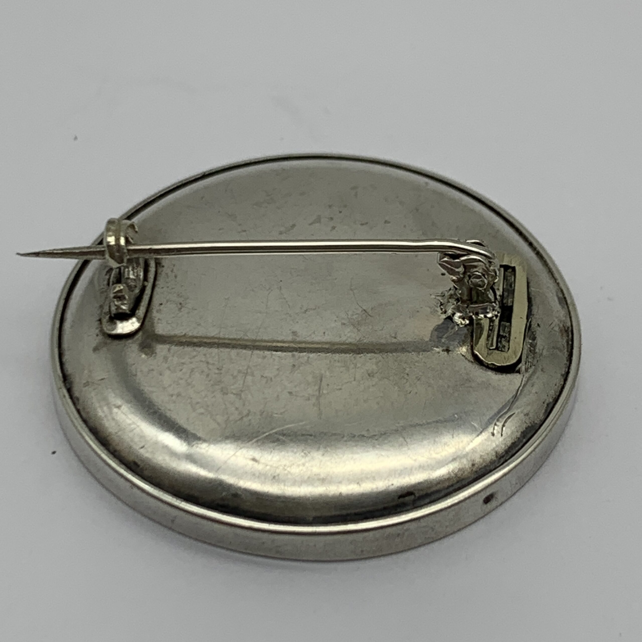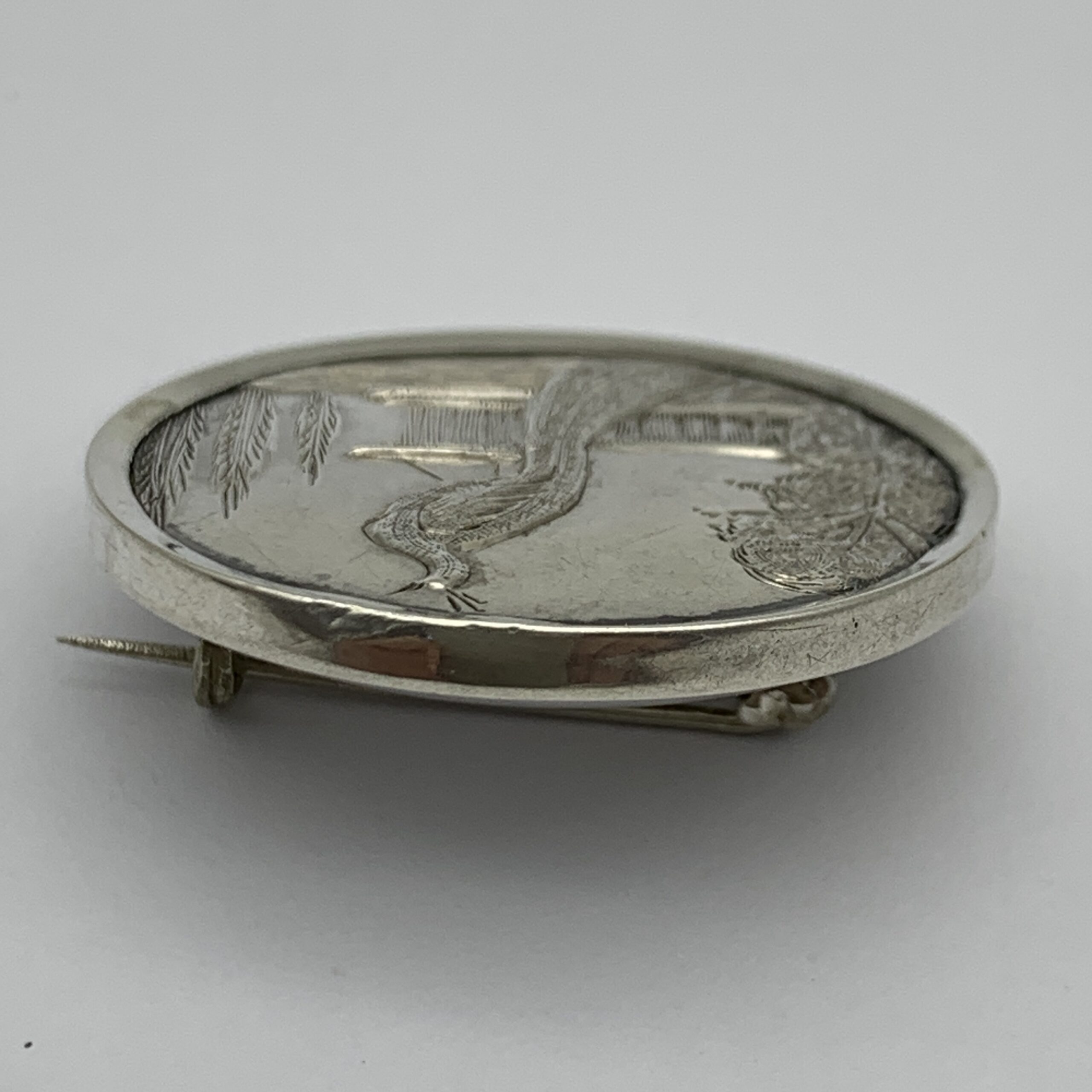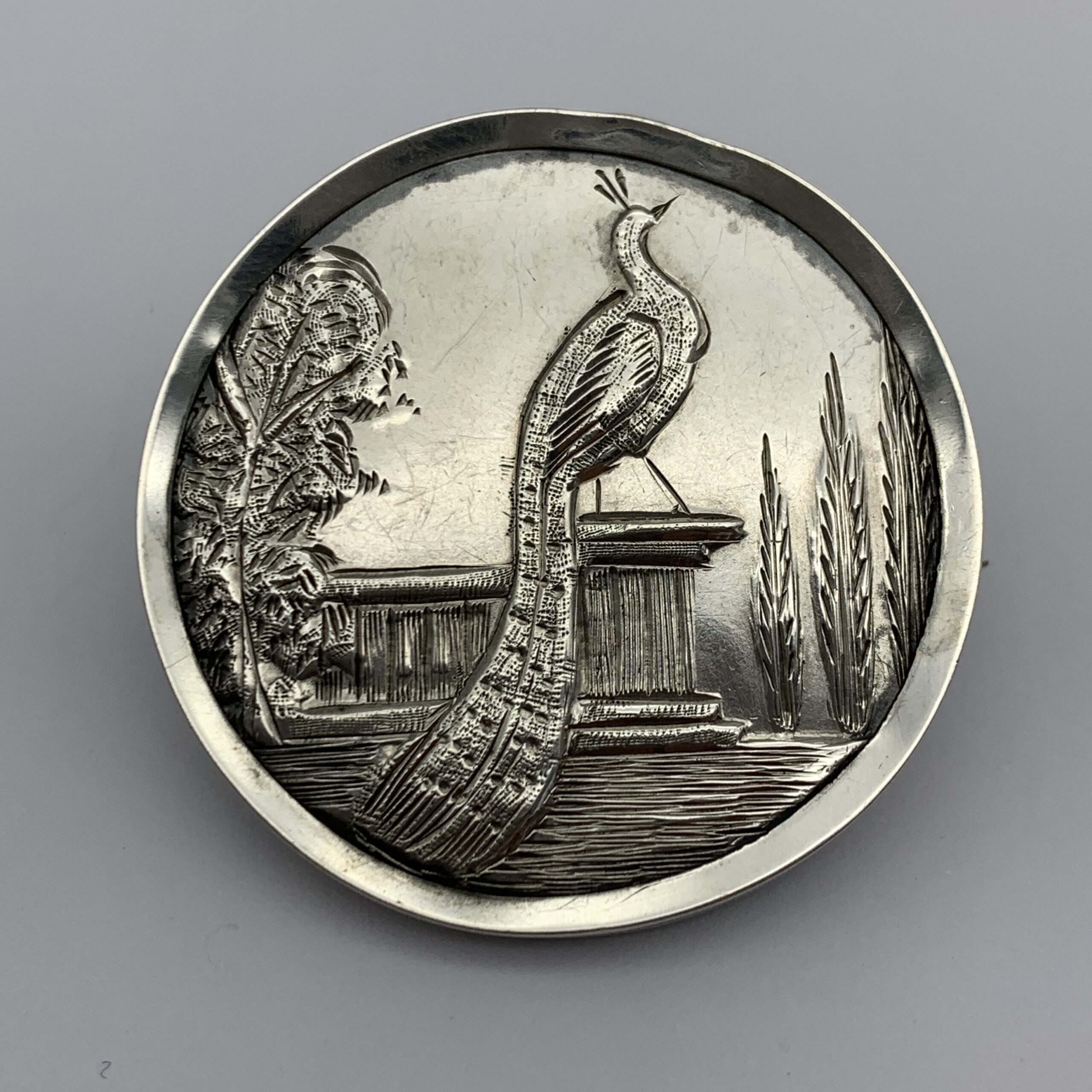 This attractive, round, antique, sterling silver bird brooch from the late 1800’s is a super quality piece with wonderful detail and fine engraving. It features a peacock in relief perched on a plinth between trees and is in excellent condition with a strong pin. There are no markings on the brooch, but it has been confirmed sterling silver and measures 3,3cm in diameter with a weight of 14,2g.
