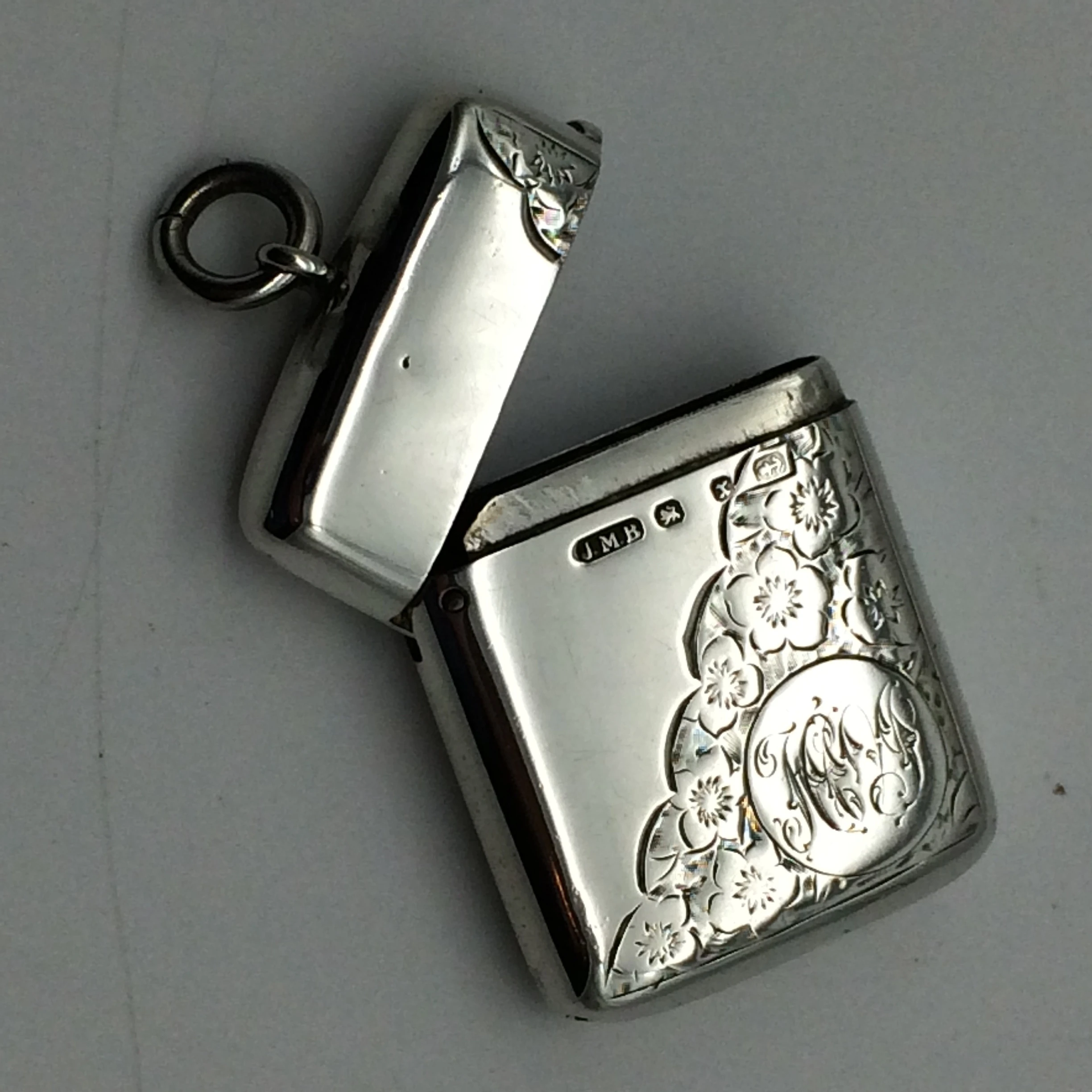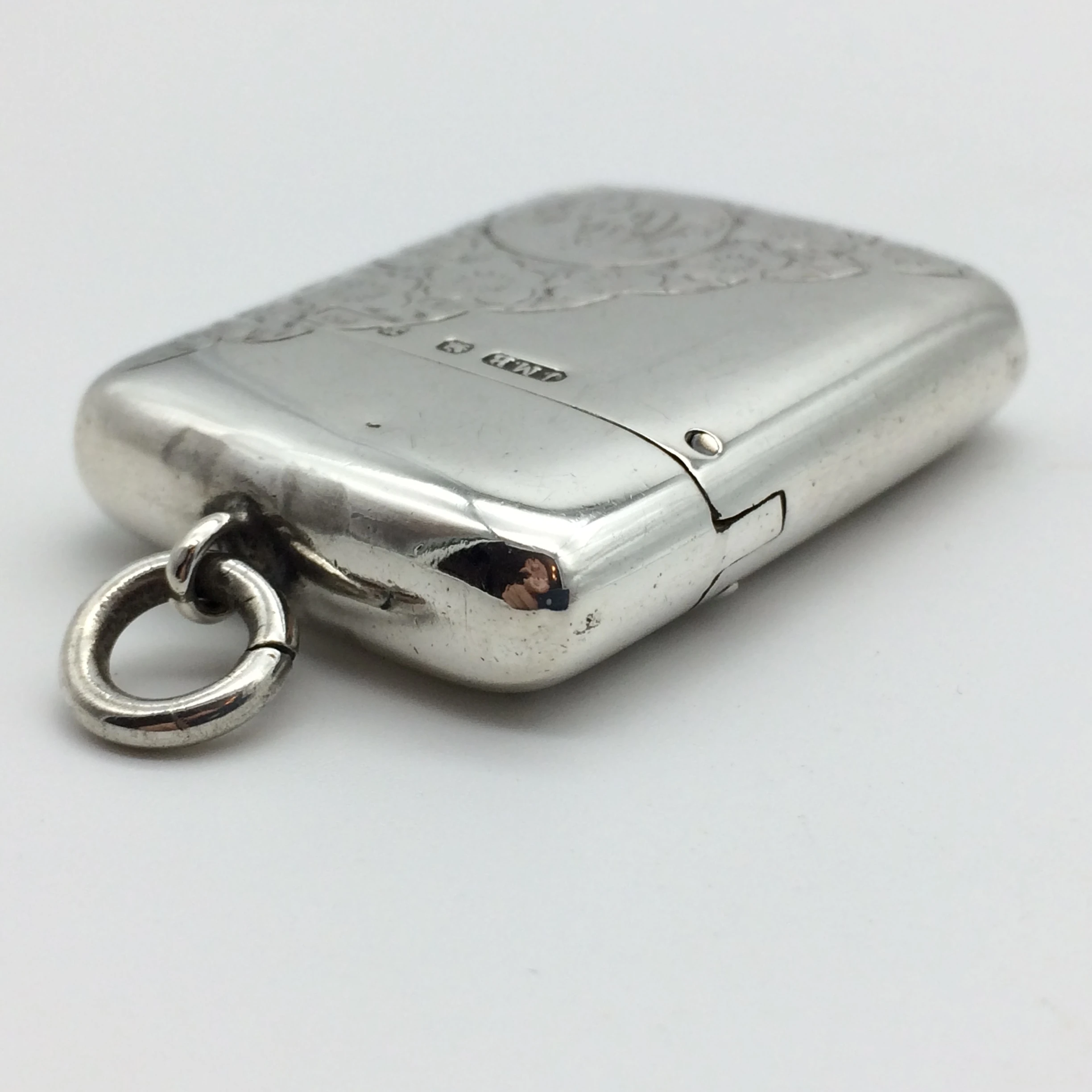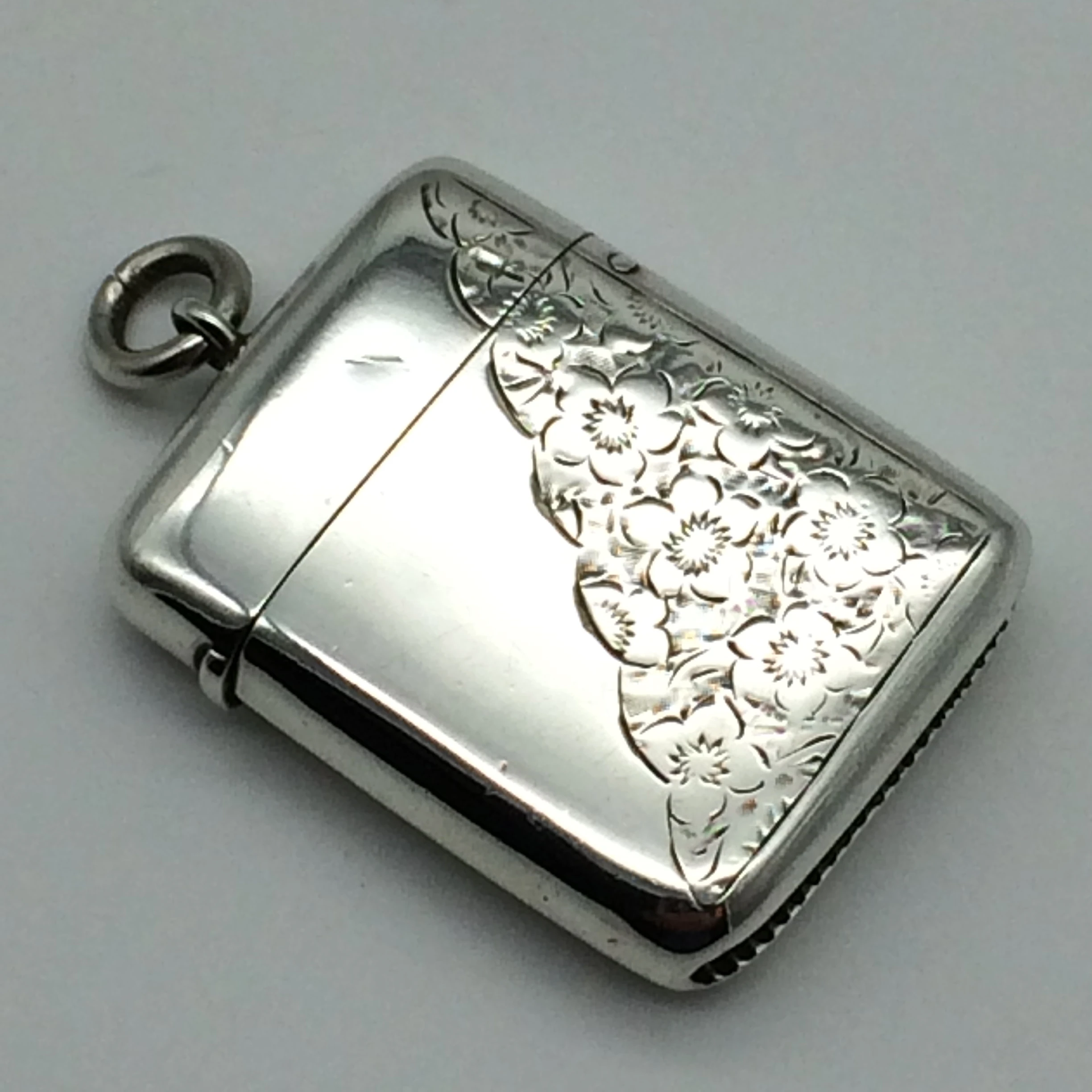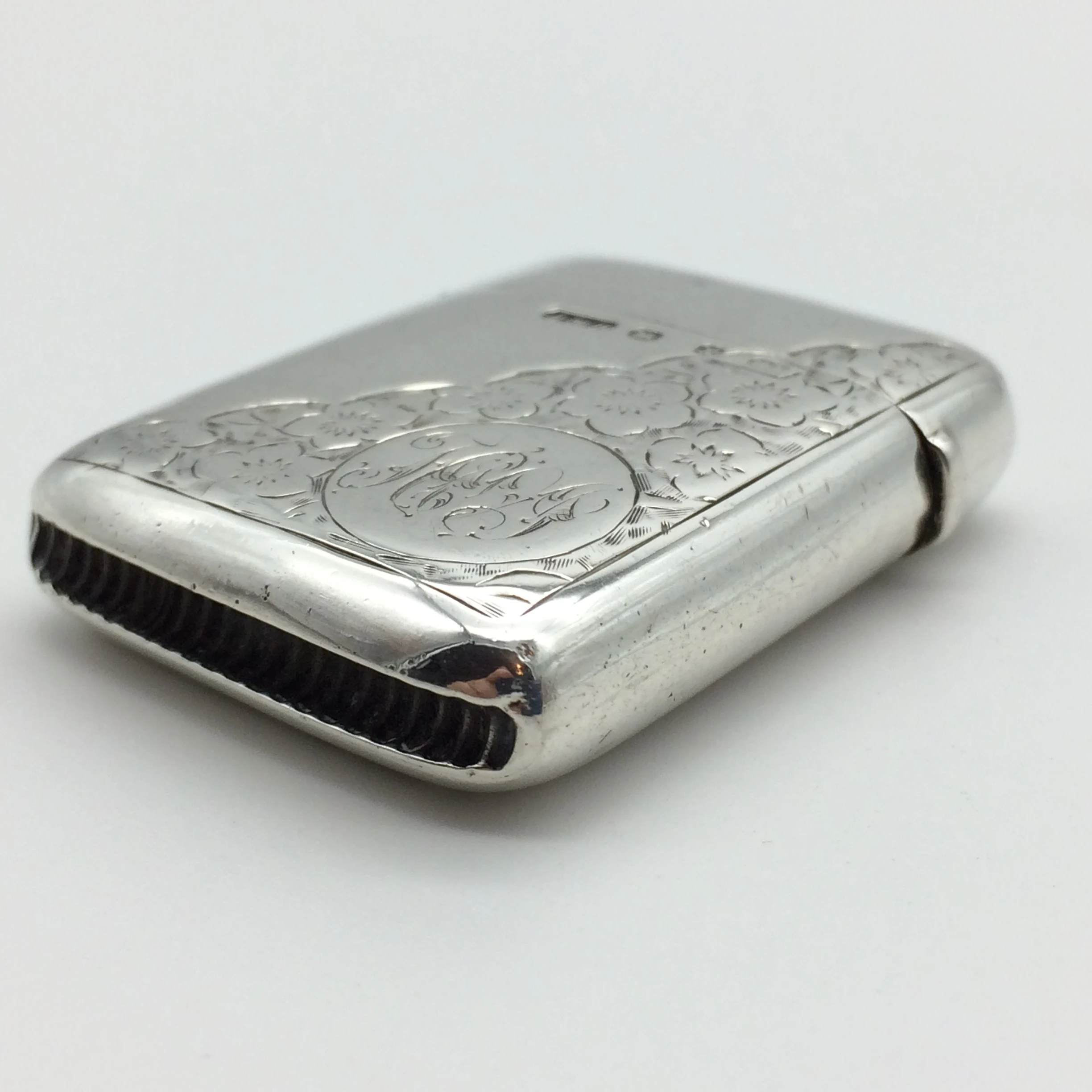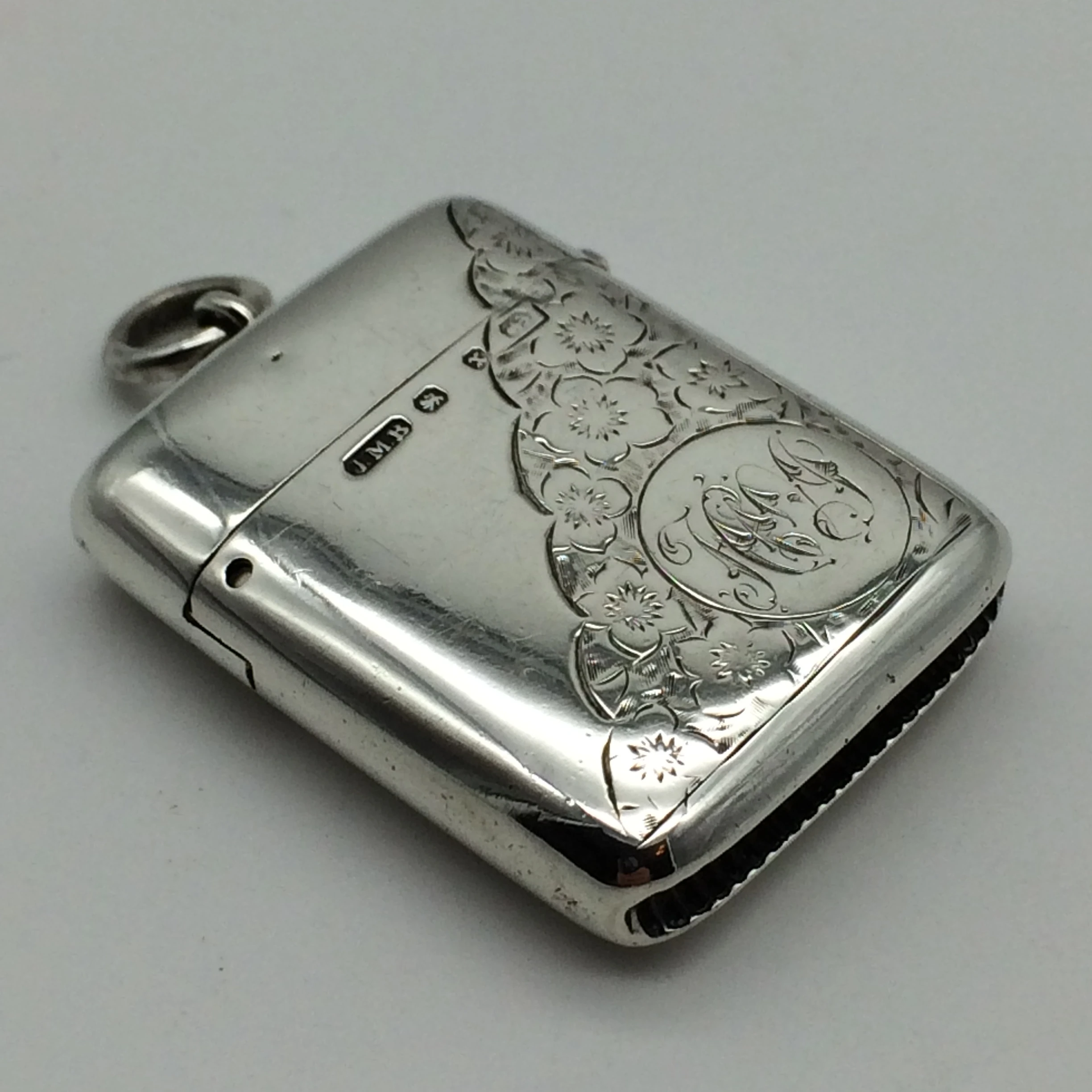 This good quality, sterling silver vesta case has been beautifully engraved on both sides with a floral decoration. It was manufactured by ‘John Millward Banks’, a very good silversmith, who was well known for his quality vesta cases. He established his business in 1863 and died in February 1911. His son continued with the business until 1925. The case is fully hallmarked for Birmingham 1897 and is stamped on the inside rim with his ‘Forget-Me-Knot’ flower trademark. It is in excellent condition for its age and measures 4cm x 3cm.