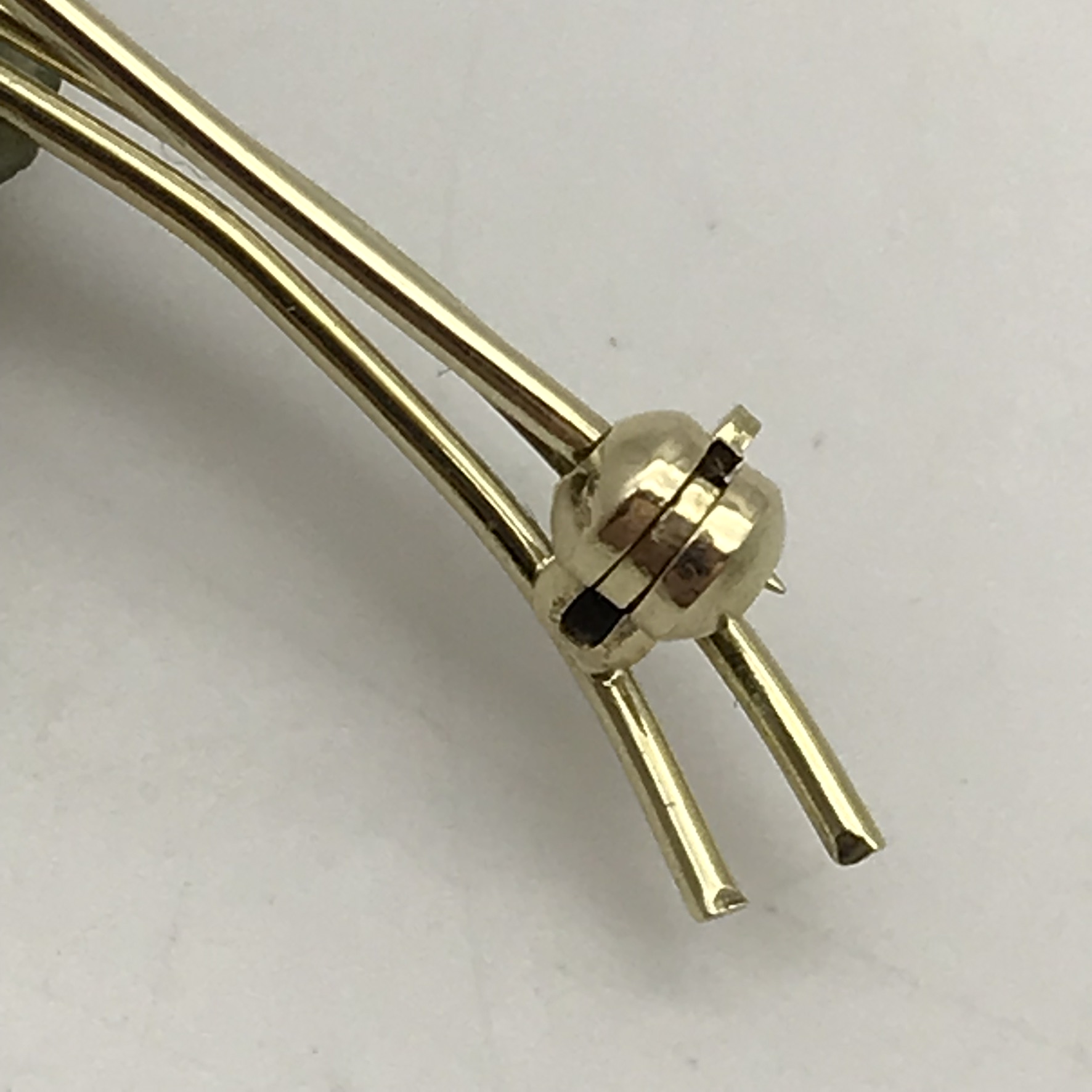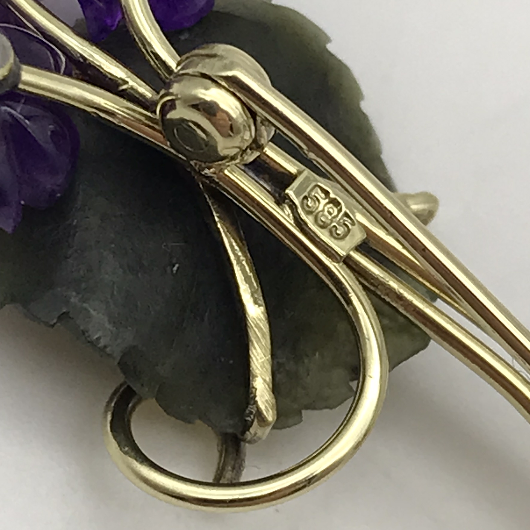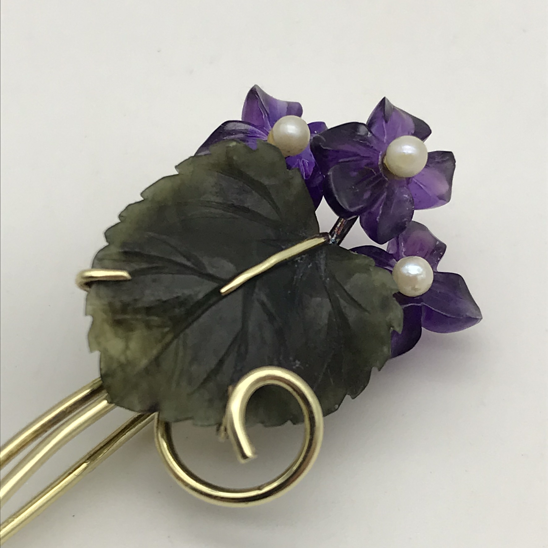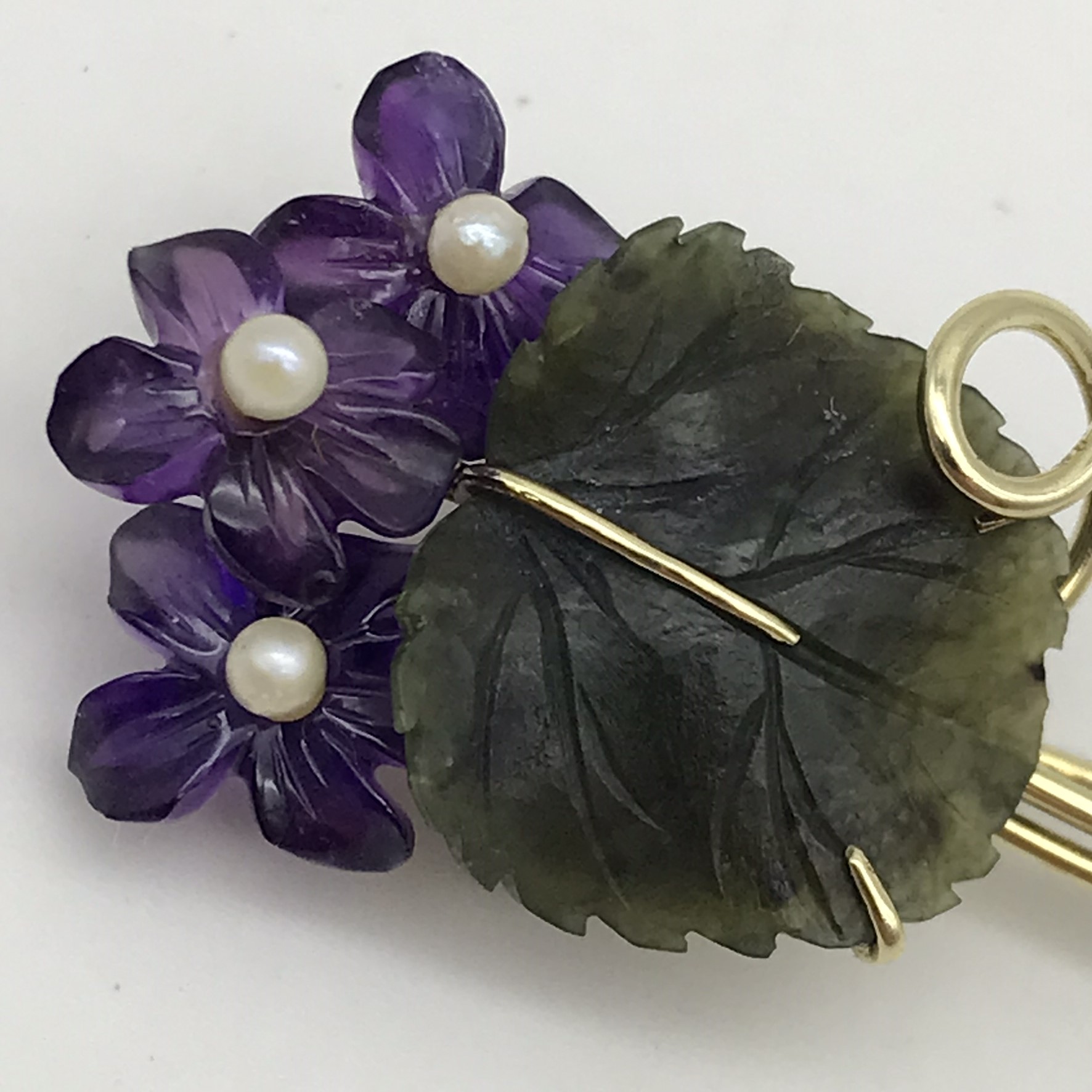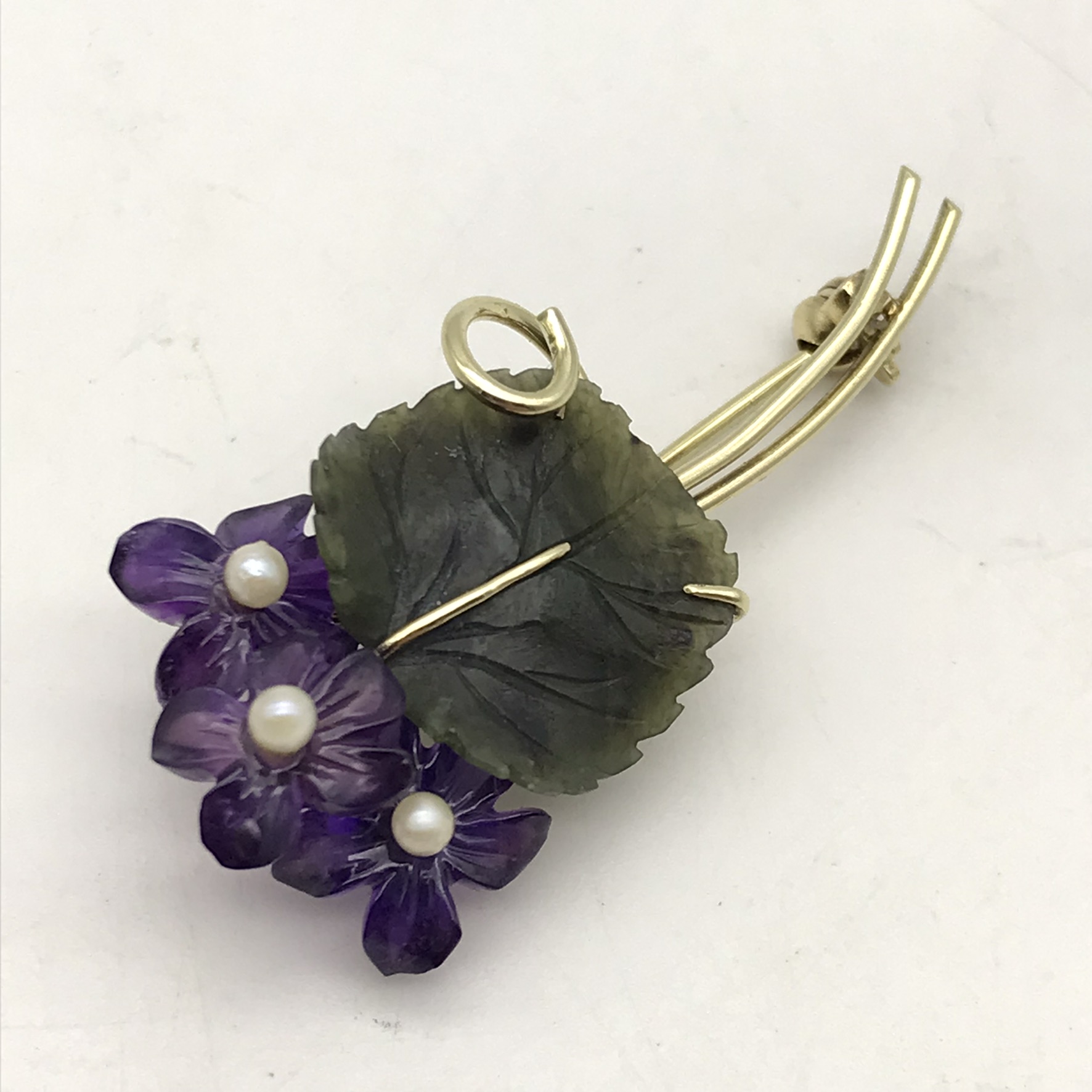This amazing, early, gold brooch is made up of beautifully carved natural stones set in 14ct yellow gold. It consists of three deep purple amethyst stones, intricately cut into flower petals with a small, cultured pearl in the centre of each and a lovely carved leaf made out of green jade. All the stones are cut in the natural form of the flower and leaves, making it a very attractive, special piece. The brooch is in excellent condition and measures 44mm x 20mm, weighs 4,8g and is stamped ‘585’ for 14ct gold, on the back.