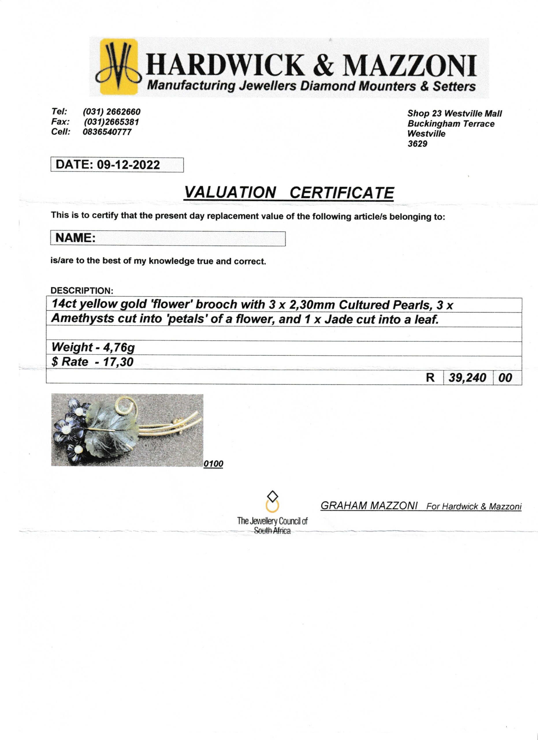 This beautiful brooch comes with a detailed valuation, with a replacement value of R39240,00, a copy of which is listed below. (Our valuations are done by a very reputable independent jeweller).