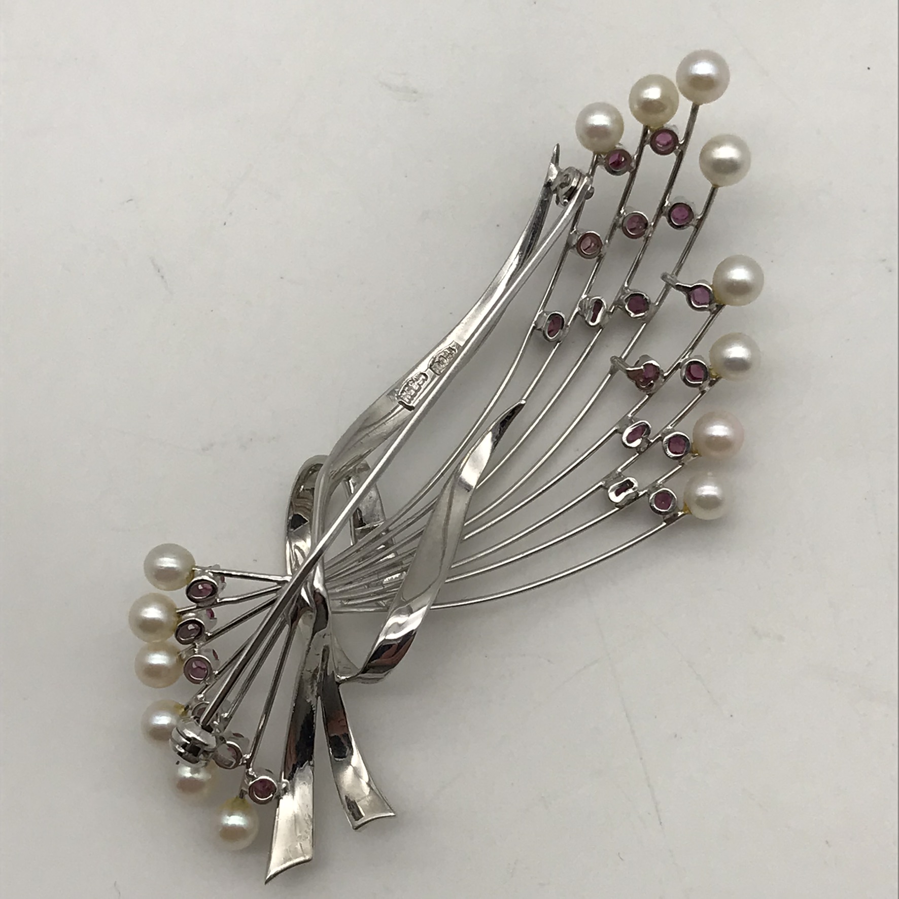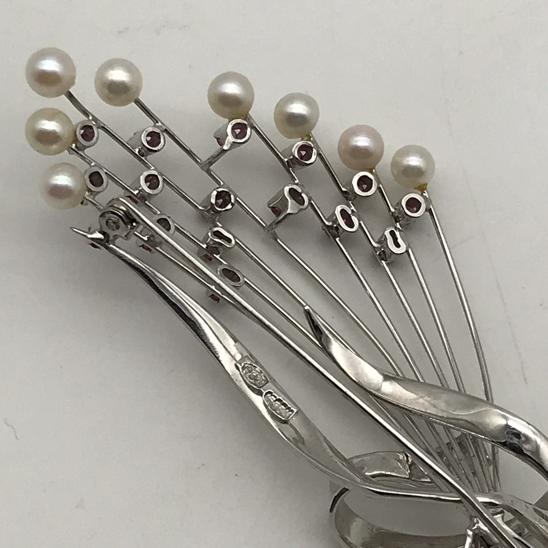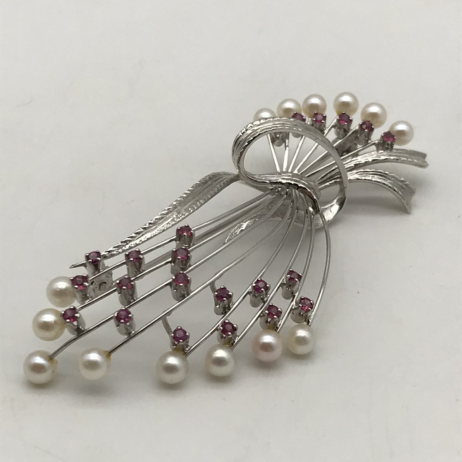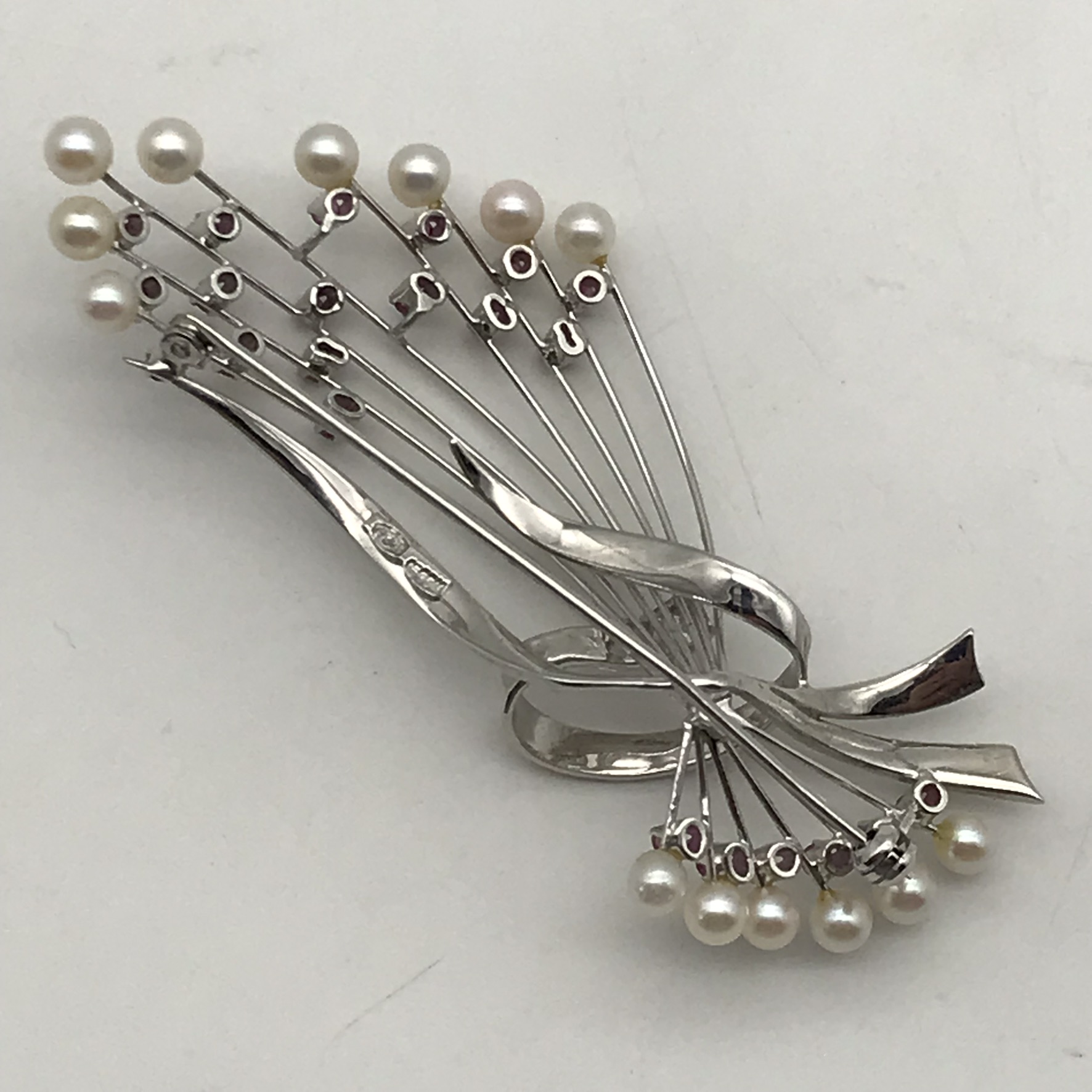 This very attractive 1950/60’s brooch is beautifully made and engraved in 18ct white gold, and set with 22 small round rubies and 14 small cultured pearls. The brooch is in mint condition with a secure roll-over clasp and appears to have hardly been worn. It measures 6,2cm x 3cm and weighs 9,9g.