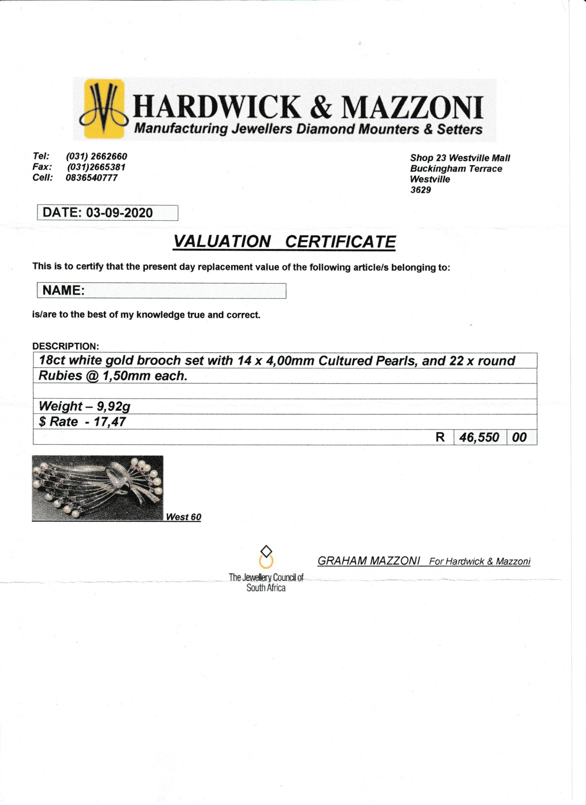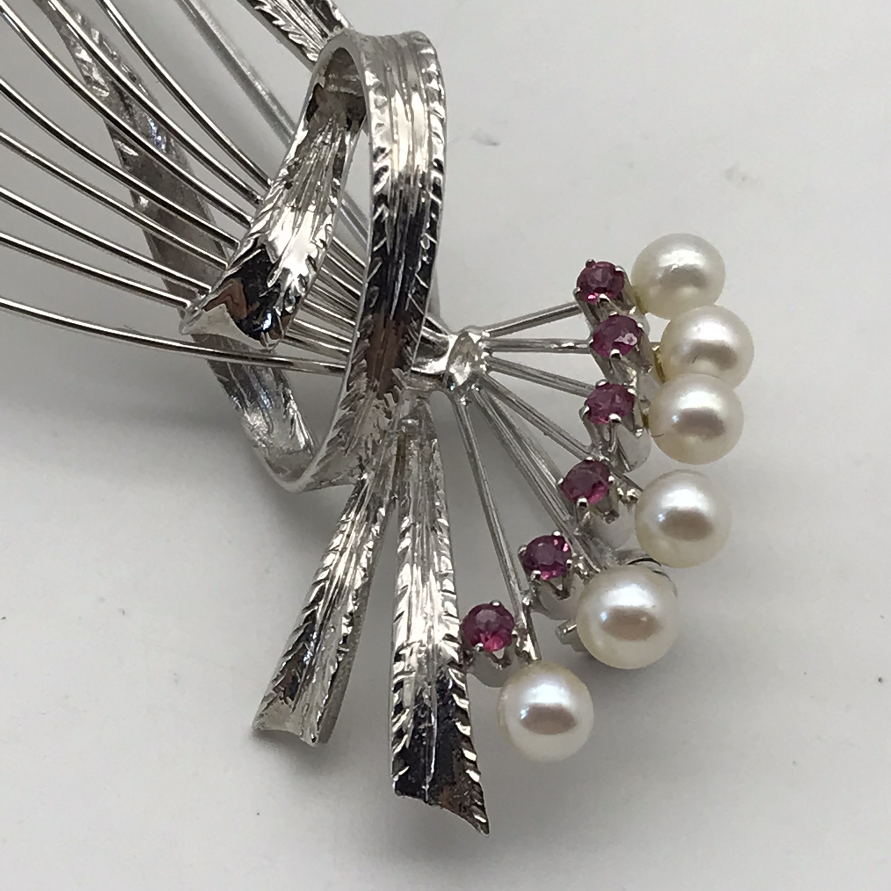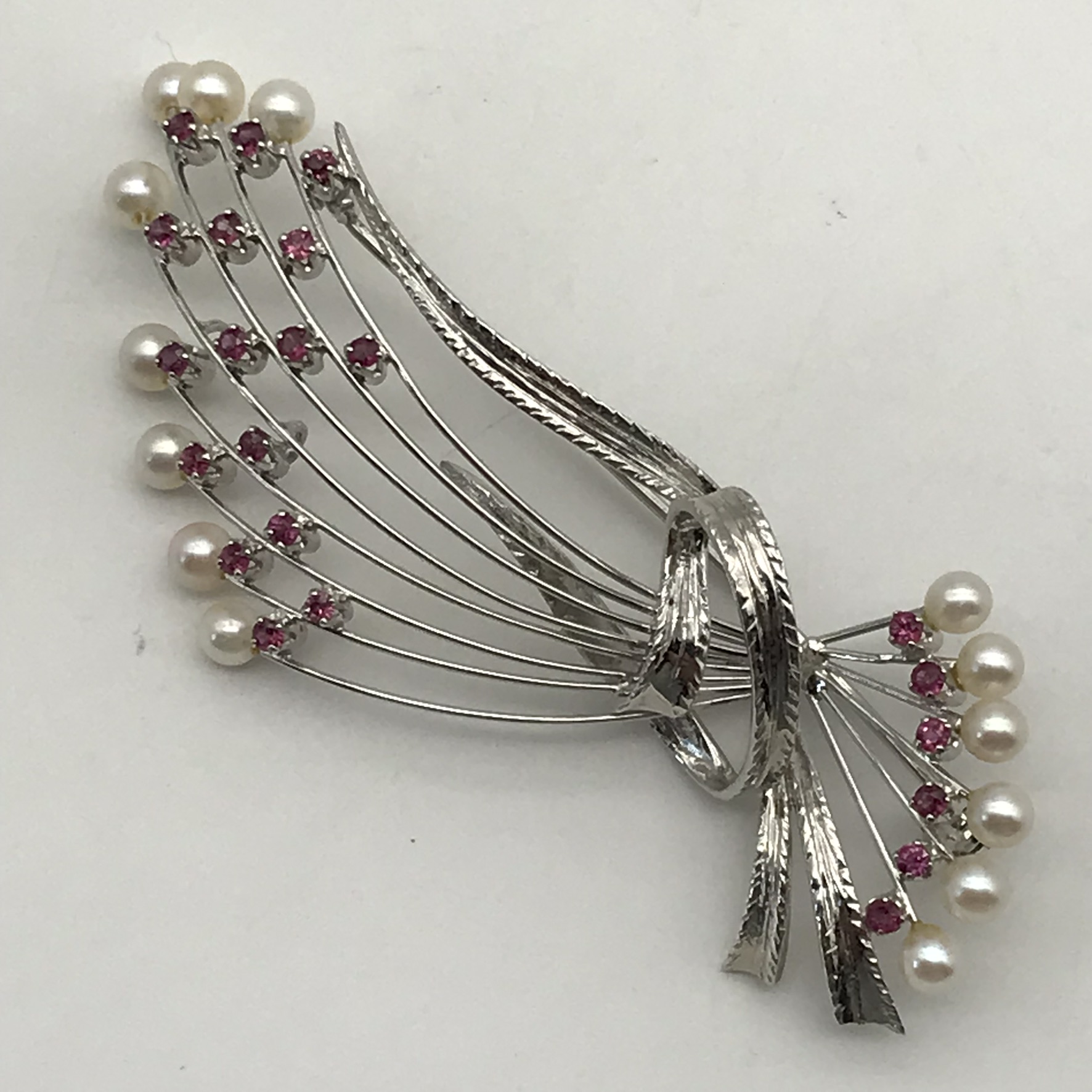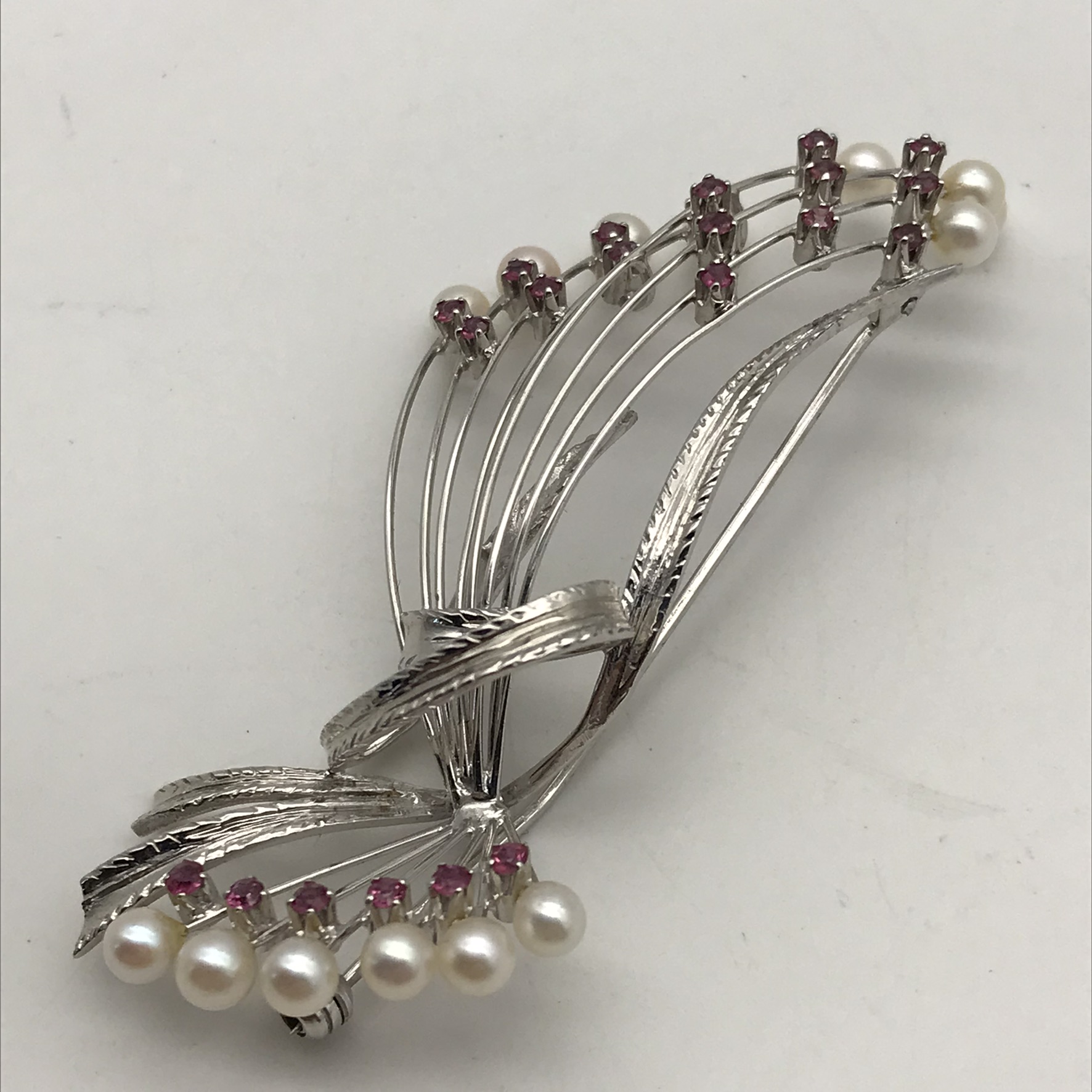 This very attractive 1950/60’s brooch is beautifully made and engraved in 18ct white gold, and set with 22 small round rubies and 14 small cultured pearls. The brooch is in mint condition with a secure roll-over clasp and appears to have hardly been worn. It measures 6,2cm x 3cm and weighs 9,9g.