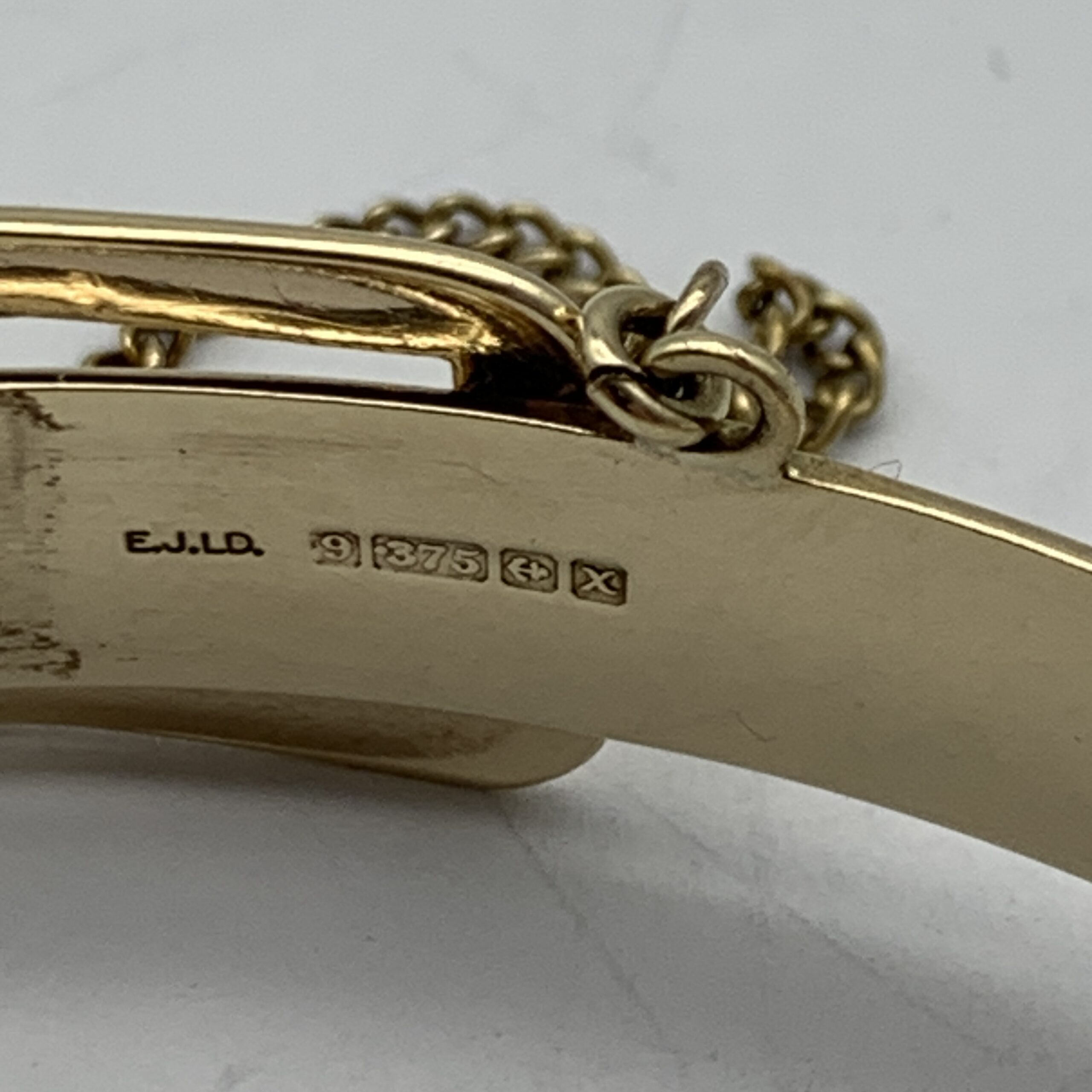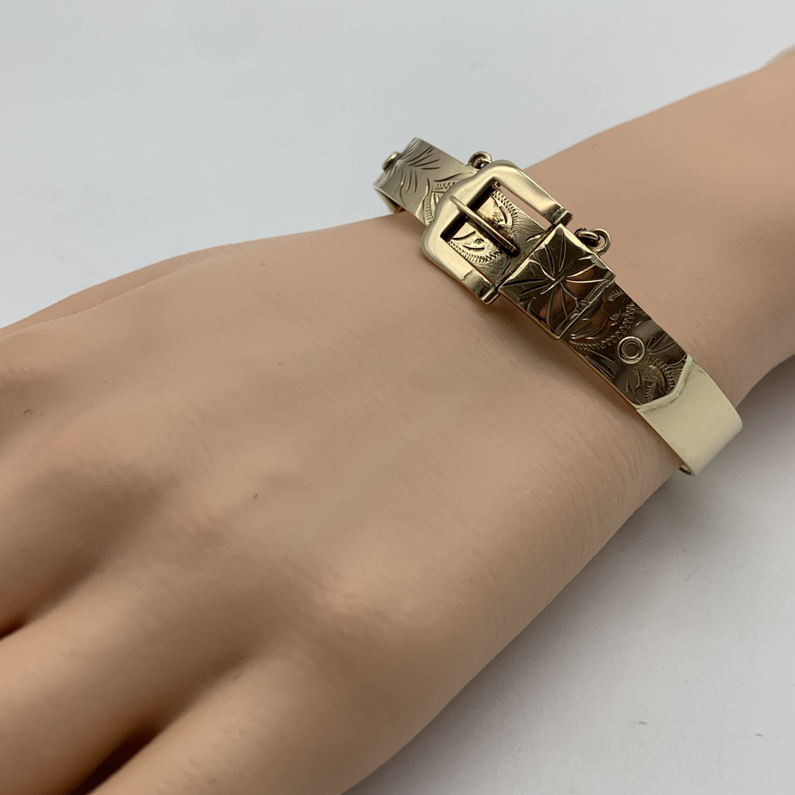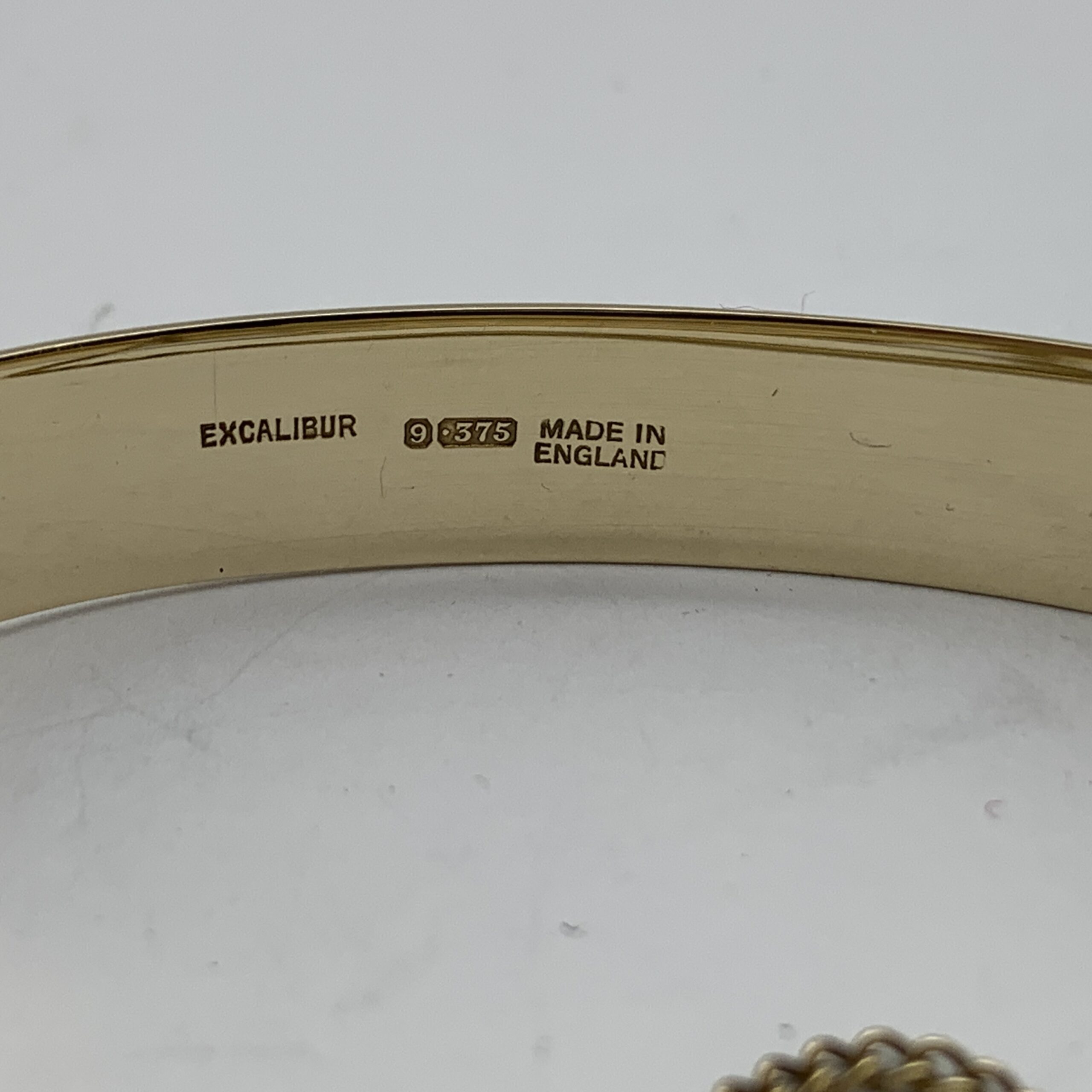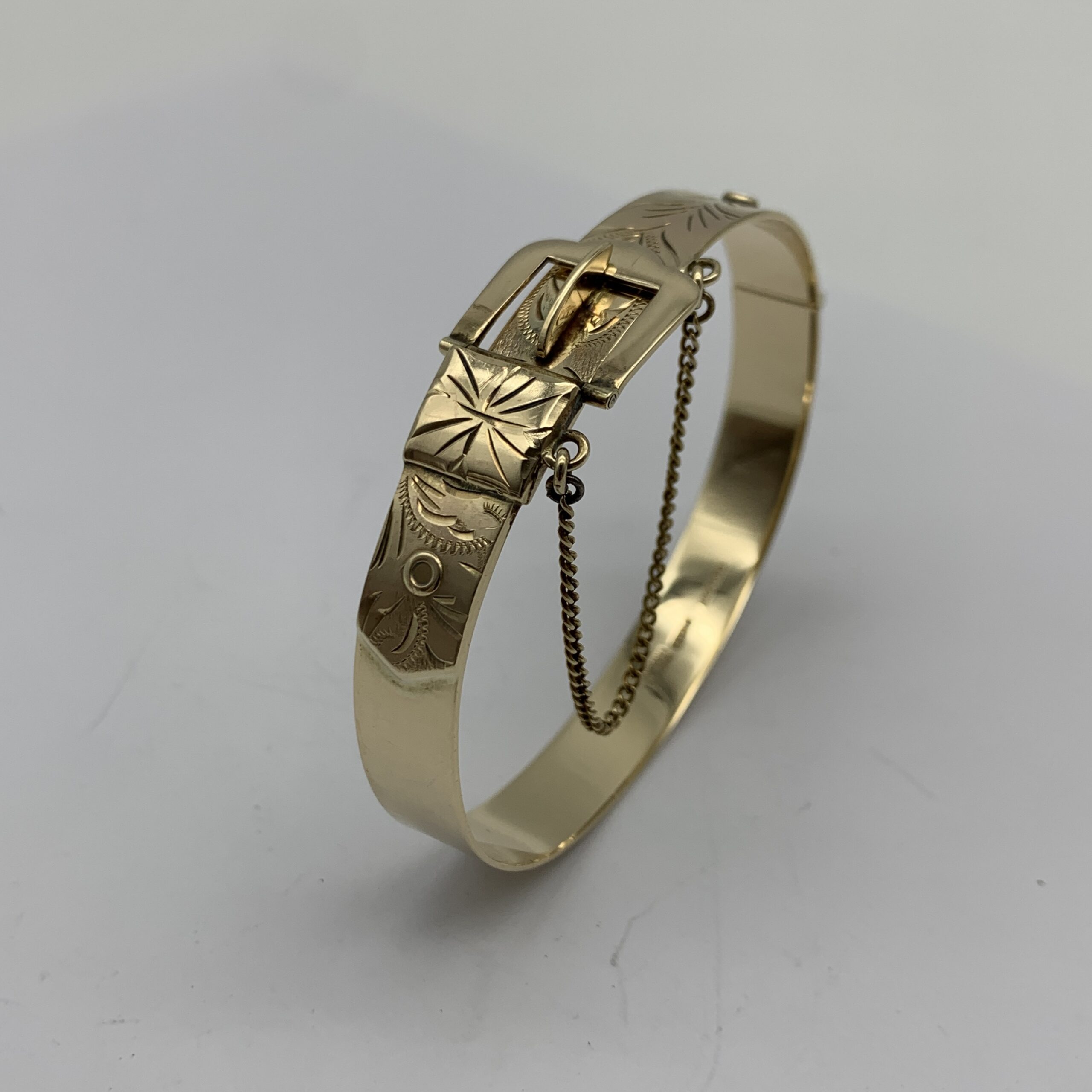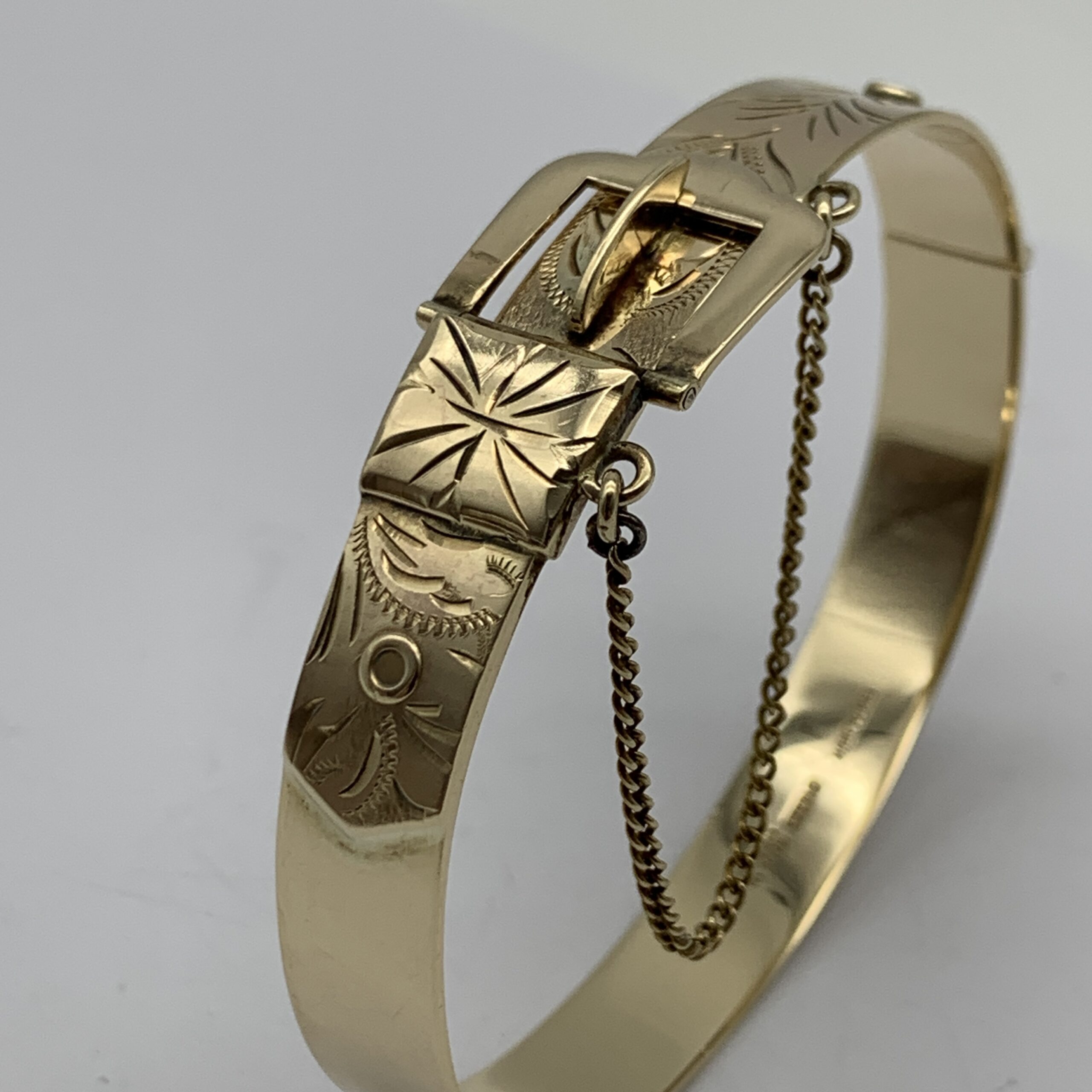 This wonderful, solid, vintage, 9ct rose gold bangle, has been beautifully made in the form of a ‘belt & buckle’ with the buckle functioning as the clasp and is decorated with ‘fern leaf’ engraving along the front. It was made in Birmingham, England in 1972 by manufactures ‘Excalibur Jewellery Ltd’ (E.J.LD.), who I believe, made pieces exclusively for ‘Harrods’ in London. This scarce bangle is a super quality piece with a nice weight, fitted with a safety chain and is in great condition with a lovely rose-gold colour and clear hallmarks. The bangle is oval shaped and measures 6,5cm x 5cm with a width of 1,6cm at its widest and weighs 20,2g. It is stamped ‘9’ ‘.375’ & ‘EXCALIBUR’ ‘MADE IN ENGLAND’ along with the English hallmarks.