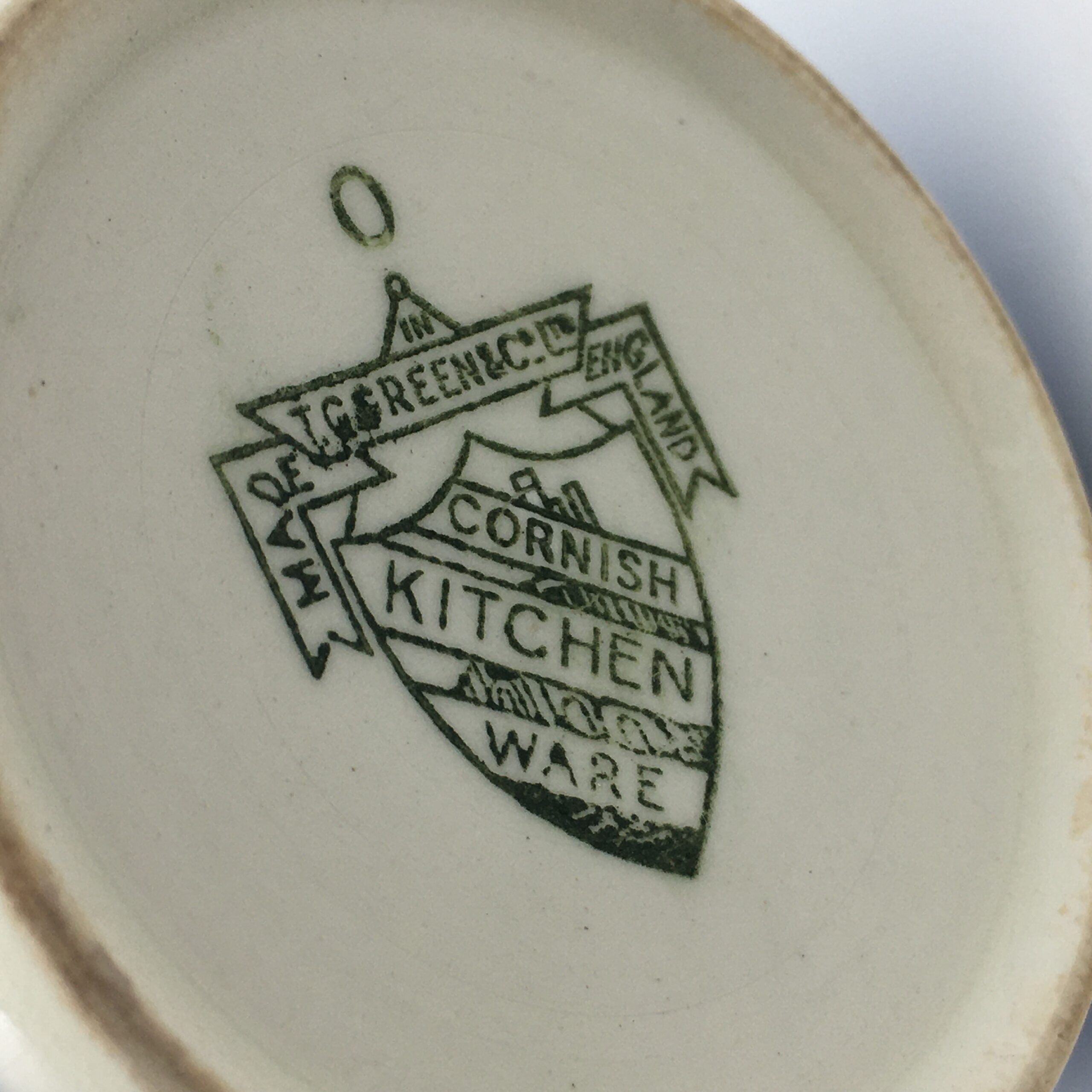 This lovely ‘Cornish Ware’ sugar caster or sugar shaker, from the 1930/40’s, with a screw on lid, was made in Derbyshire, England by ‘T.G. Green & Co.’ This piece has the early shield mark in green on the base, which was used between the 1920’s and the 1960’s. The sugar caster is in excellent condition and stands 11,3cm high, with a diameter of 7cm at its widest.