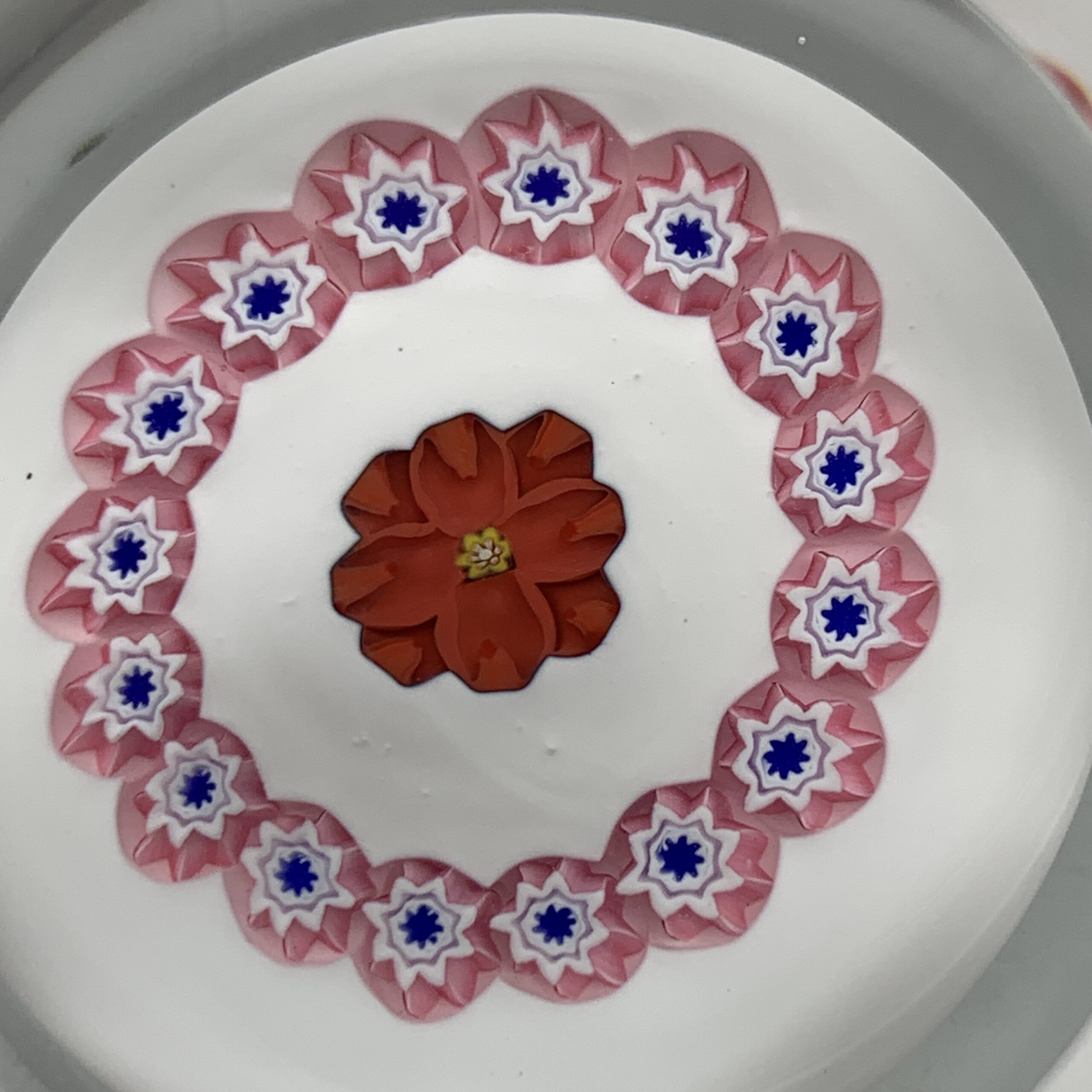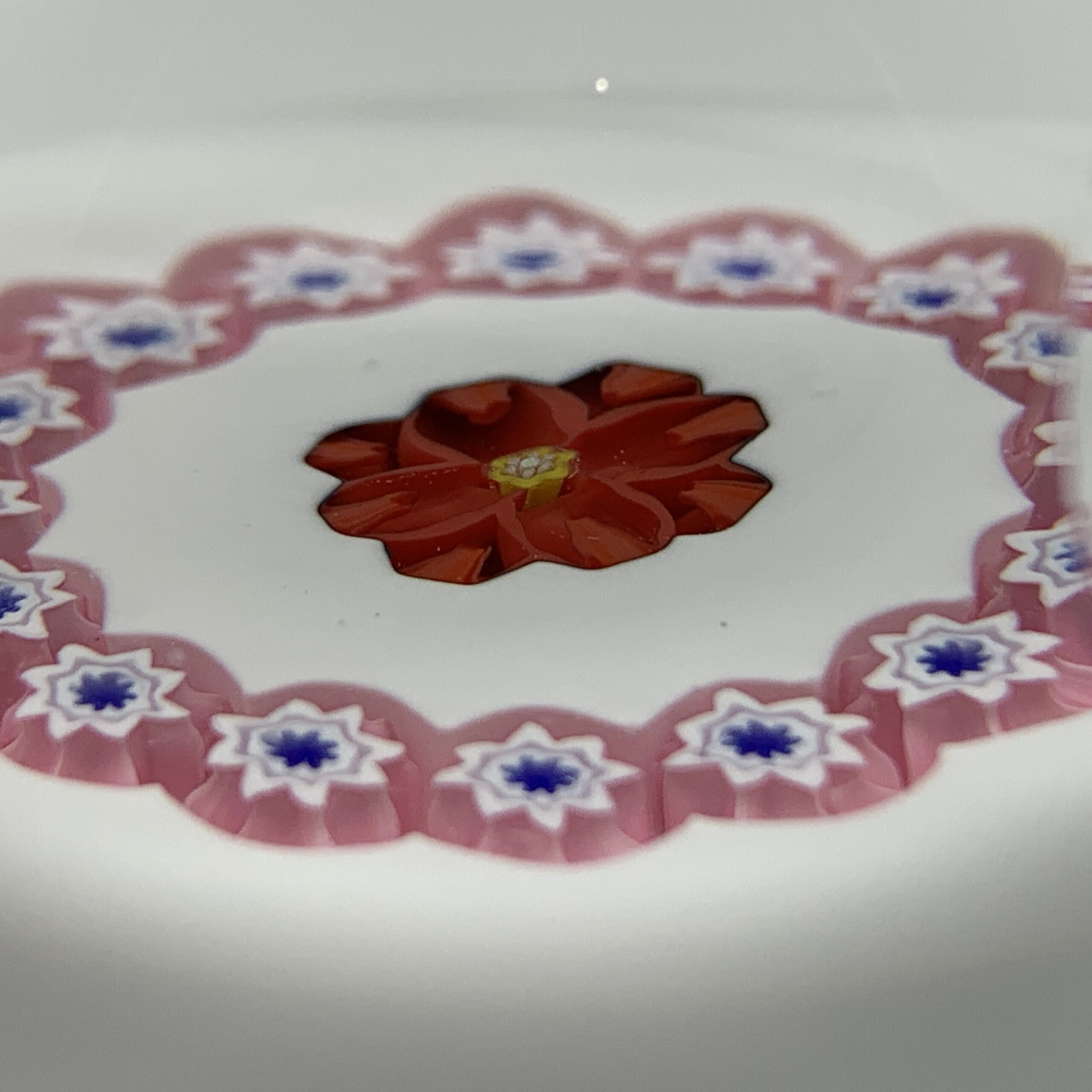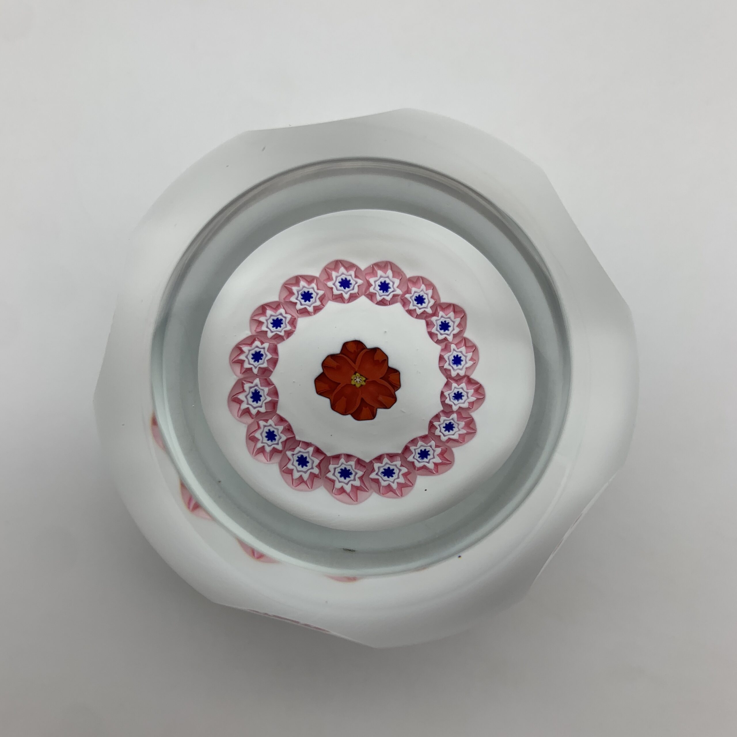 This attractive, round, faceted ‘Caithness’ art glass paperweight features a central red rose cane, encircled with a ring of pink and blue millefiori canes all on a white ground base. It was made in Scotland by the well-known ‘Caithness Glass’ factory and designed by ‘Alan Scott’. This lovely paperweight is in excellent condition and carries the makers mark and pattern details on the base. It stands 4cm high, with a diameter of 5,5cm and weighs 208g.