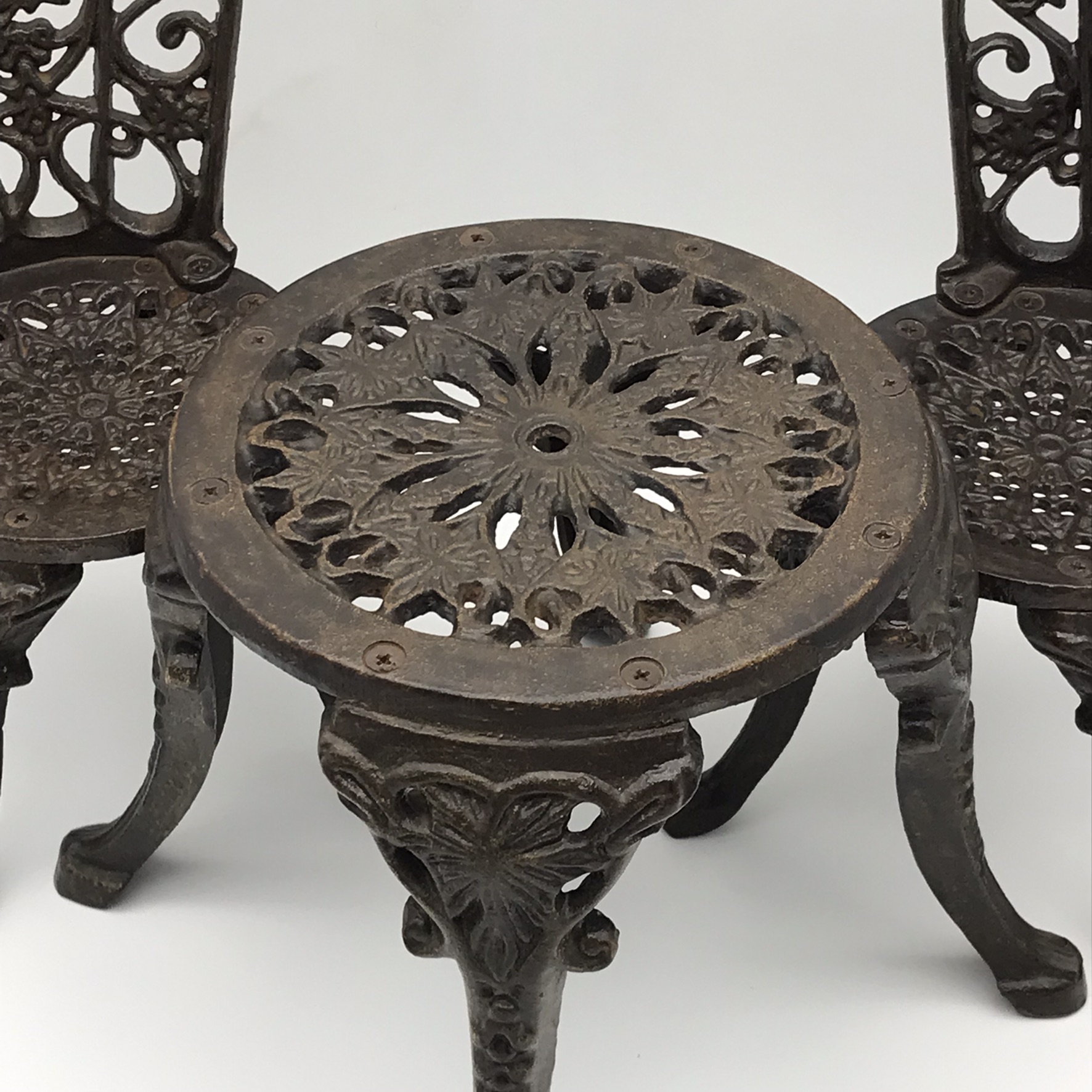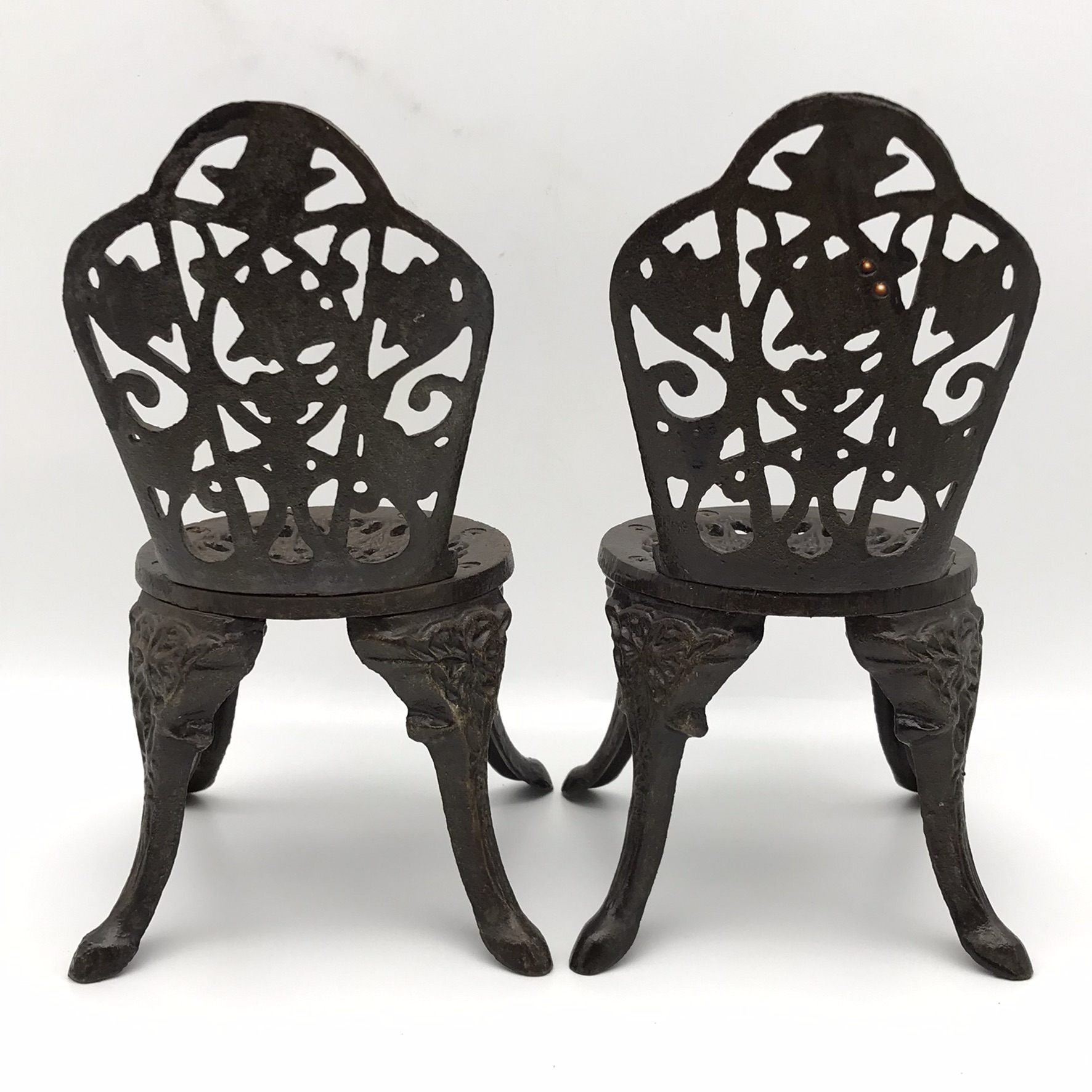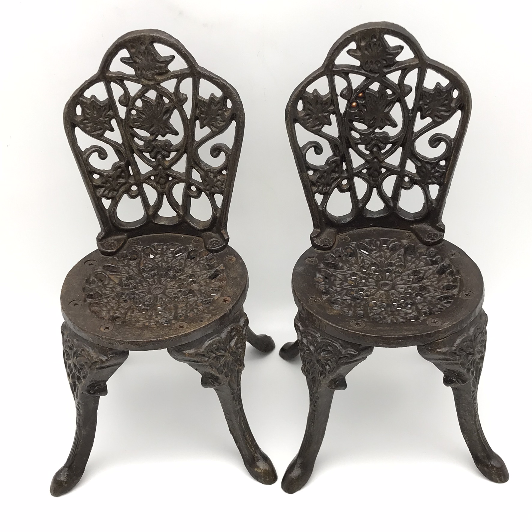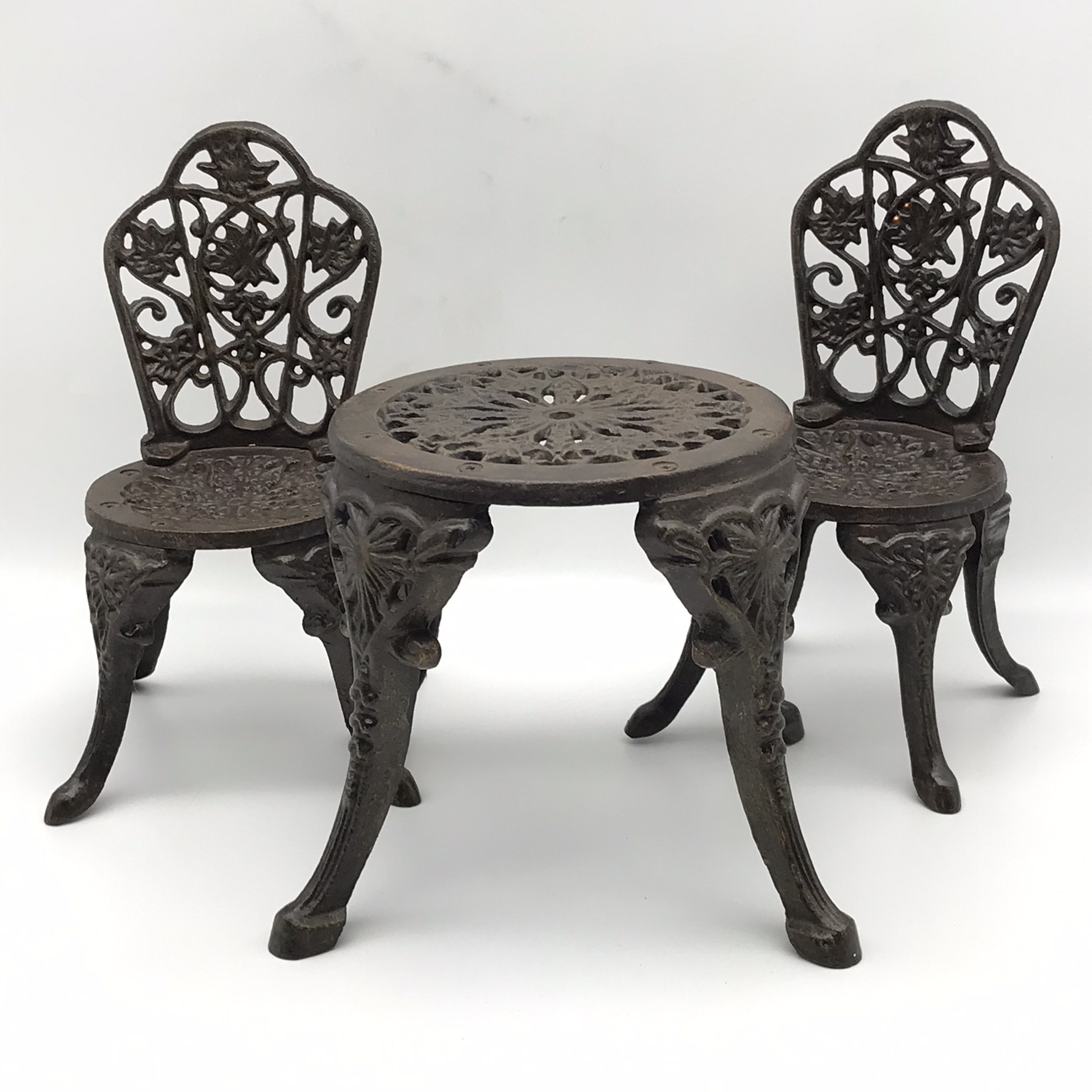 This lovely, early, very good quality, cast iron dolls table and two chairs have matching detailed legs with lovely cut-out detail on the chairs. The set is very well-made with a nice weight and in excellent condition. The table stands 16cm high, with a top diameter of 16cm (24cm with feet, at its widest), the chairs stand 23cm high, with a seat diameter of 10,5cm (17,5cm with feet, at its widest), and together weigh a lovely 2,97kg.