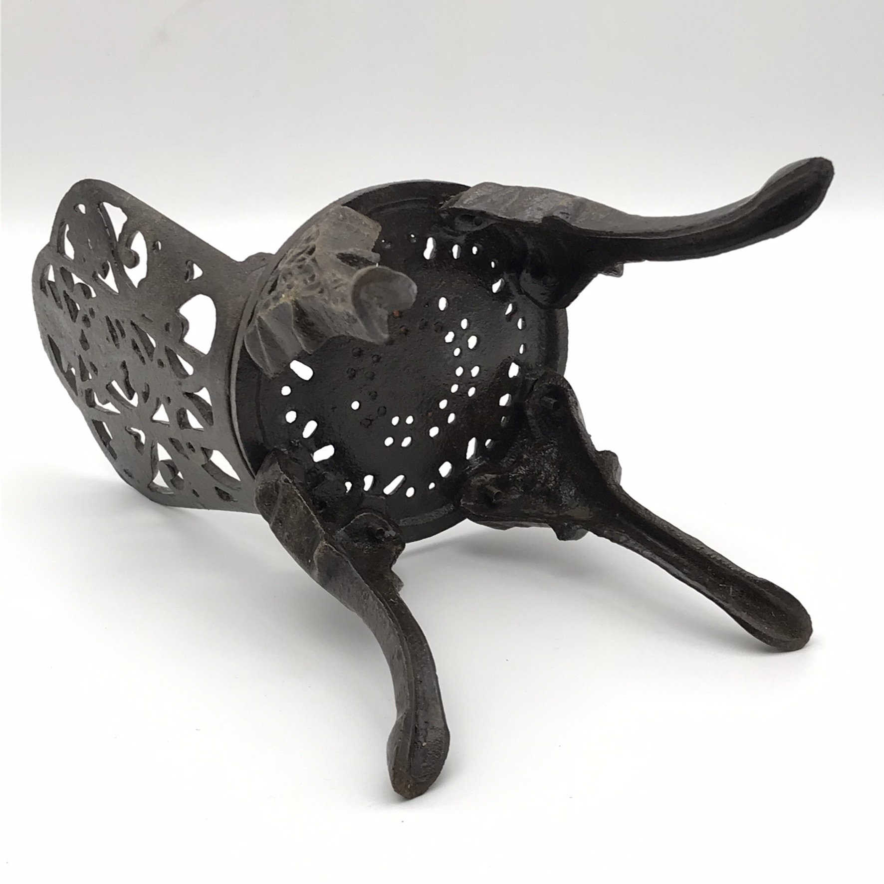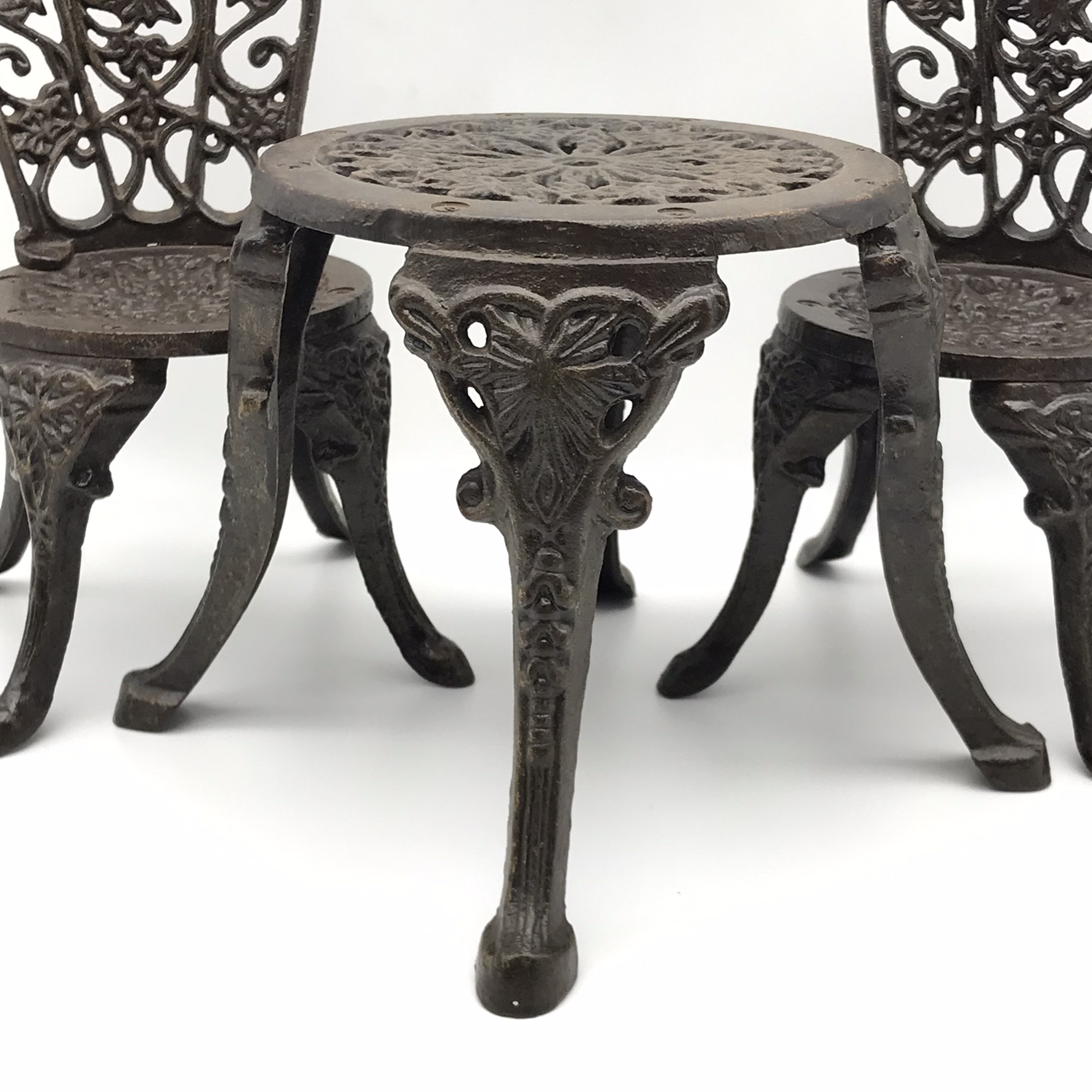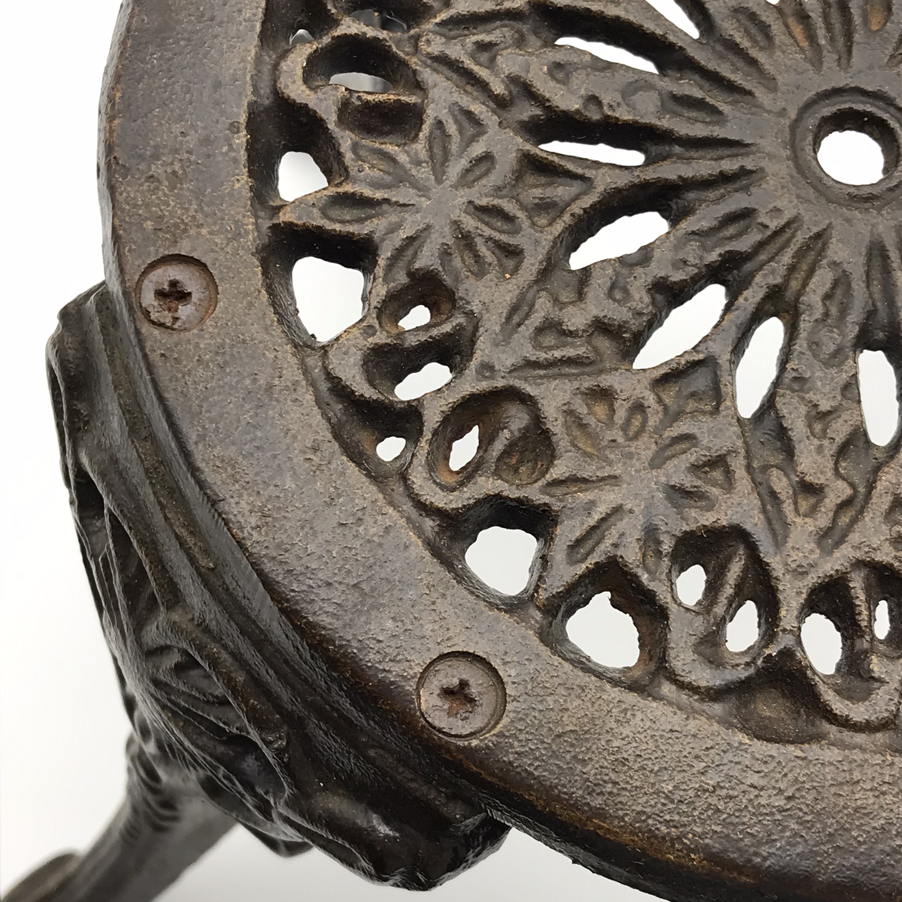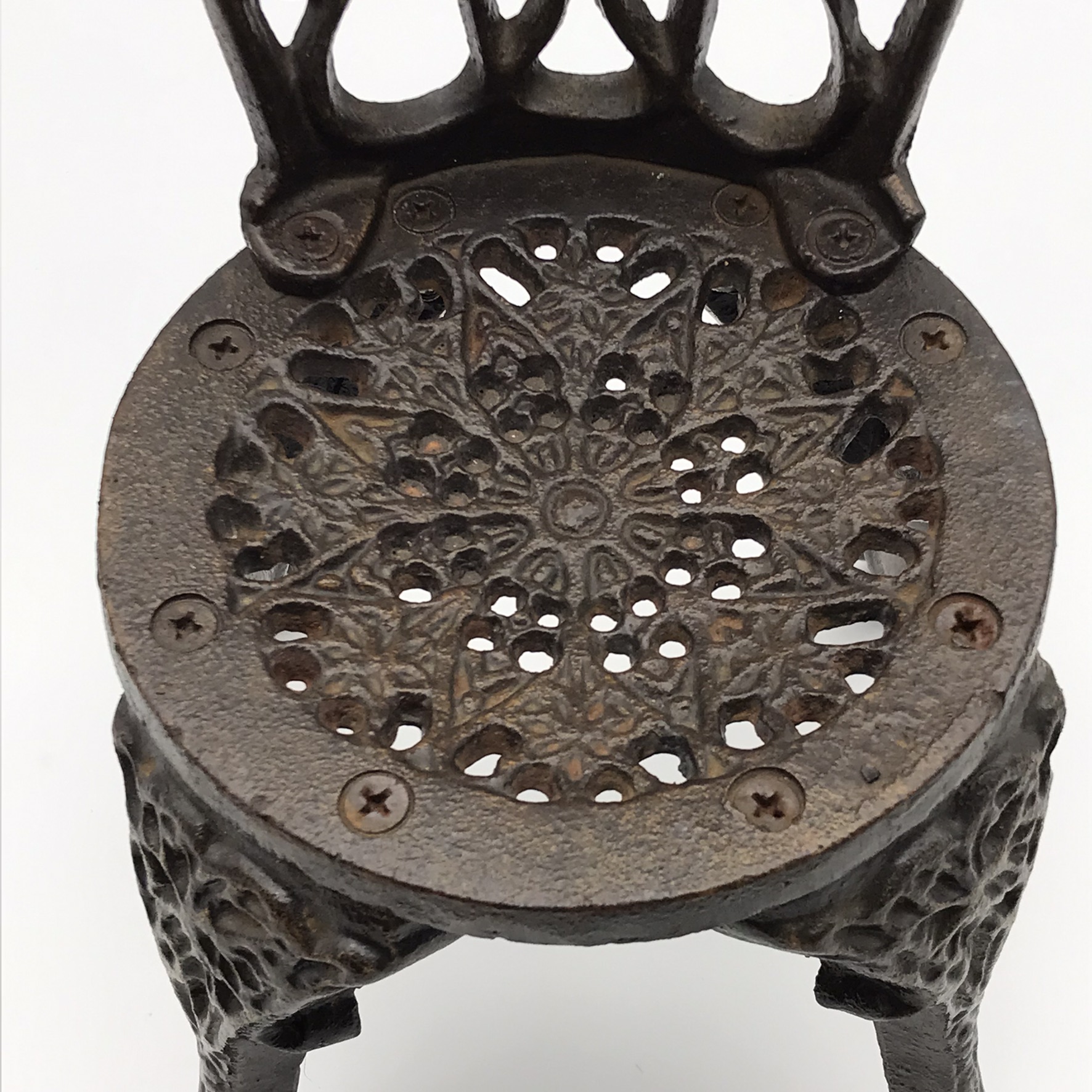 This lovely, early, very good quality, cast iron dolls table and two chairs have matching detailed legs with lovely cut-out detail on the chairs. The set is very well-made with a nice weight and in excellent condition. The table stands 16cm high, with a top diameter of 16cm (24cm with feet, at its widest), the chairs stand 23cm high, with a seat diameter of 10,5cm (17,5cm with feet, at its widest), and together weigh a lovely 2,97kg.