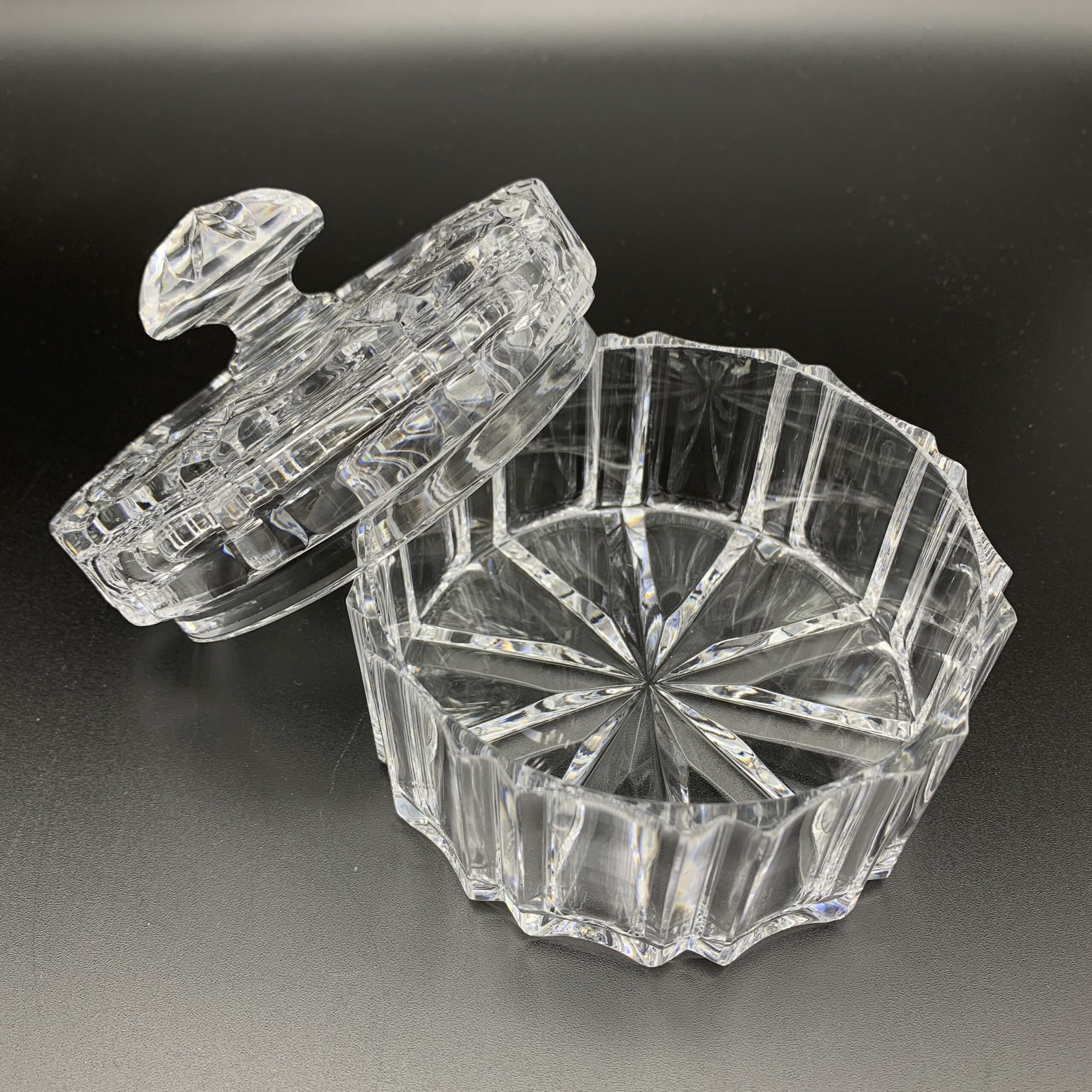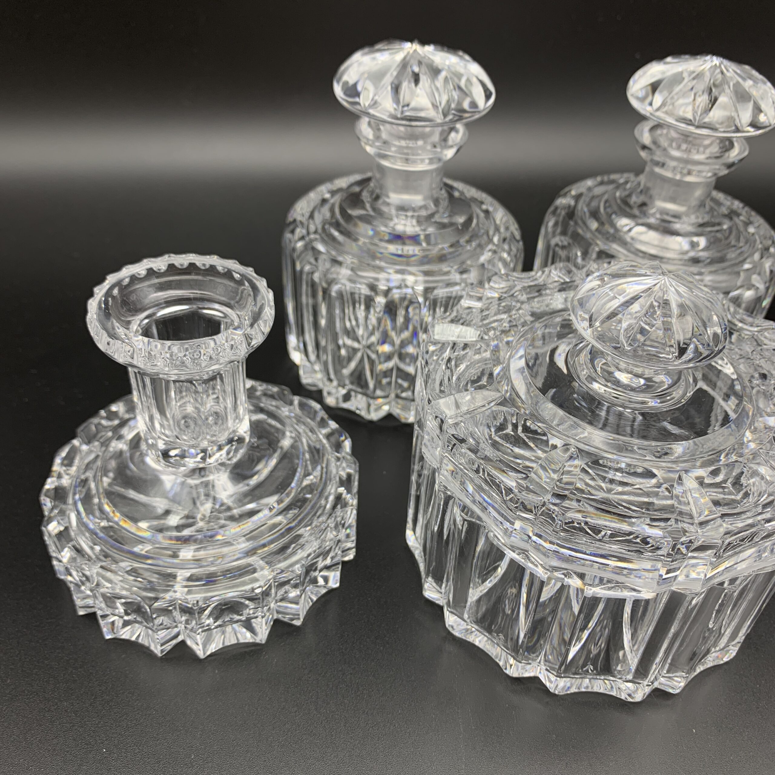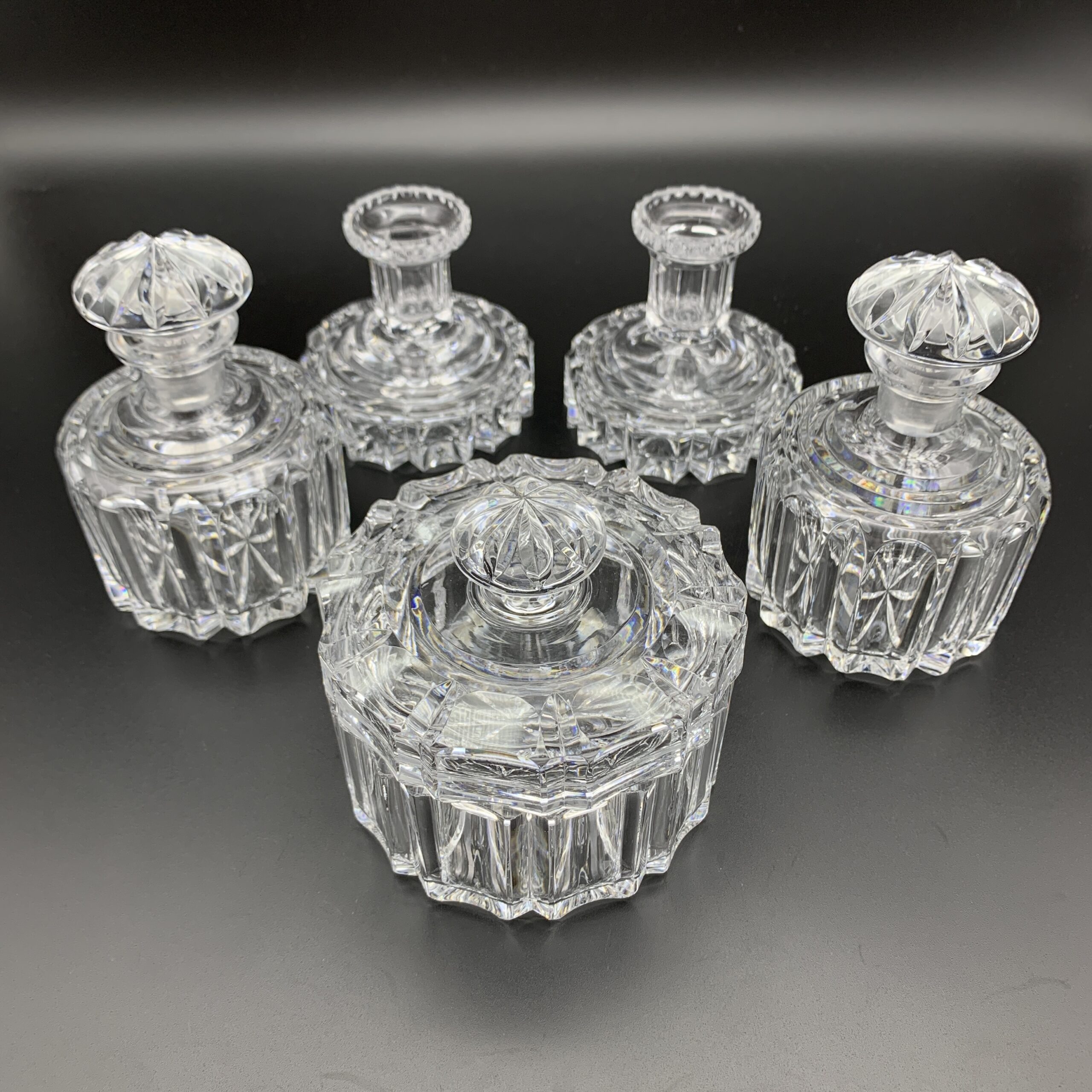This super quality, 1950/60’s, cut-crystal dressing table set consists of a pair of candle holders, a pair of matching scent bottles with their stoppers and a vanity jar and lid, all beautifully cut in the same pattern in a thick gauge of crystal. The set is in a crystal clear and superb condition with the following measurements, candle holders stand 8,5cm with a base diameter of 9cm, scent bottles stand 12cm with a base diameter of 8cm, vanity jar stands 10cm with a base diameter of 10,5cm and together weigh 2,1kg.