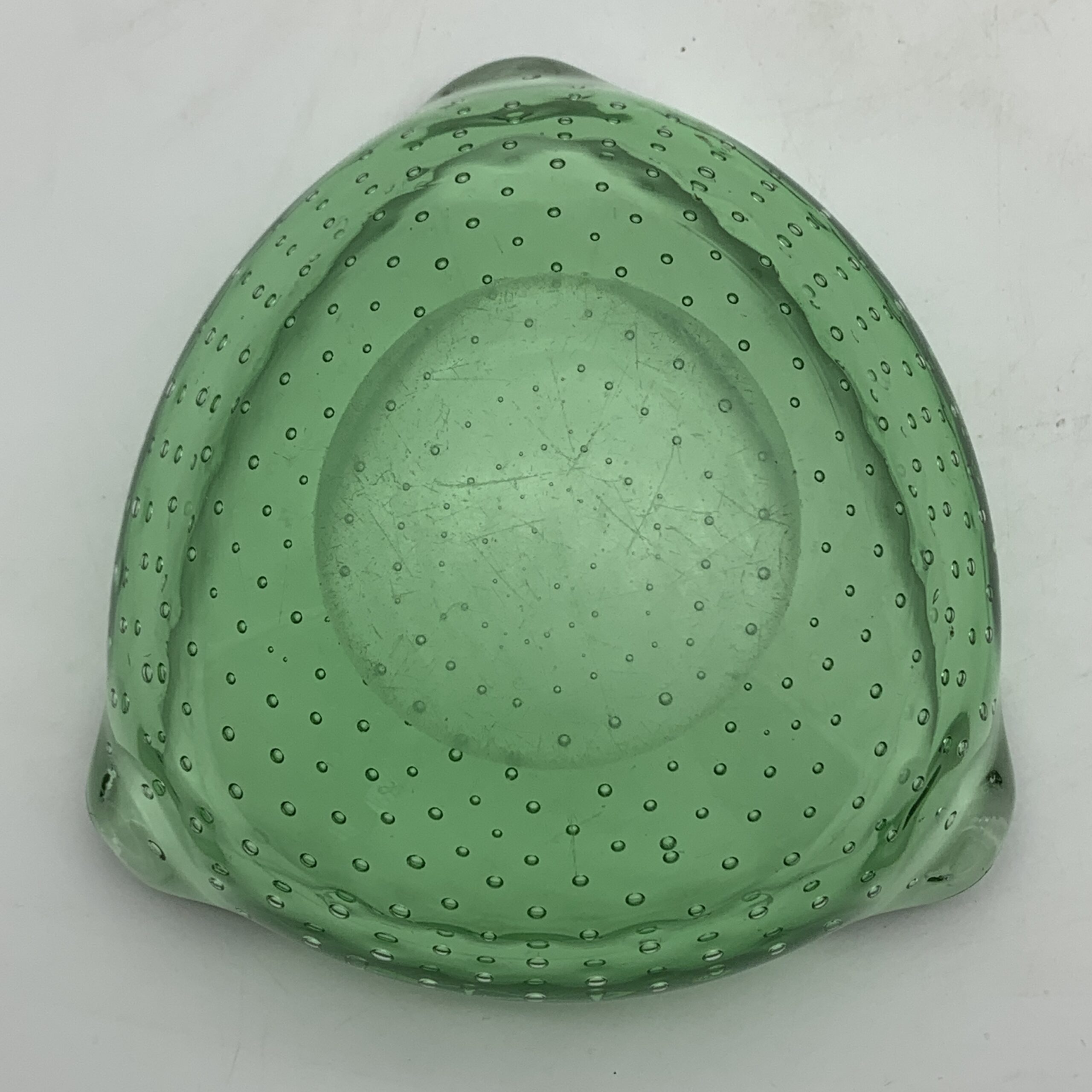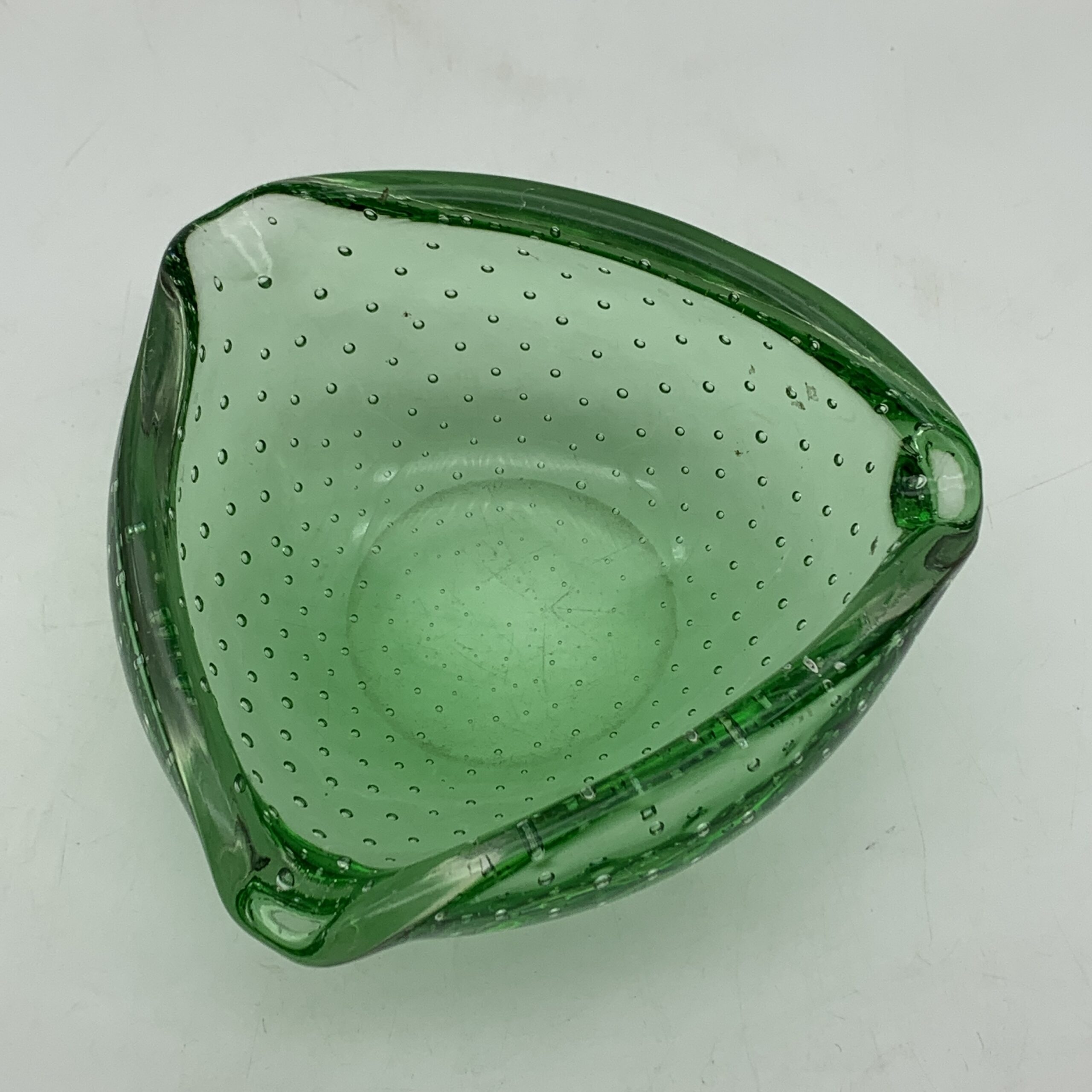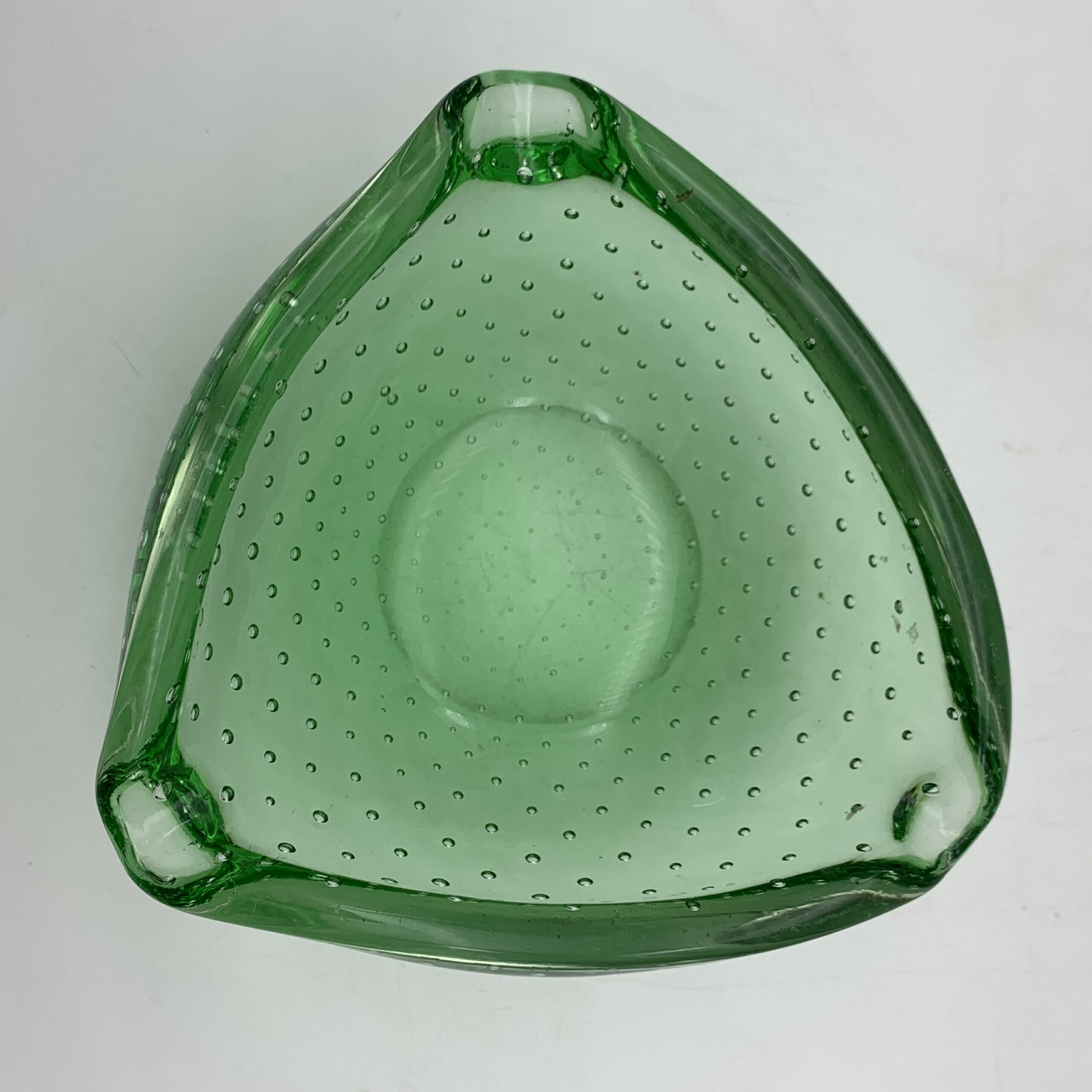 This attractive, heavy, vintage Murano green glass ashtray or dish has a rounded triangular shape with numerous controlled bubbles. It is in excellent condition with a nice, aged base and measures 13cm x 13cm, stands 5,5cm and weighs 600g.