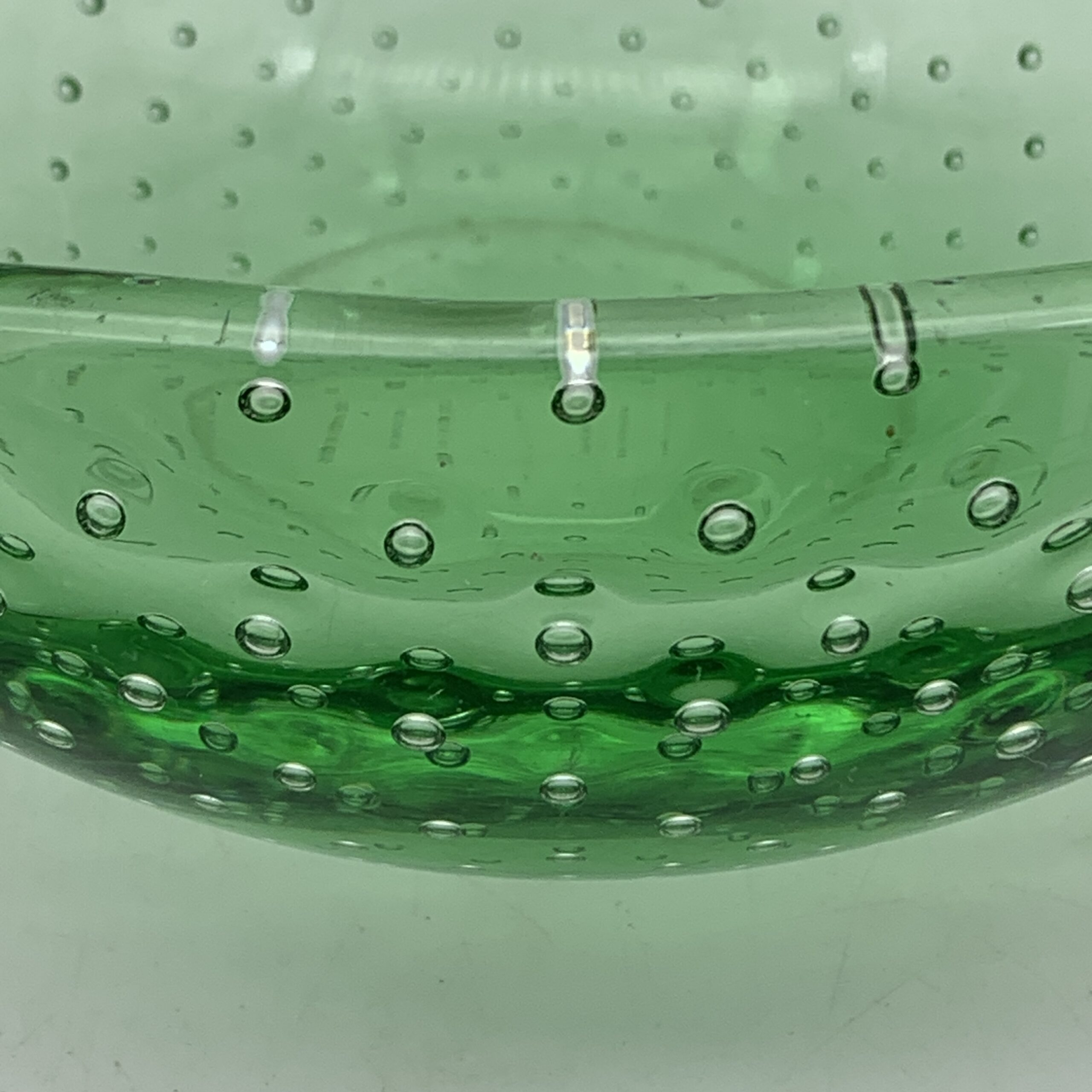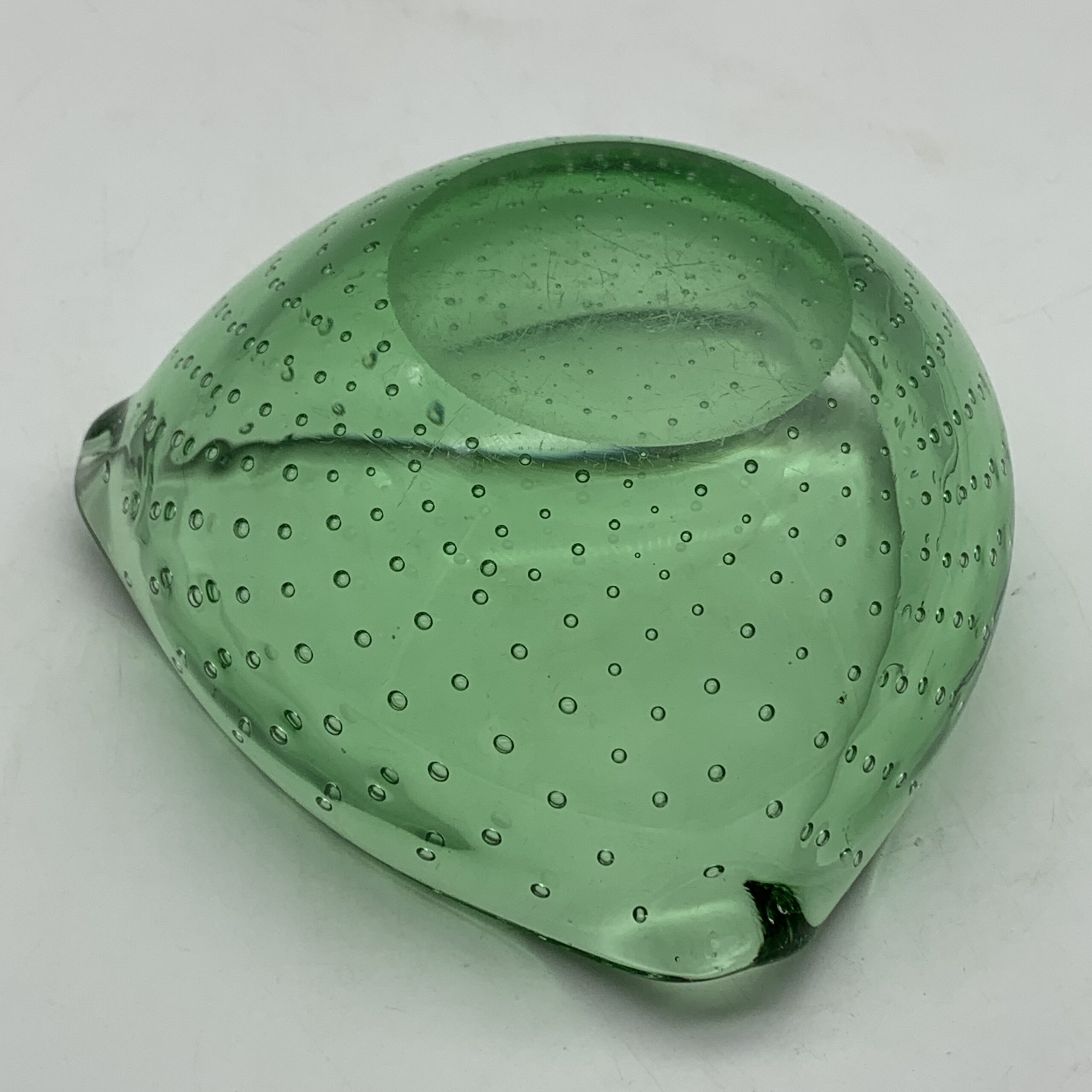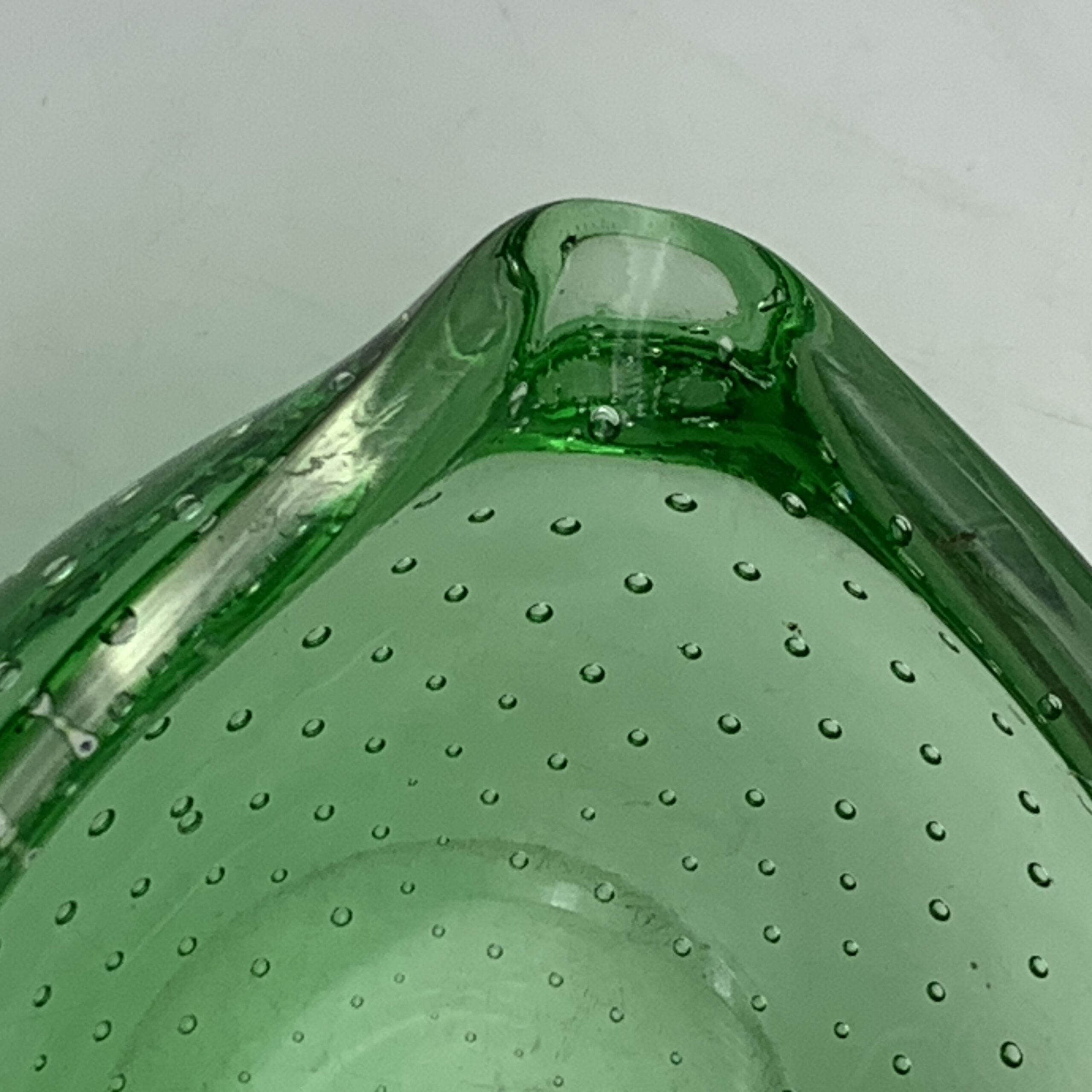 This attractive, heavy, vintage Murano green glass ashtray or dish has a rounded triangular shape with numerous controlled bubbles. It is in excellent condition with a nice, aged base and measures 13cm x 13cm, stands 5,5cm and weighs 600g.