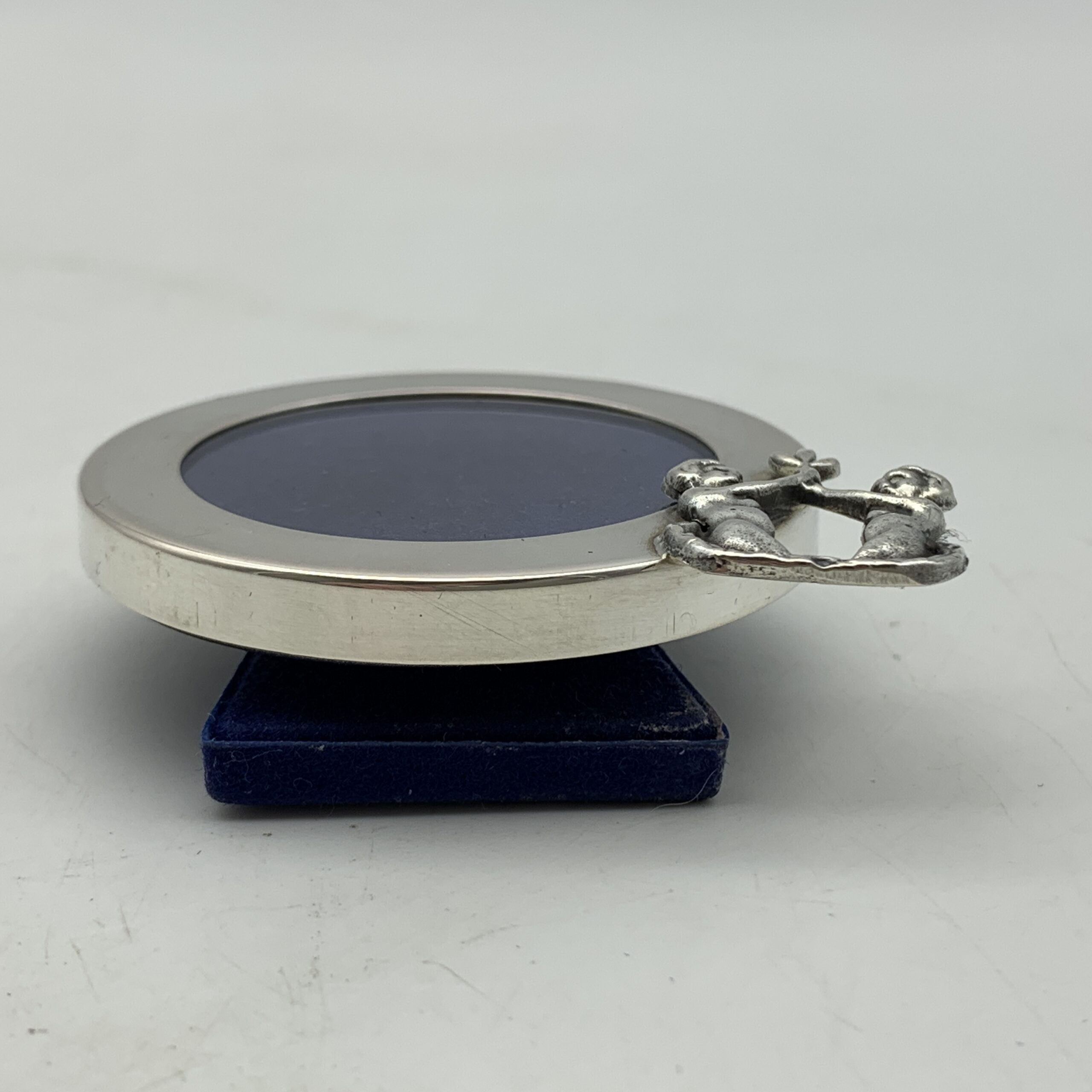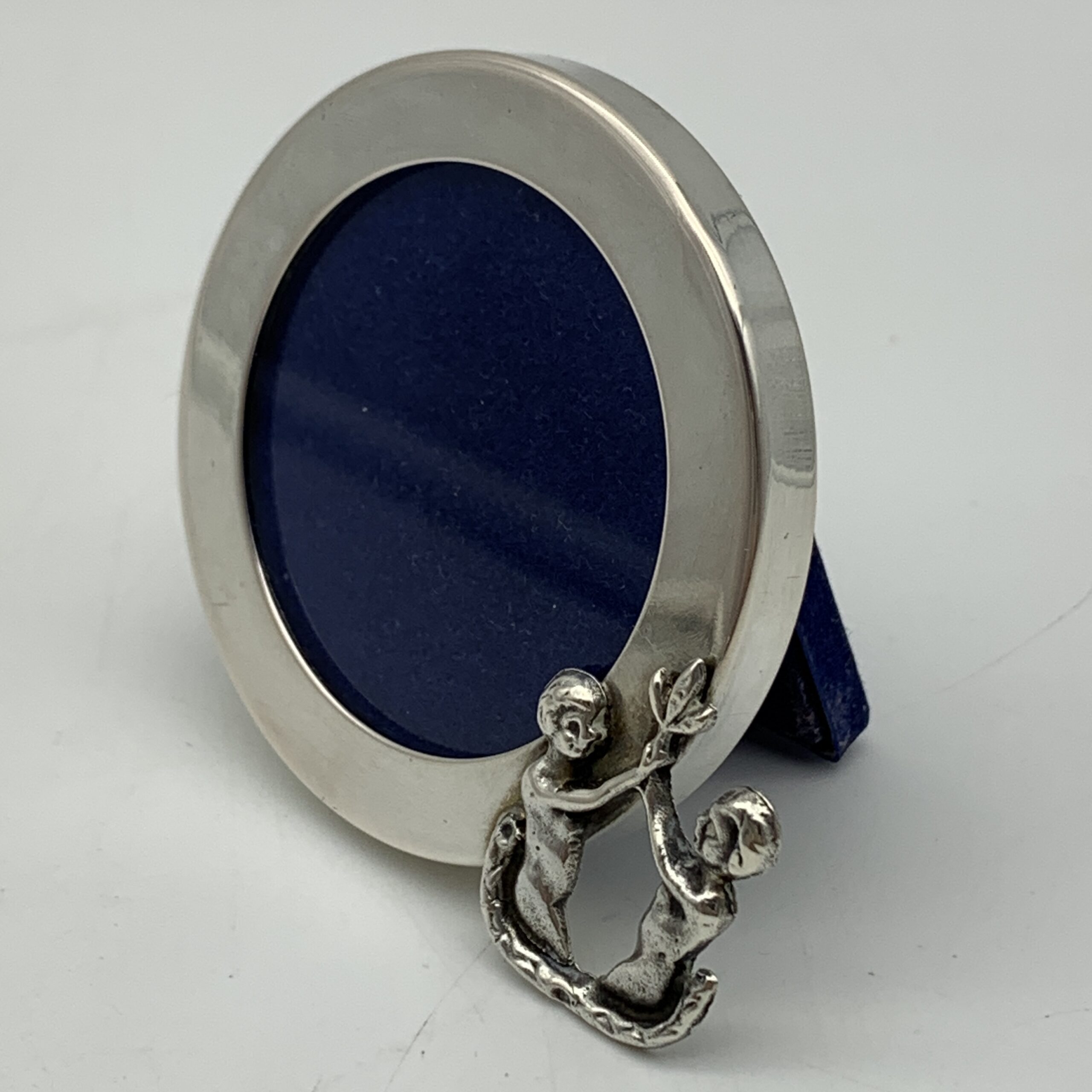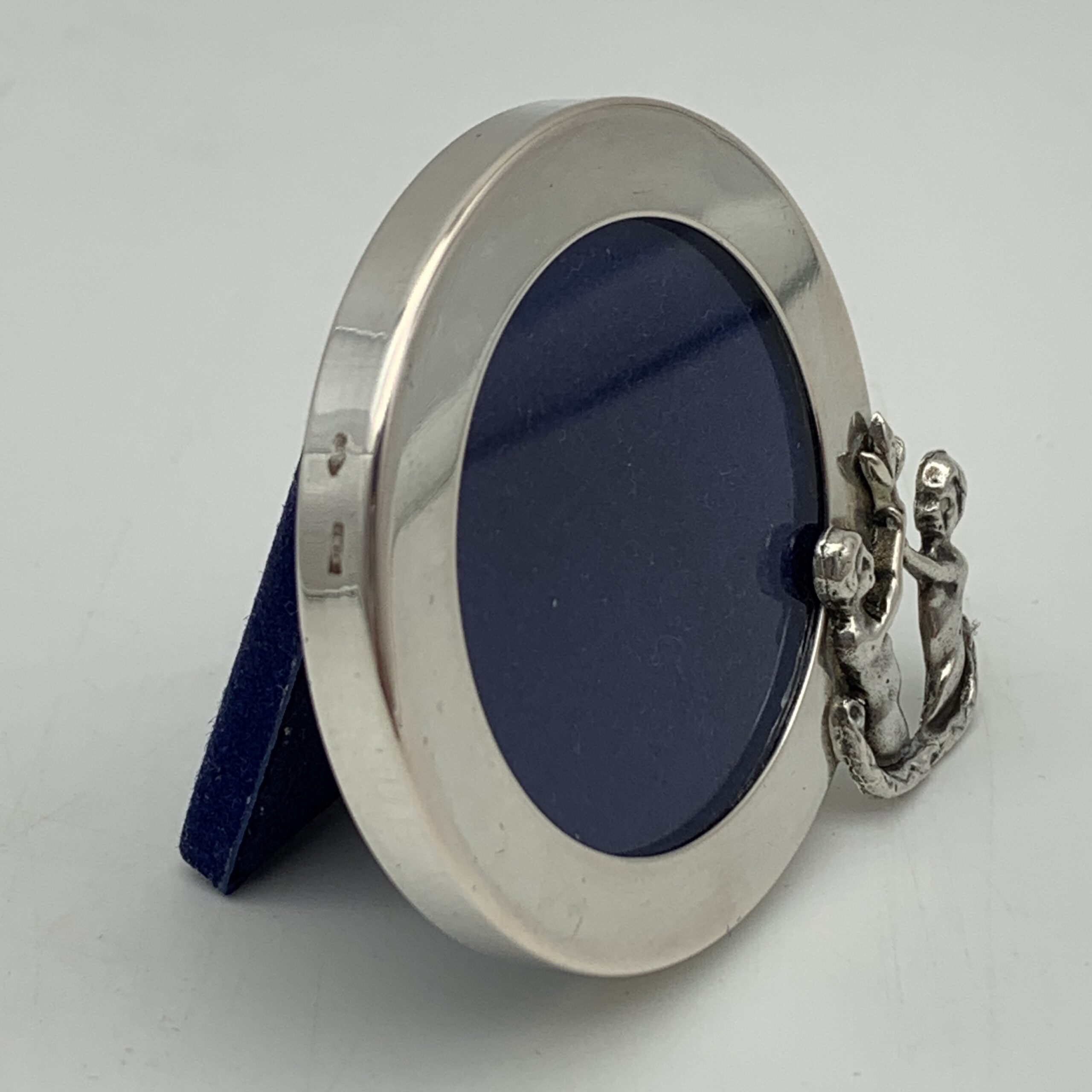 This lovely, small, Italian, solid silver photo frame has a round wide border, with a young couple on the side, cast in silver holding a flower above their heads. The photo frame is in great condition with a blue velvet backing and glass insert. It has an outer diameter of 5cm (6cm with figure), an inner diameter of 3,5cm and is stamped ‘800’ on the side along with the Italian silver hallmark.