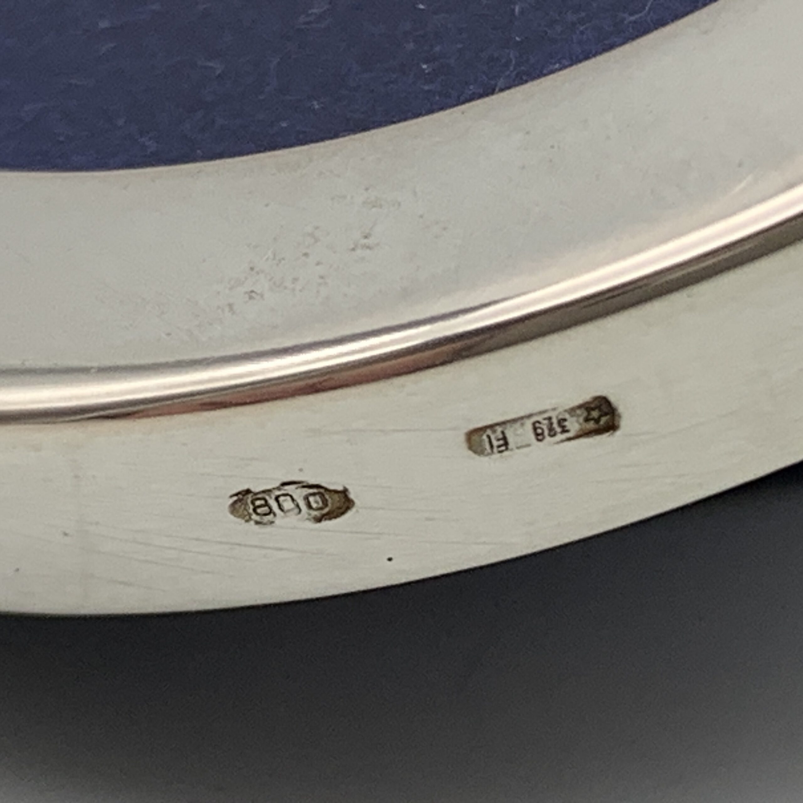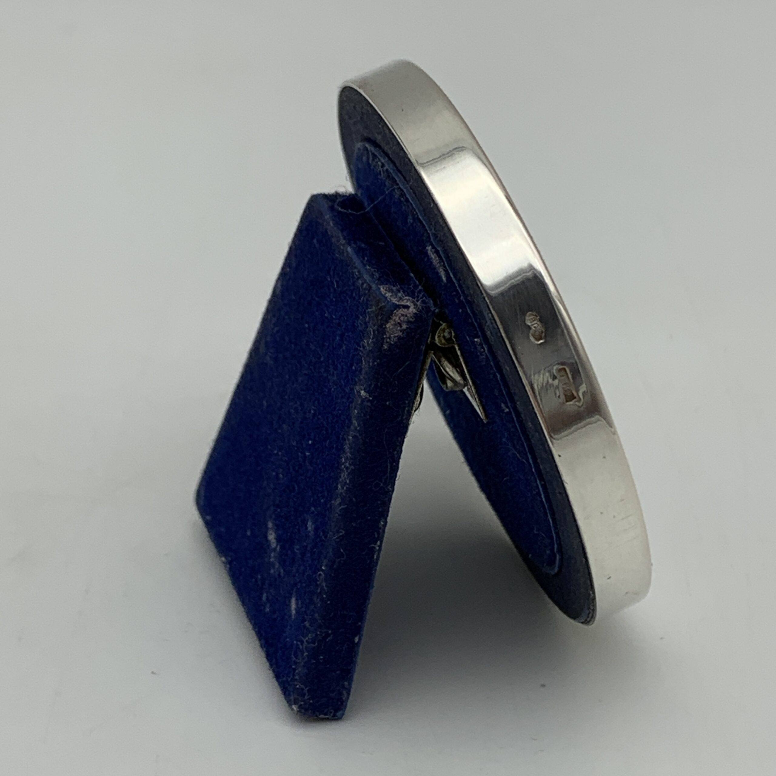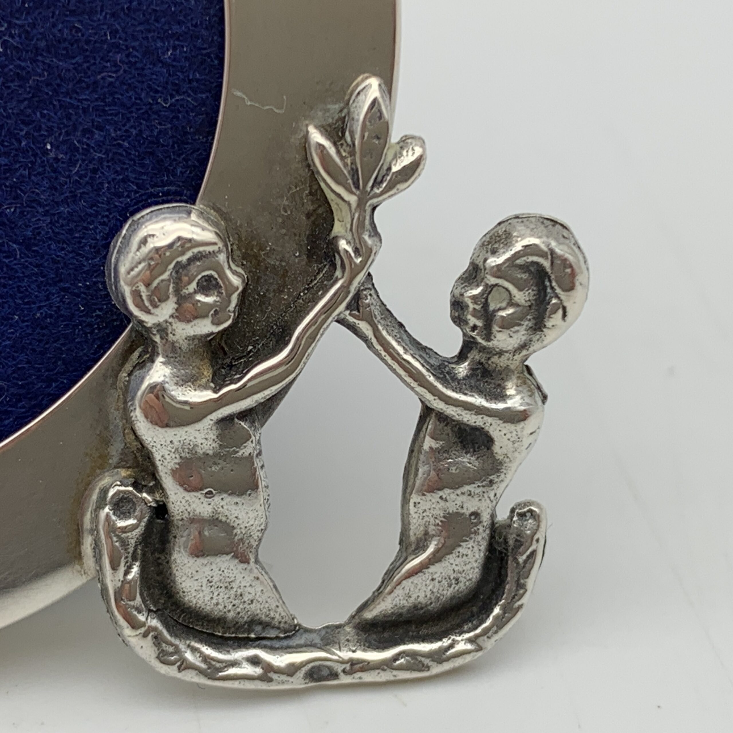 This lovely, small, Italian, solid silver photo frame has a round wide border, with a young couple on the side, cast in silver holding a flower above their heads. The photo frame is in great condition with a blue velvet backing and glass insert. It has an outer diameter of 5cm (6cm with figure), an inner diameter of 3,5cm and is stamped ‘800’ on the side along with the Italian silver hallmark.