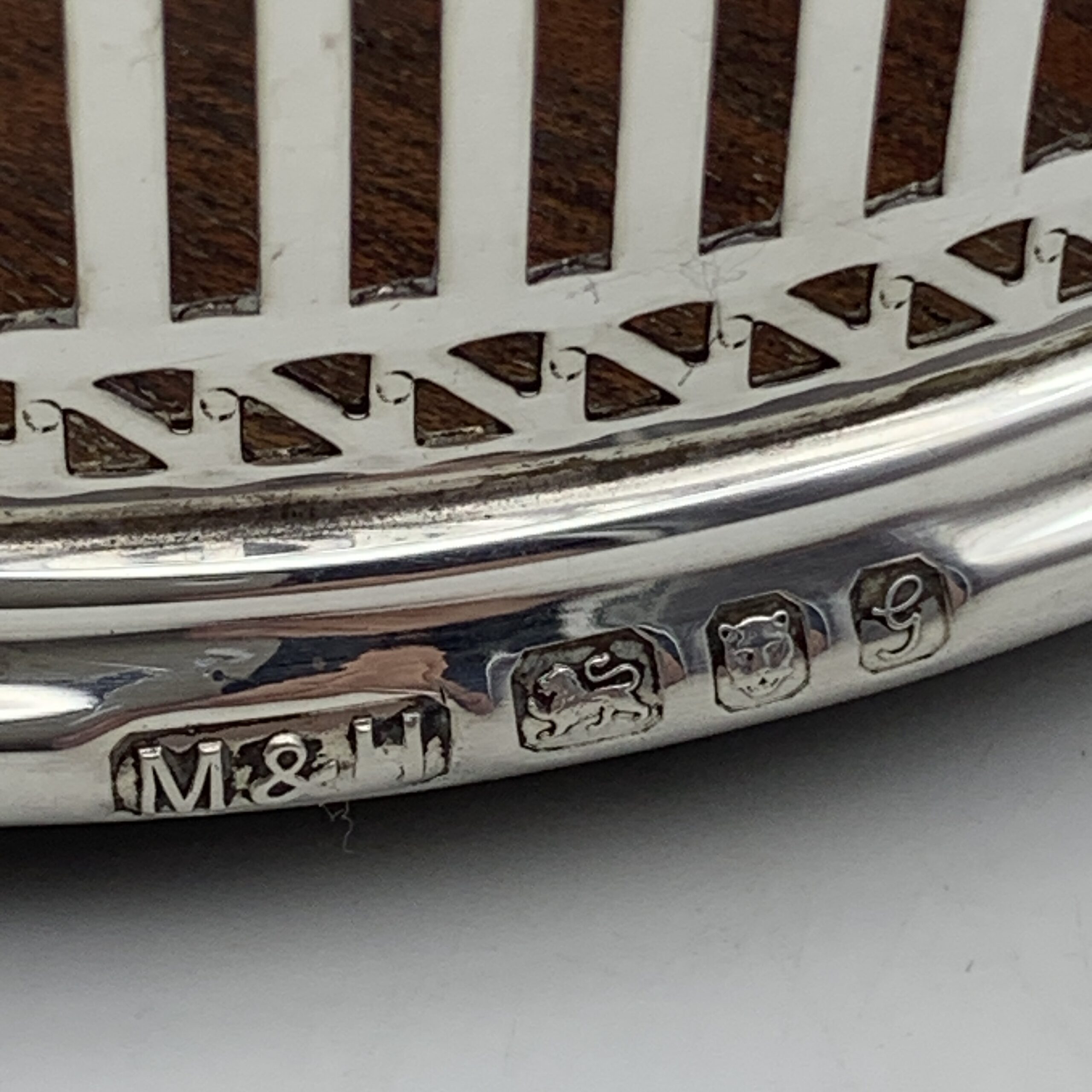 This super quality, vintage pair of solid silver, English hallmarked wine coasters are in excellent condition and were made in 1981 by London silversmiths and retailers ‘Mills & Hersey’ (David Mills & Michael Hersey) with nice clear hallmarks and measures 29cm in length, with a weight 105,2g. The crest or monogram engraved on the handle is of a ‘Wolfs’ head with collar, which I’ve read is the ‘Tighe’ family crest.