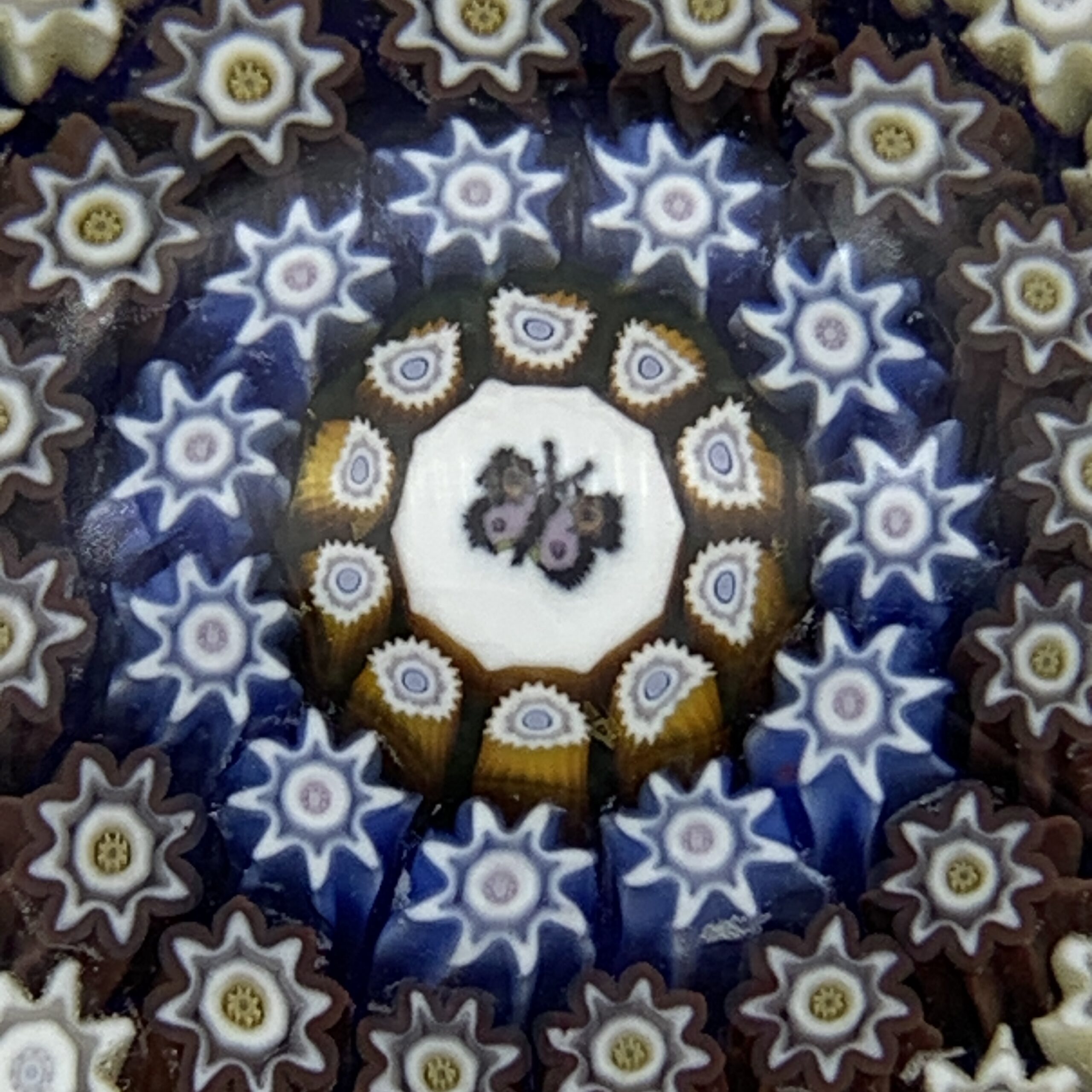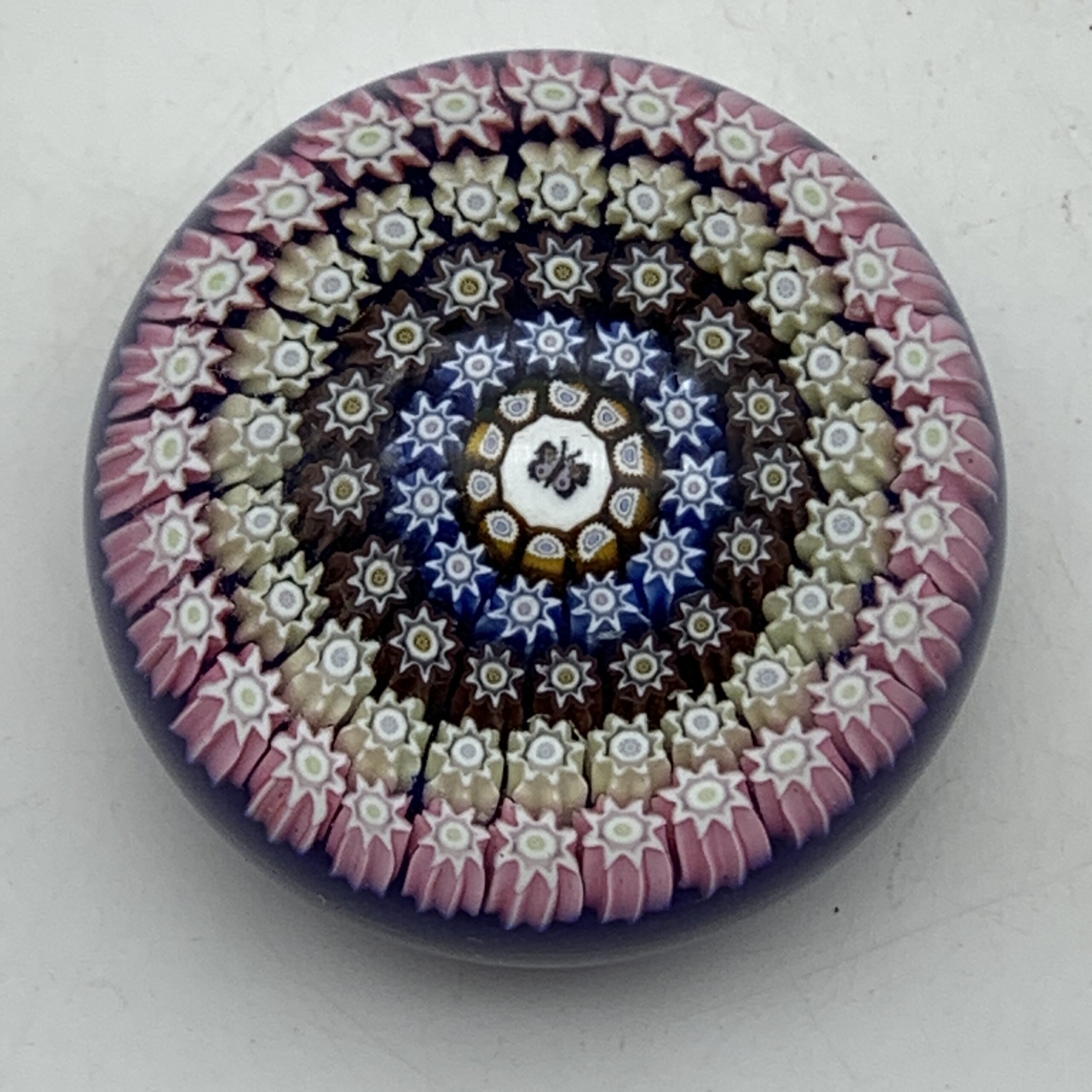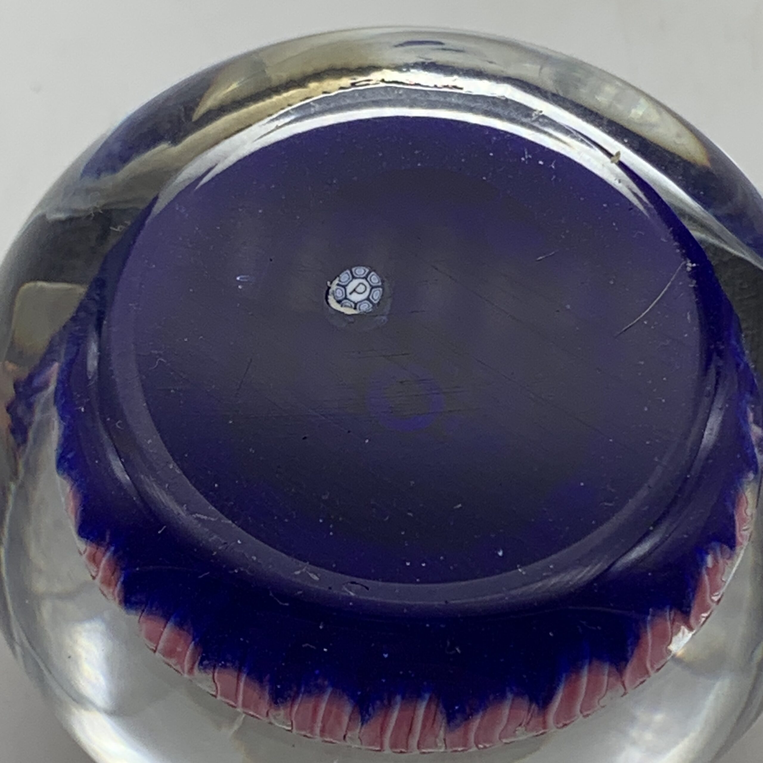 This very collectable, fine quality, small, handmade ‘Perthshire’ art glass (Millefiori & Butterfly) paperweight is in excellent condition and signed with a tiny ‘P’ cane on the base. It features a beautiful millefiori pattern with a central butterfly cane, encircled with five rows of inward pointing, colourful star canes on a blue base. ‘Perthshire Paperweights’ was founded in 1968 by ‘Stuart Drysdale’ in Crieff, Scotland who were well known for their consistent, high-quality work. This lovely paperweight is in excellent condition and measures 5cm in diameter, with a height of 4cm and weighs 152g.