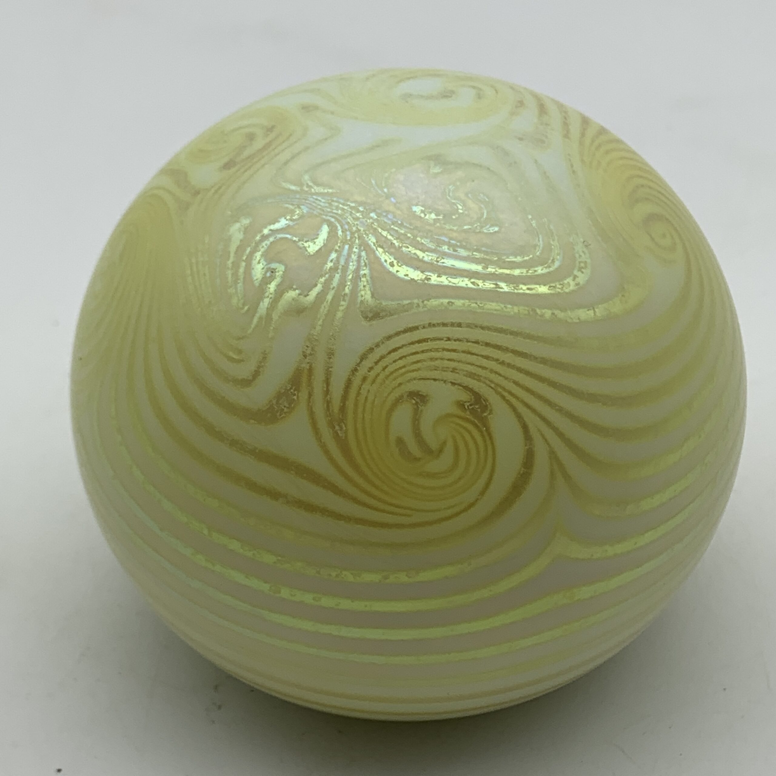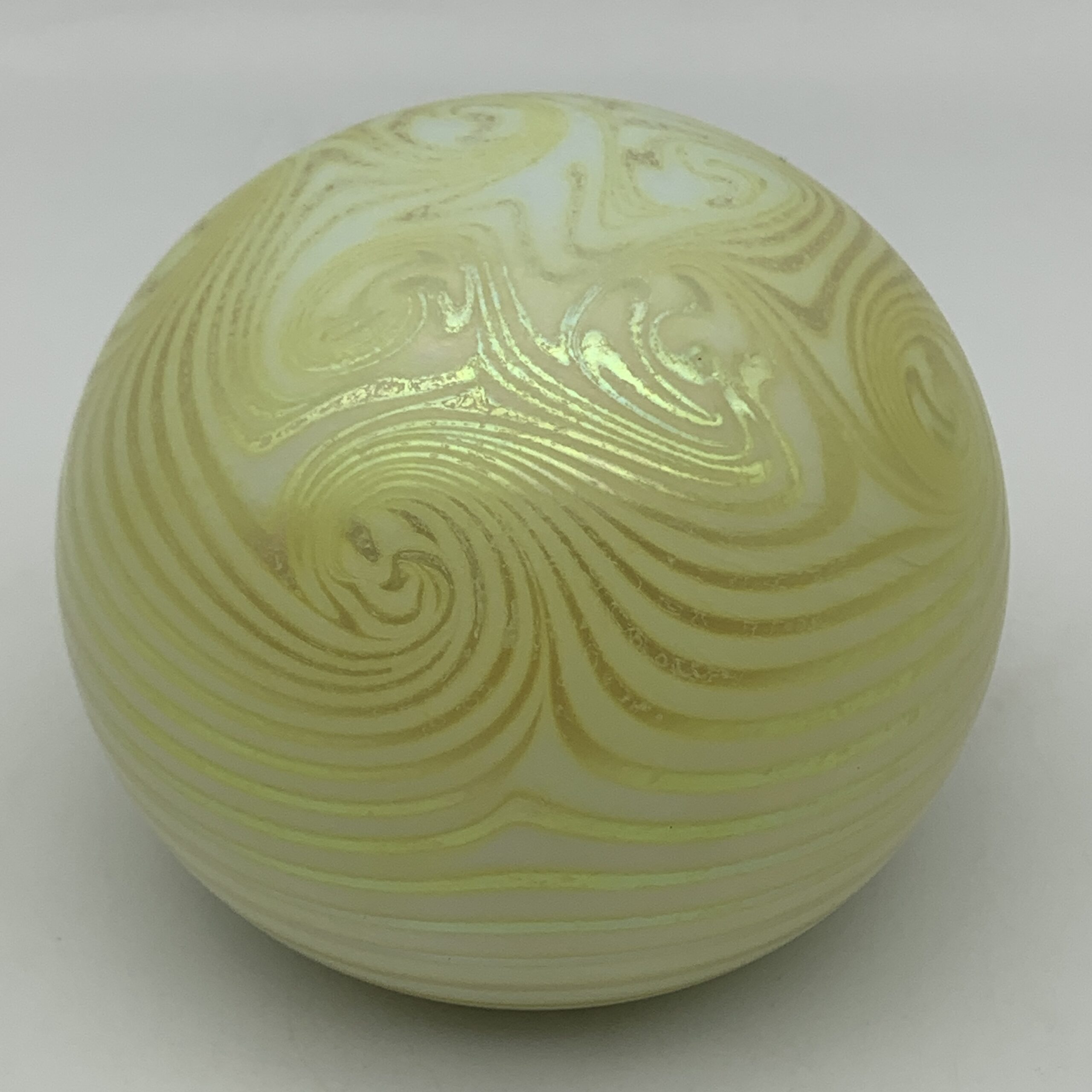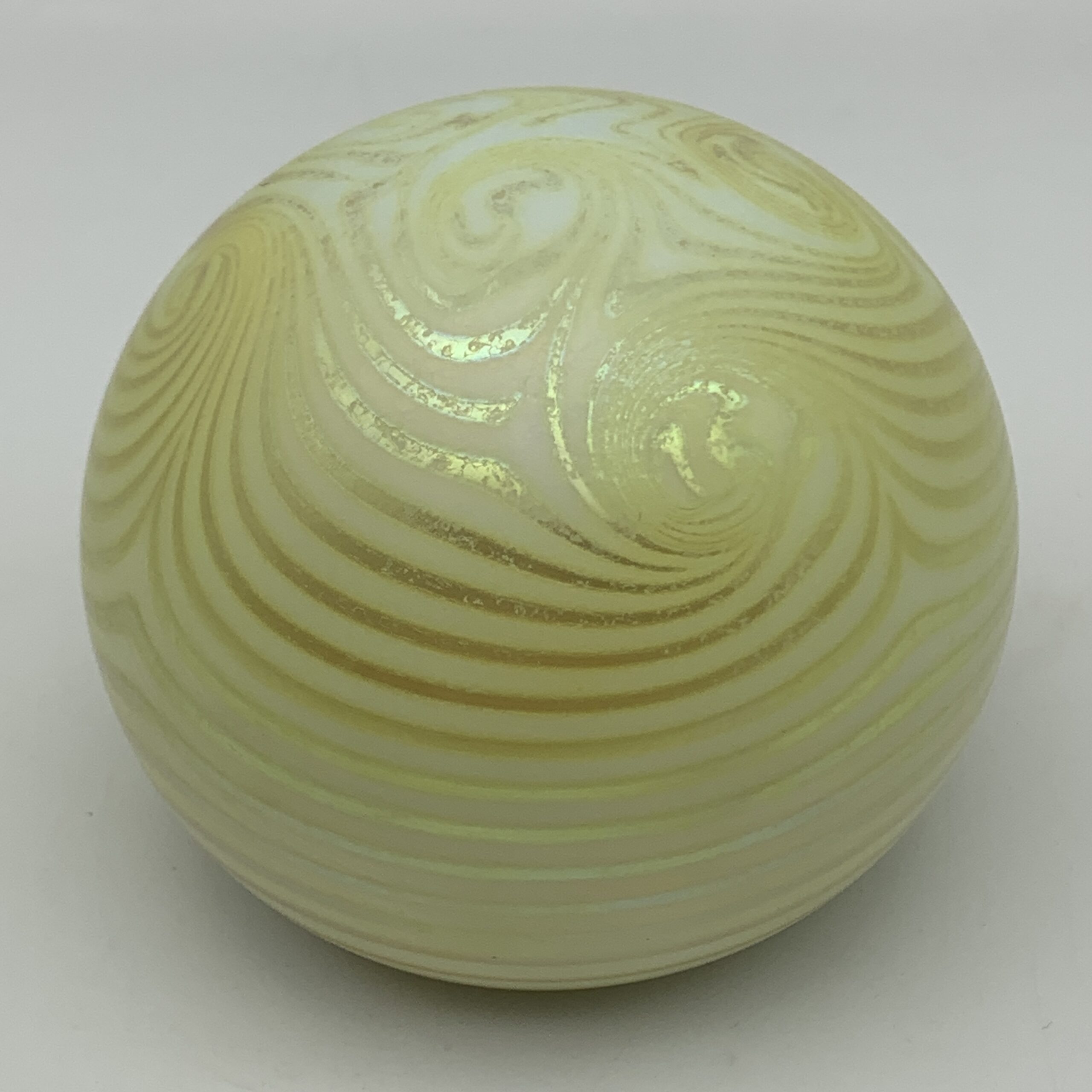 This beautiful 1970’s, ‘Steve Smyers’ art glass paperweight, from his ‘Northern Star Studio’ in California, U.S.A. features feather-like, iridescent yellow swirls against a white background and is signed by the artist ‘S. Smyers’ on the base, along with the studio name ‘Northern Star’ and the number ’76 D9’. This lovely paperweight is in excellent condition and stands 6cm high, with a diameter of 7cm and weighs 495g.