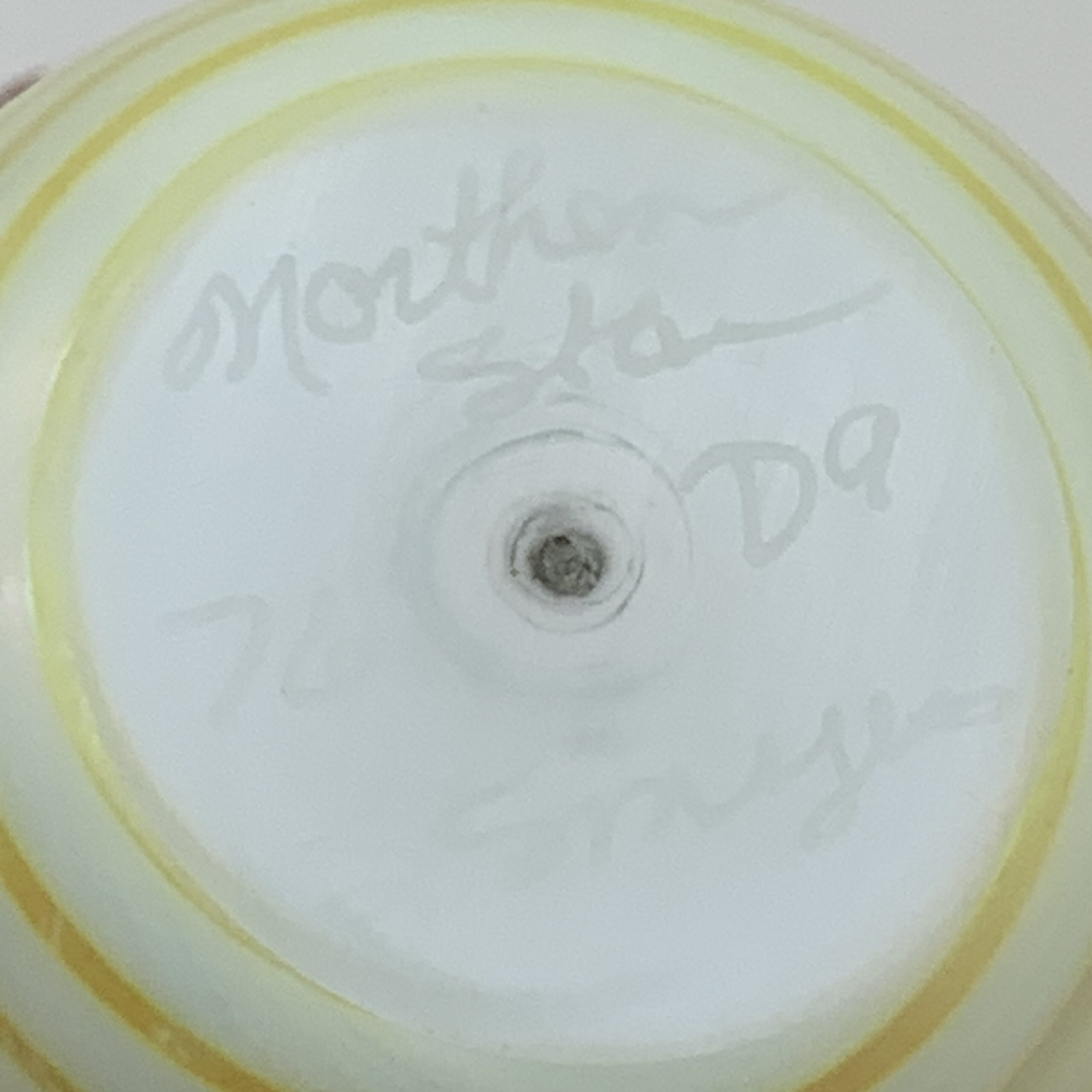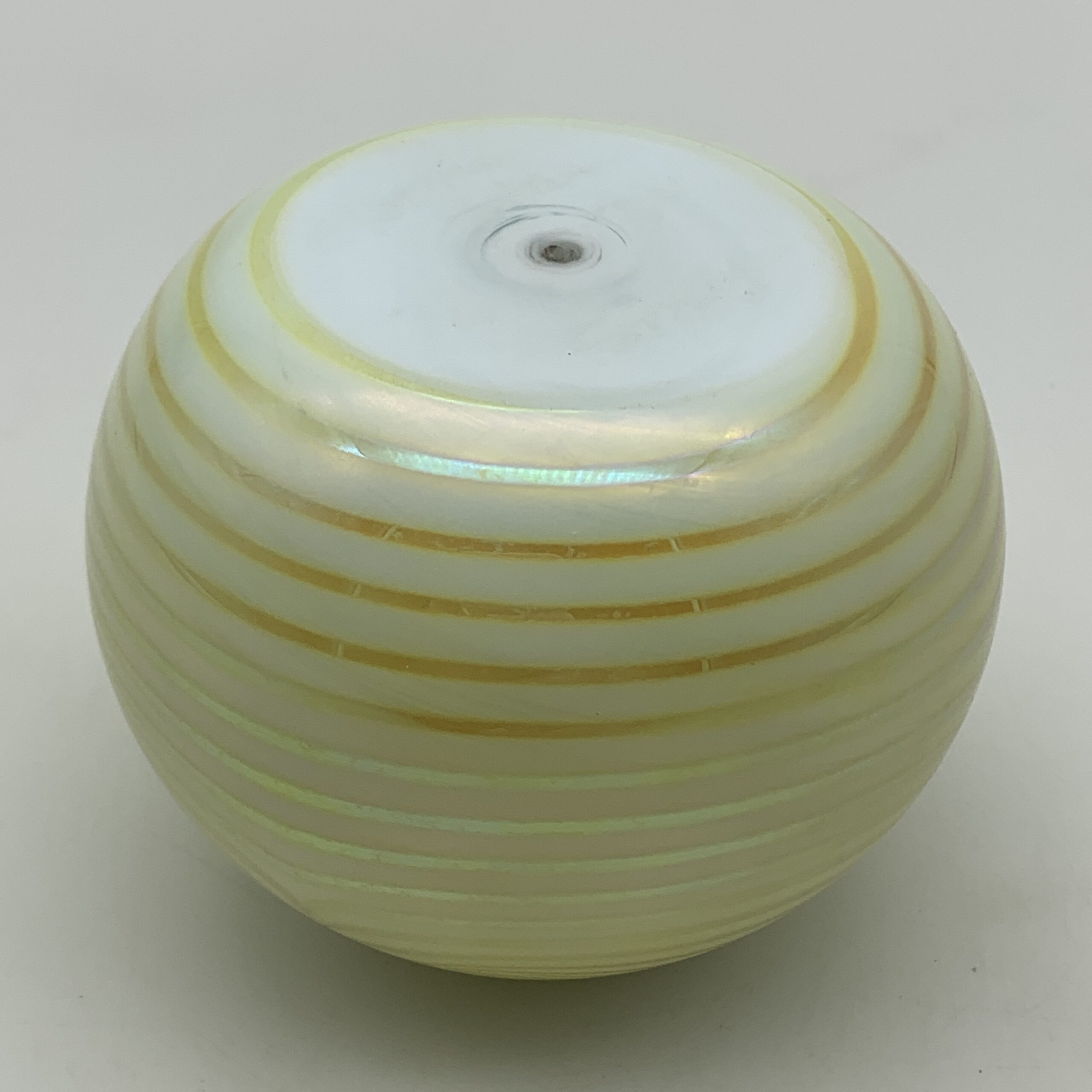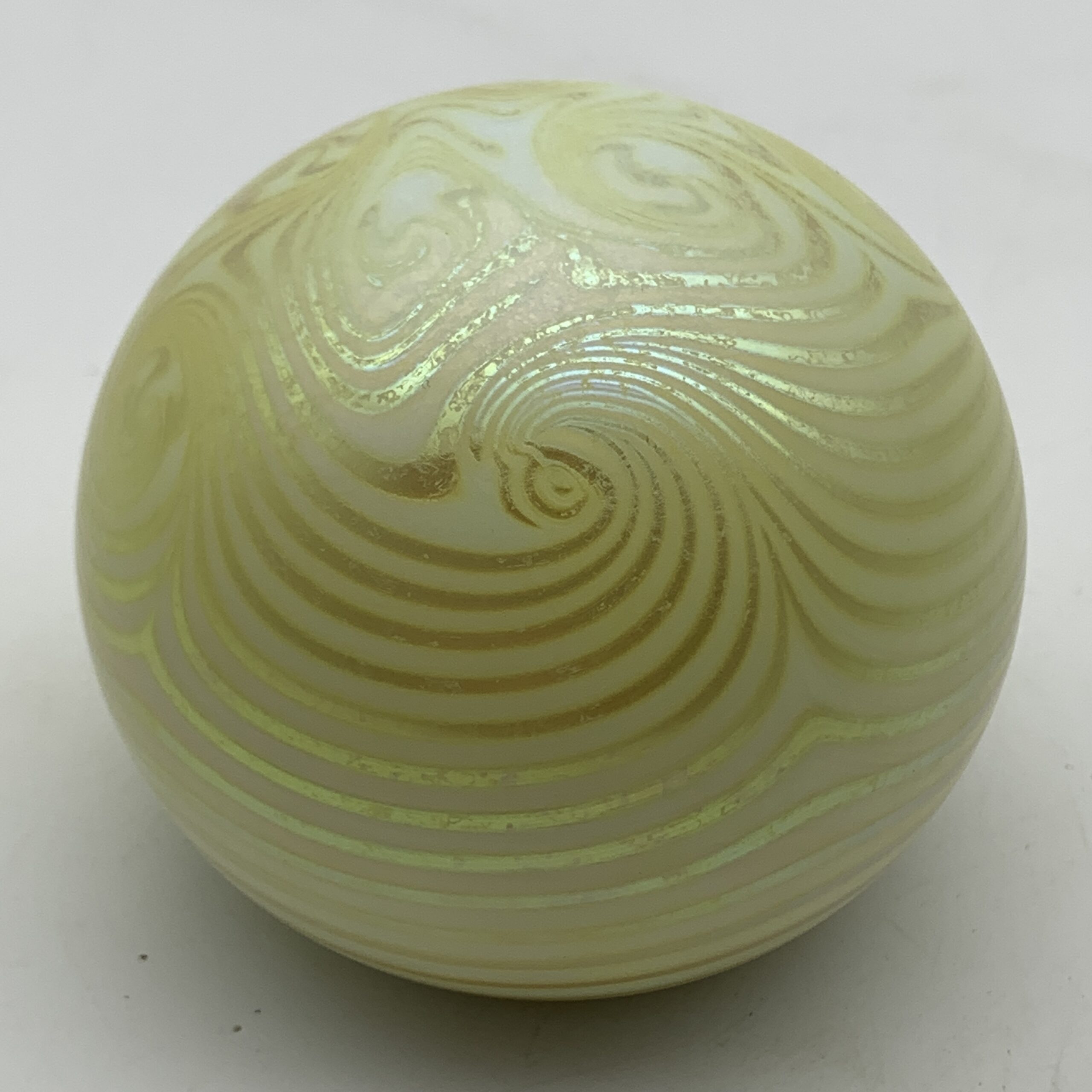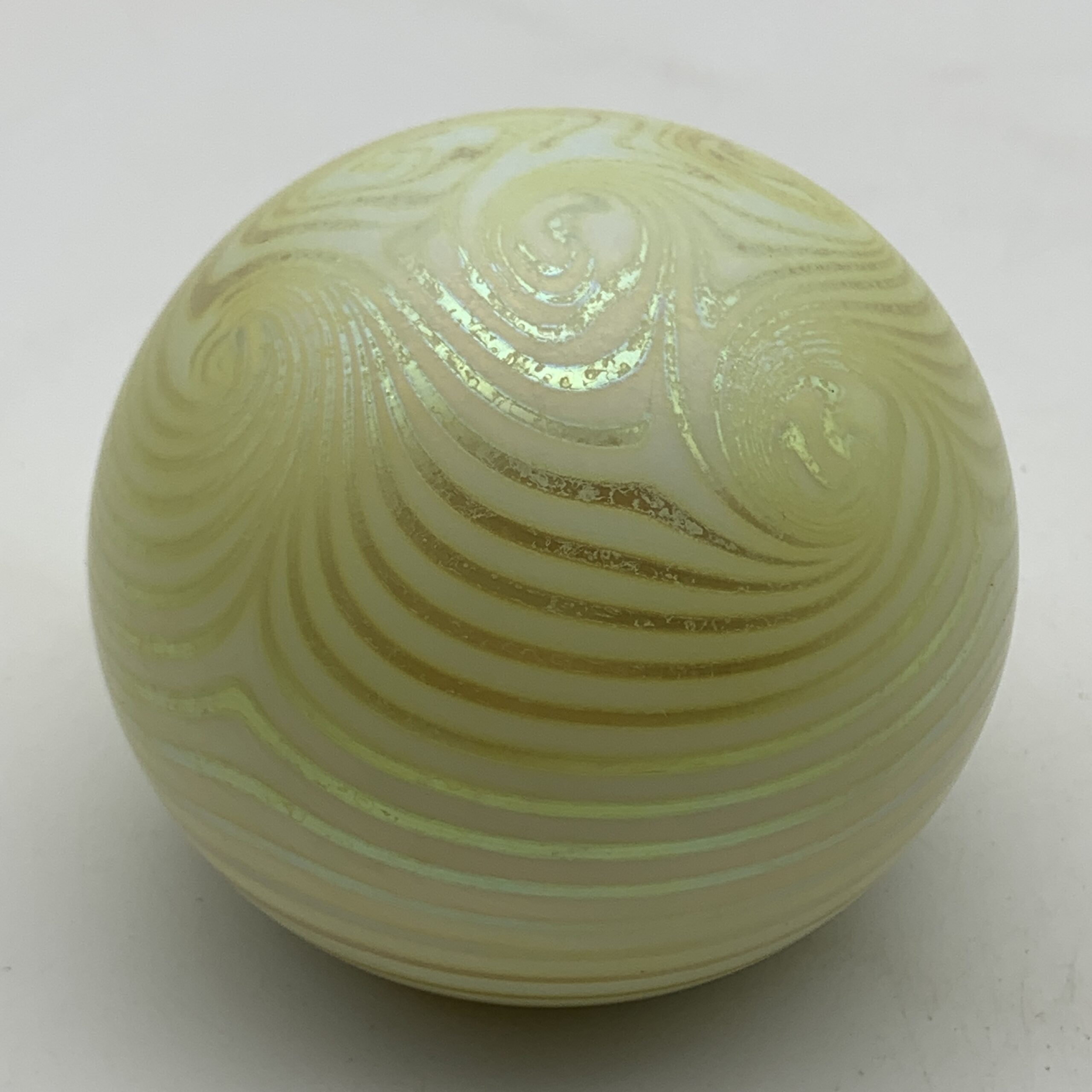 This beautiful 1970’s, ‘Steve Smyers’ art glass paperweight, from his ‘Northern Star Studio’ in California, U.S.A. features feather-like, iridescent yellow swirls against a white background and is signed by the artist ‘S. Smyers’ on the base, along with the studio name ‘Northern Star’ and the number ’76 D9’. This lovely paperweight is in excellent condition and stands 6cm high, with a diameter of 7cm and weighs 495g.
