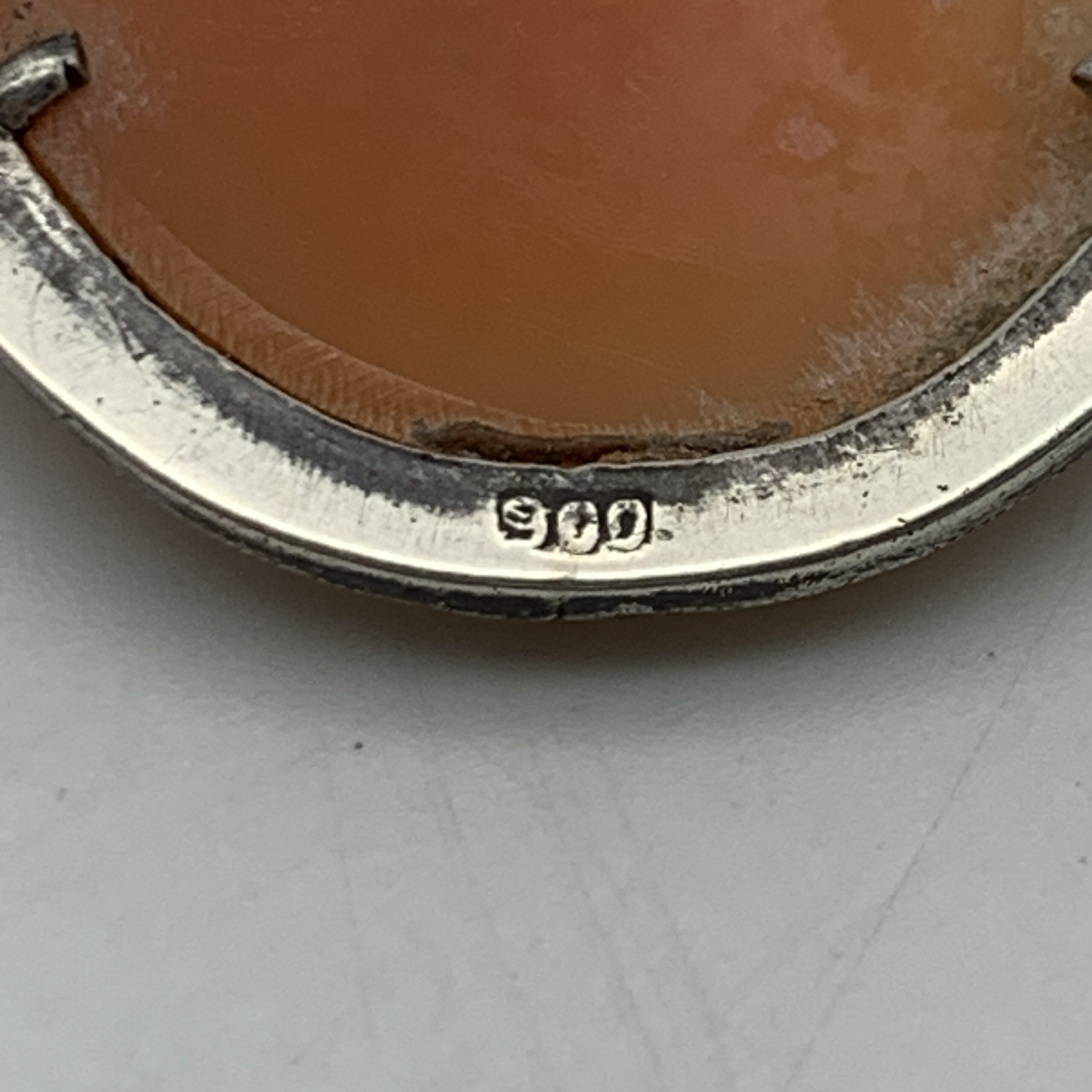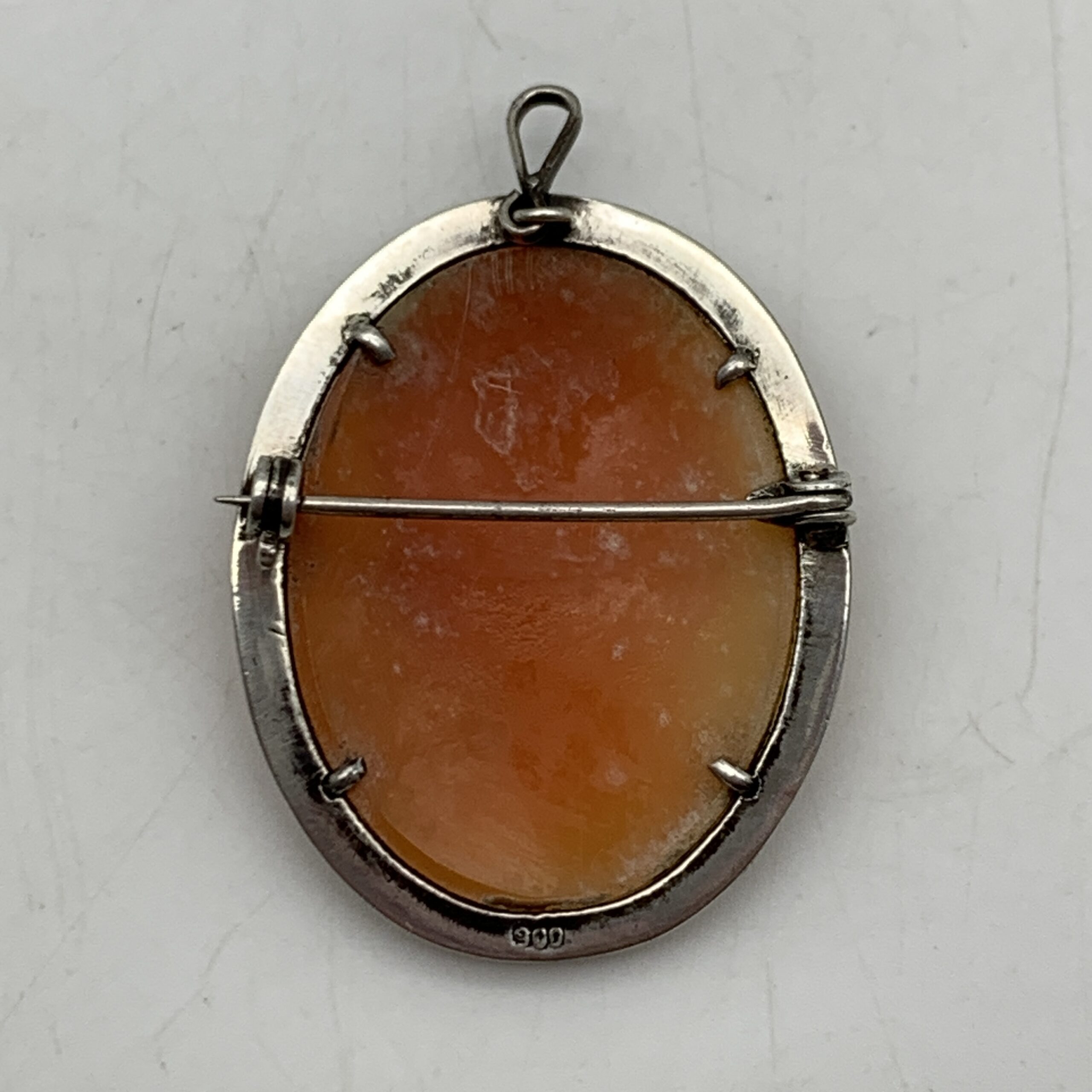 This lovely, early 1950/60’s silver cameo brooch/pendant features a beautiful, hand-carved portrait of a young lady in fine detail and can be worn as a brooch or pendant. It’s mounted in an oval solid silver frame, with a pretty border set with a row of marcasite stones and is stamped ‘900’ on the back for purity of silver (900/1000). The brooch is in excellent condition with a secure pin and roll-over clasp, with a small hanger for a chain, and measures 3,5cm x 2,7cm with a weight of 6g.