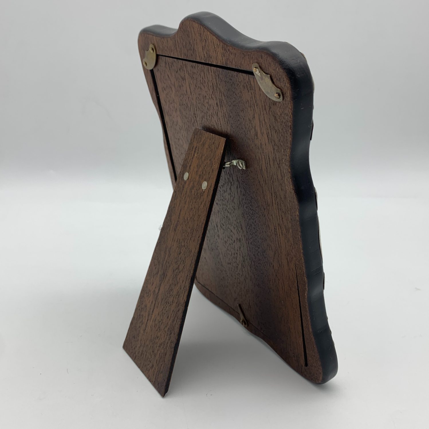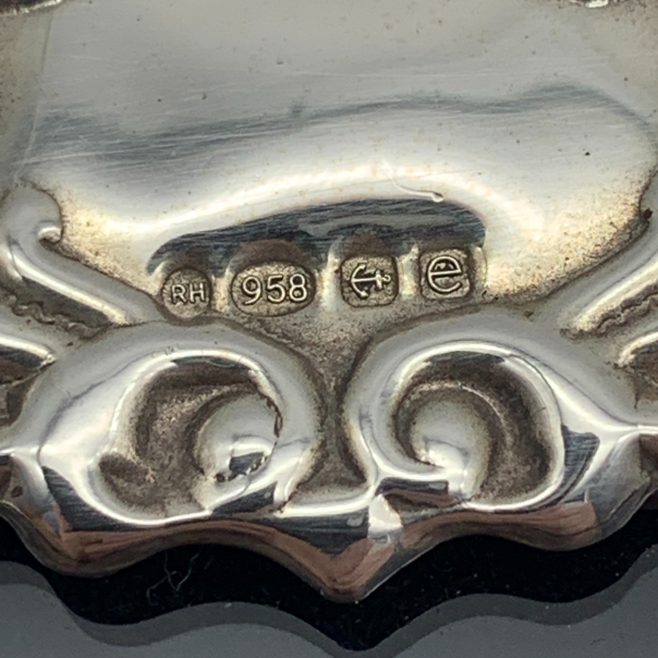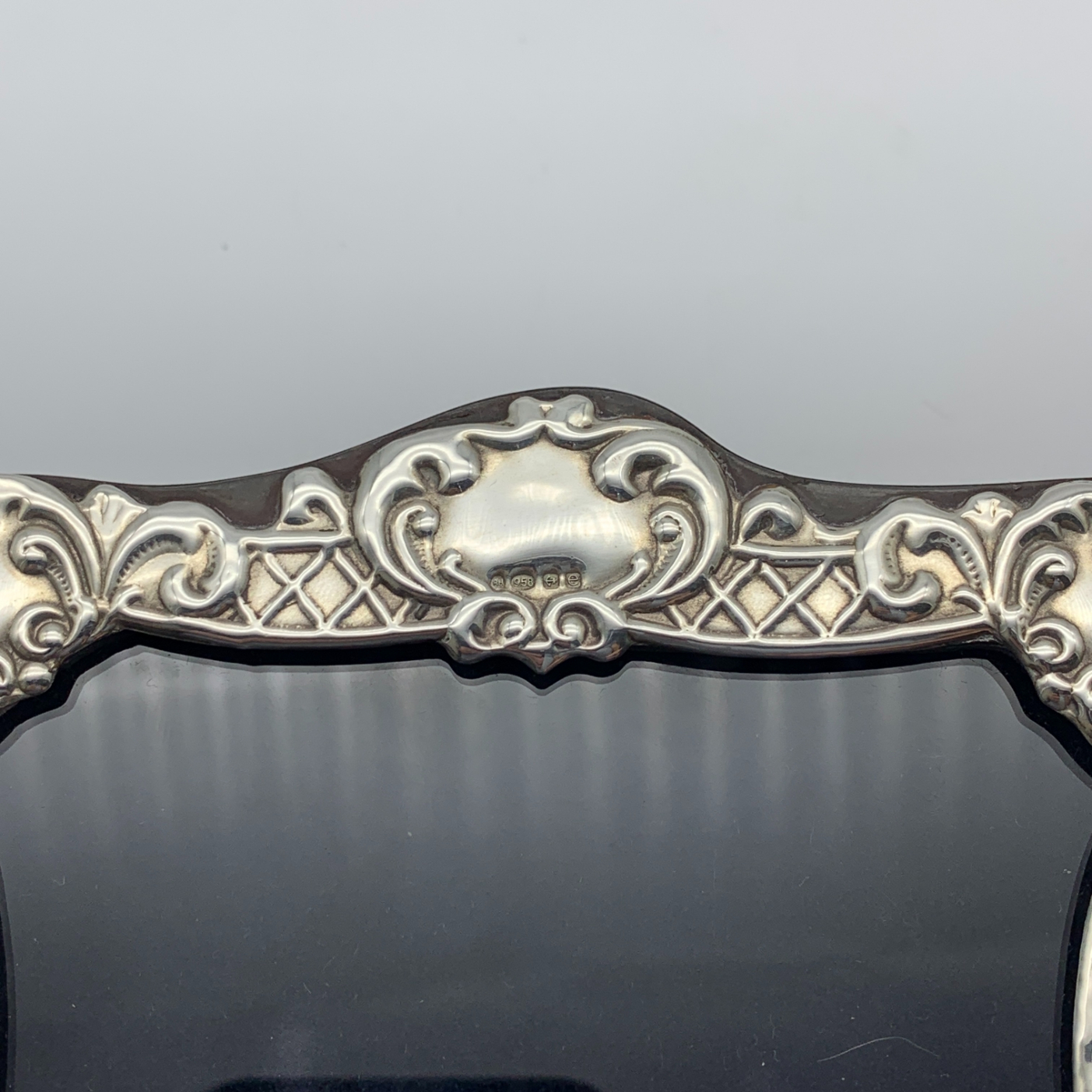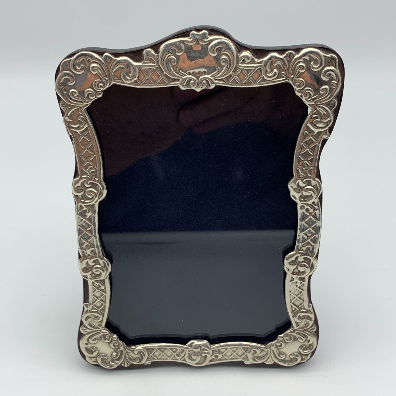 This good quality, solid Britannia (.958) silver photo frame has an attractive Celtic feel, decorated border with a blank cartouche at the top. It was made in 2004 in Birmingham by silversmiths ‘Ray Hall’ (RH) and measures 17,5cm x 12,5cm, with an inner measurement of 14cm x 10cm. This lovely easel and wooden backed photo frame is in excellent condition with clear hallmarks and weighs 180g.