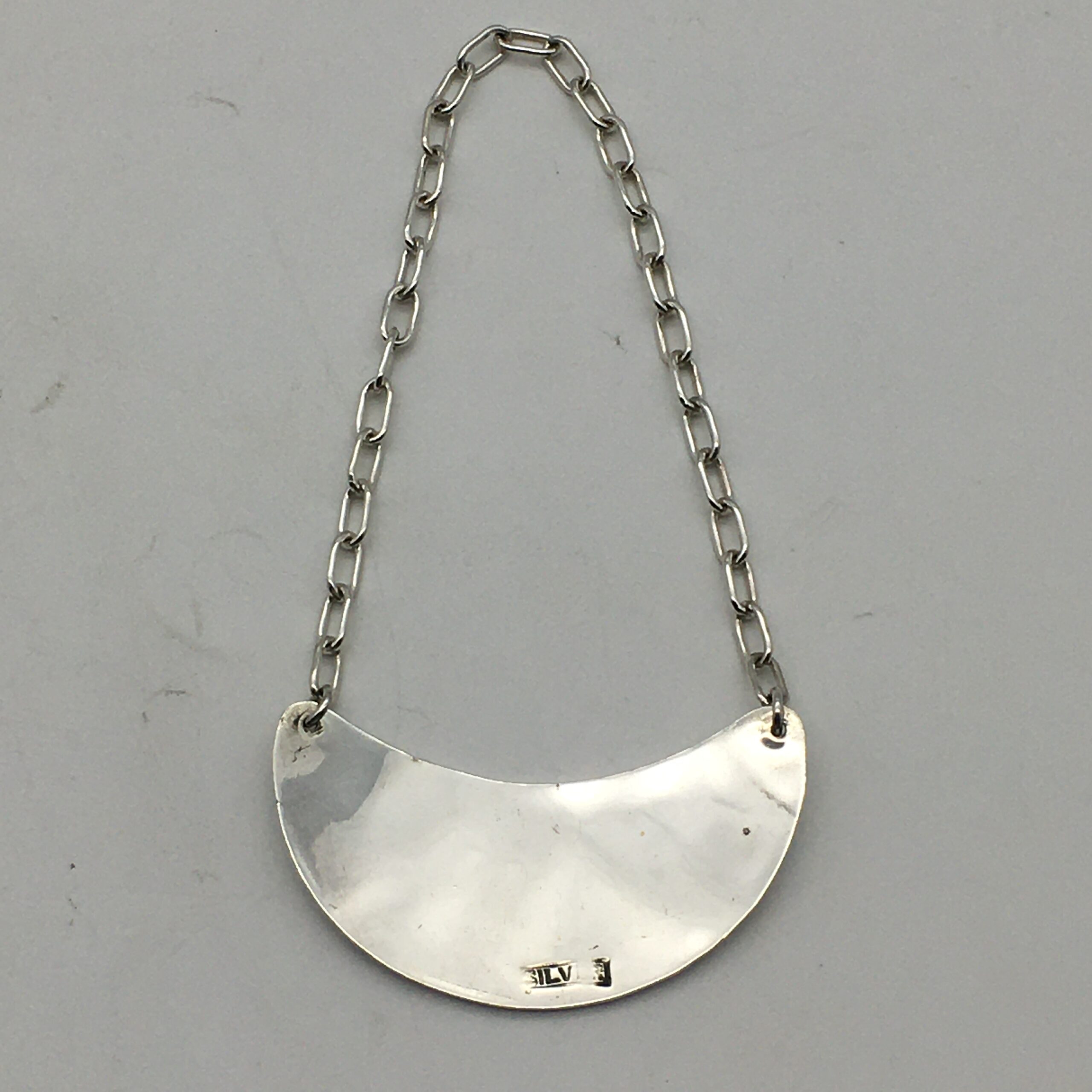 This early, good quality, solid silver decanter label has a lovely crescent shape with ‘Brandy’ engraved in the centre. It is stamped ‘SILVER’ on the back, measures 5cm x 2,3cm, weighs 10g and is in excellent condition.