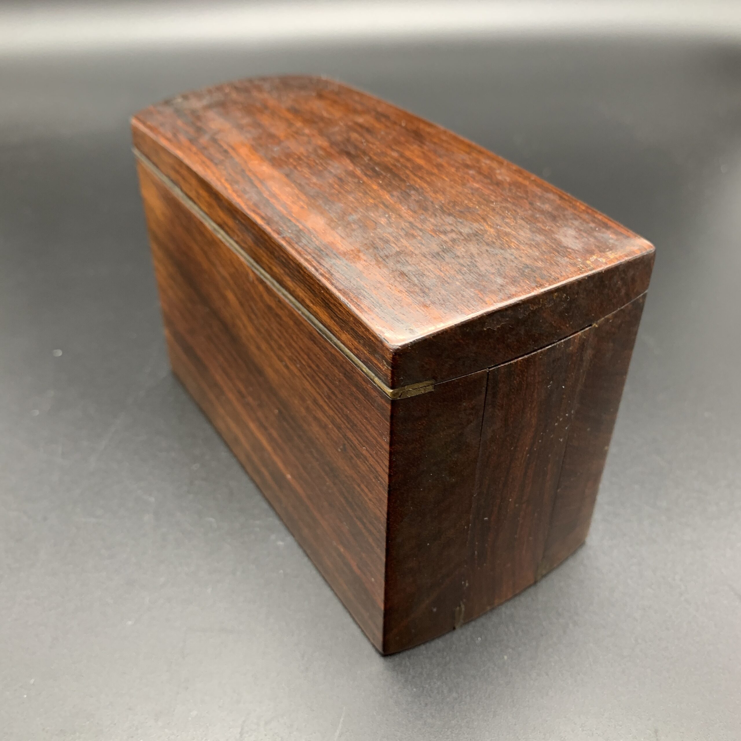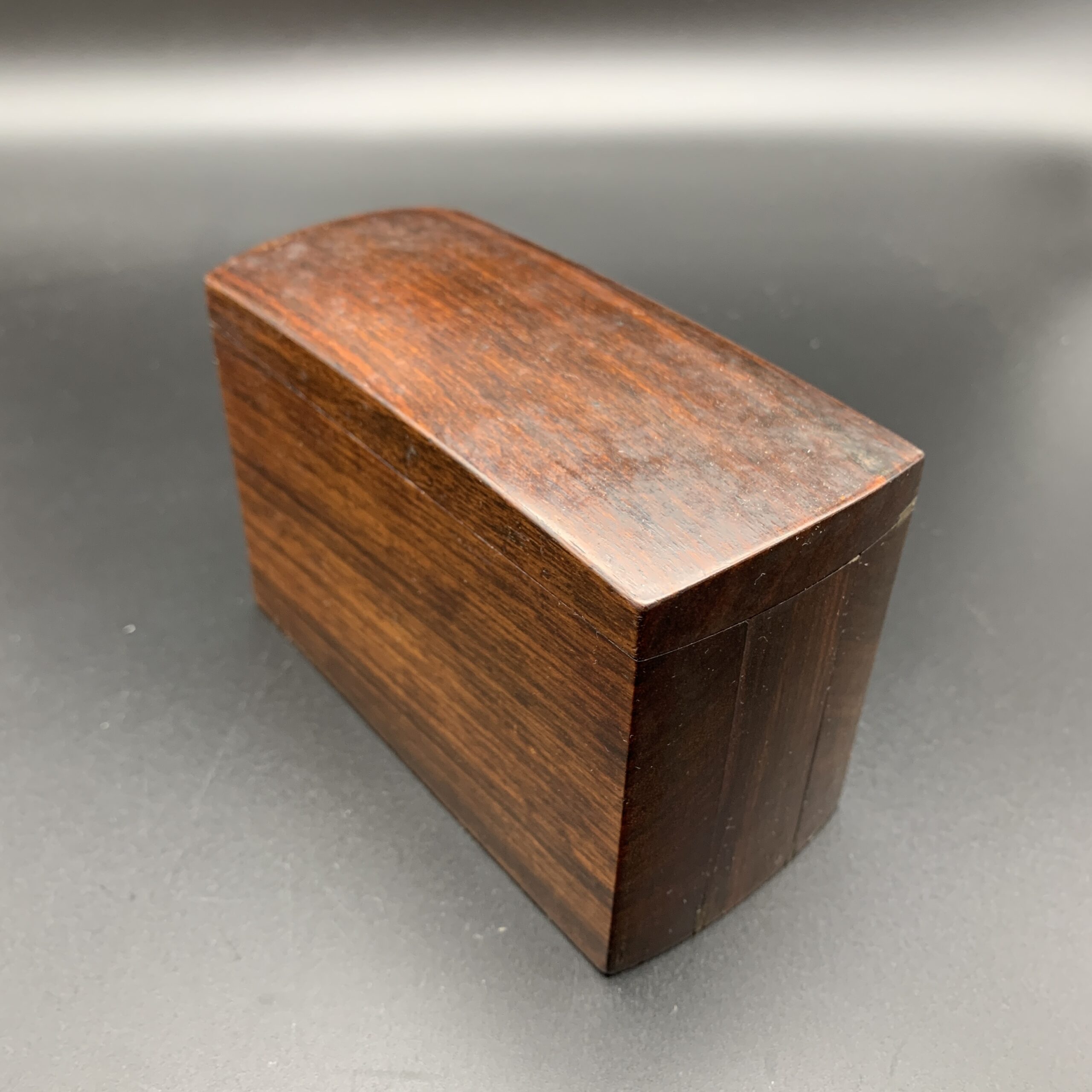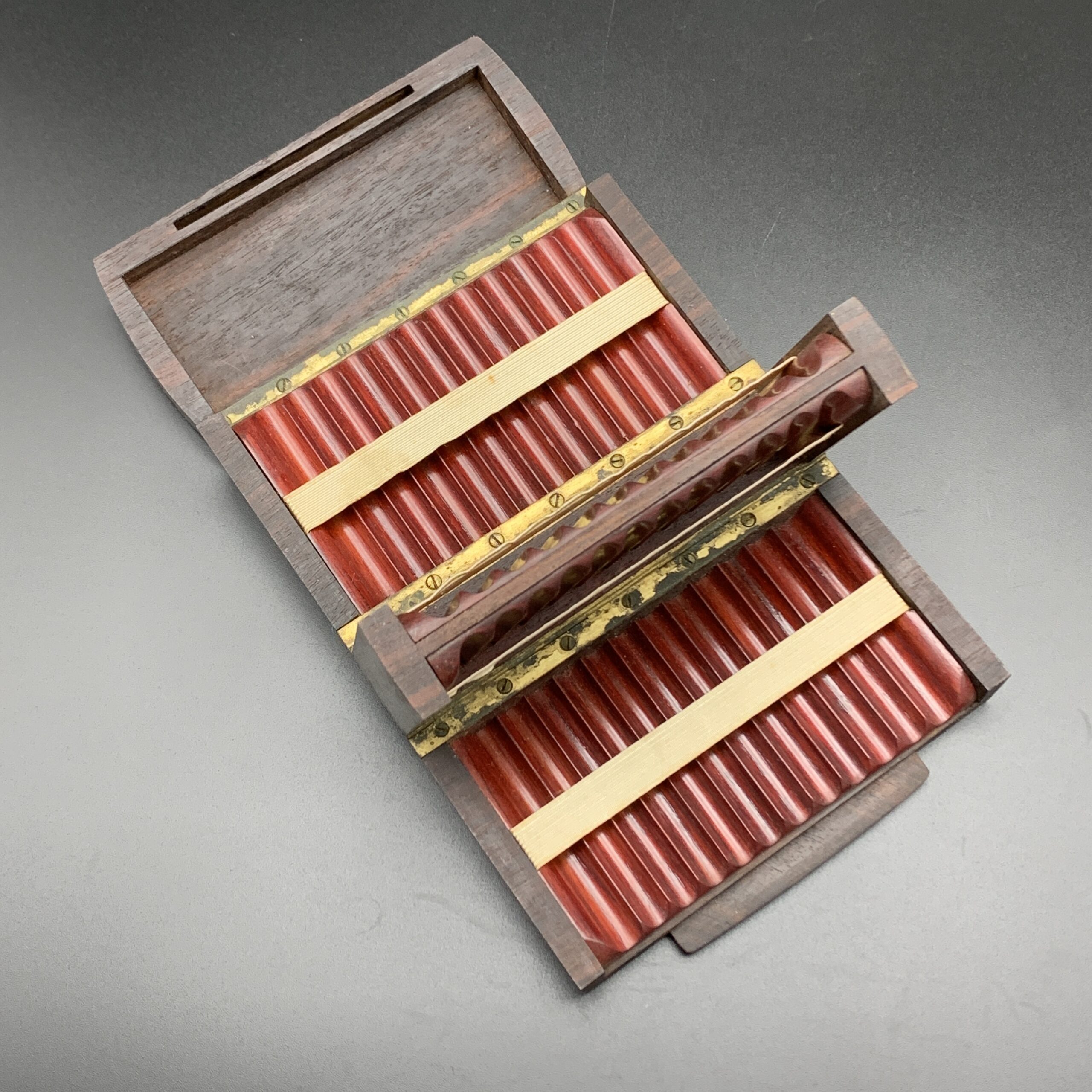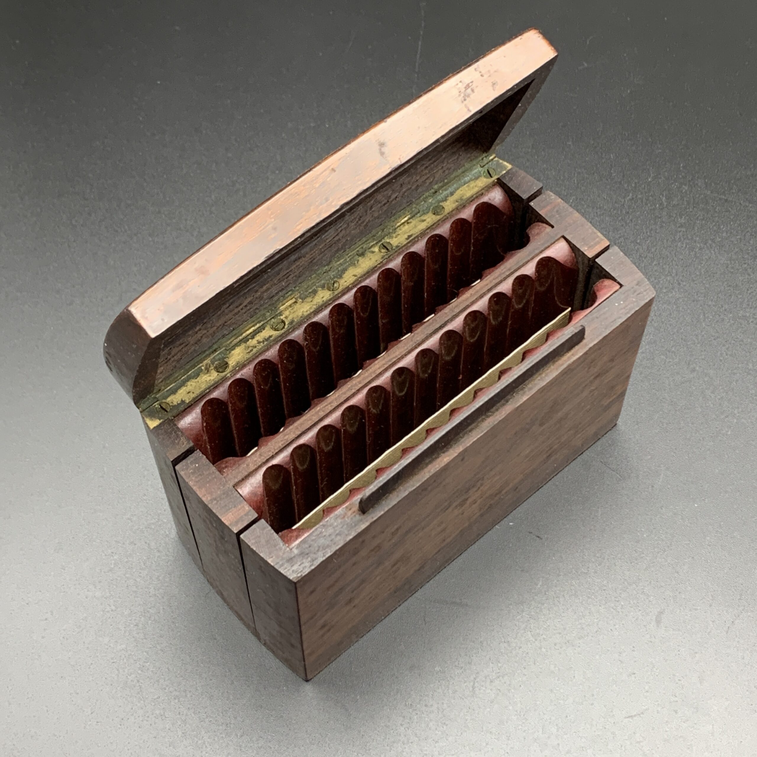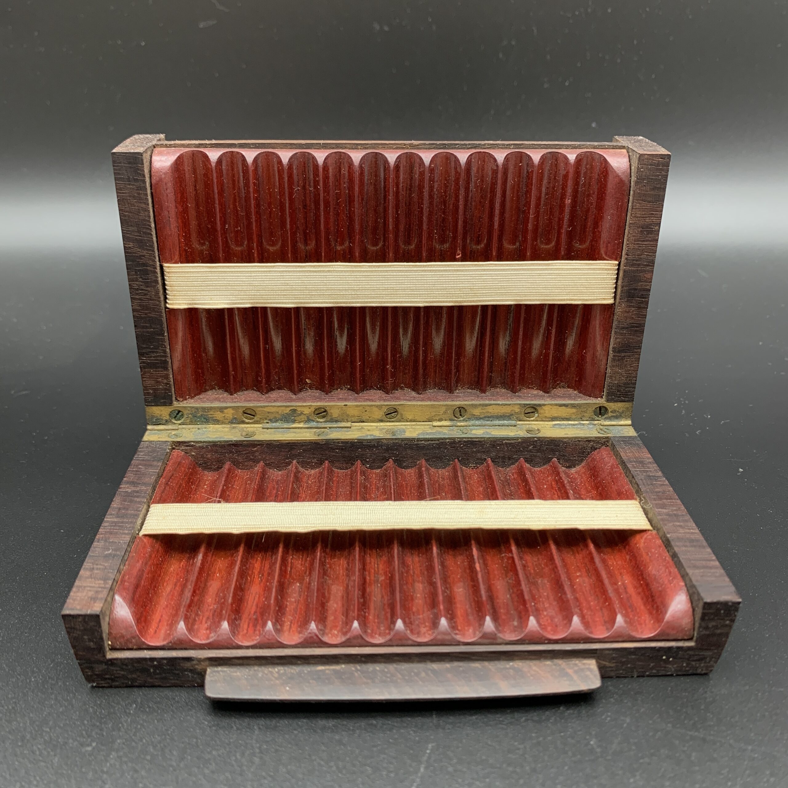 This early, very well-made travelling cigarette box from the 1940/50’s, is made up of four hinged parts which fold together and close tightly with the help of a ‘tongue-in-groove’ type catch, making the box compact and airtight. It’s made from a solid dark wood with a lovely grain and colour and measures, when closed 12,2cm x 6cm, stands 8,5cm high and weighs 338g. This wonderful box is in great condition, holds up to forty-eight cigarettes and functions well.