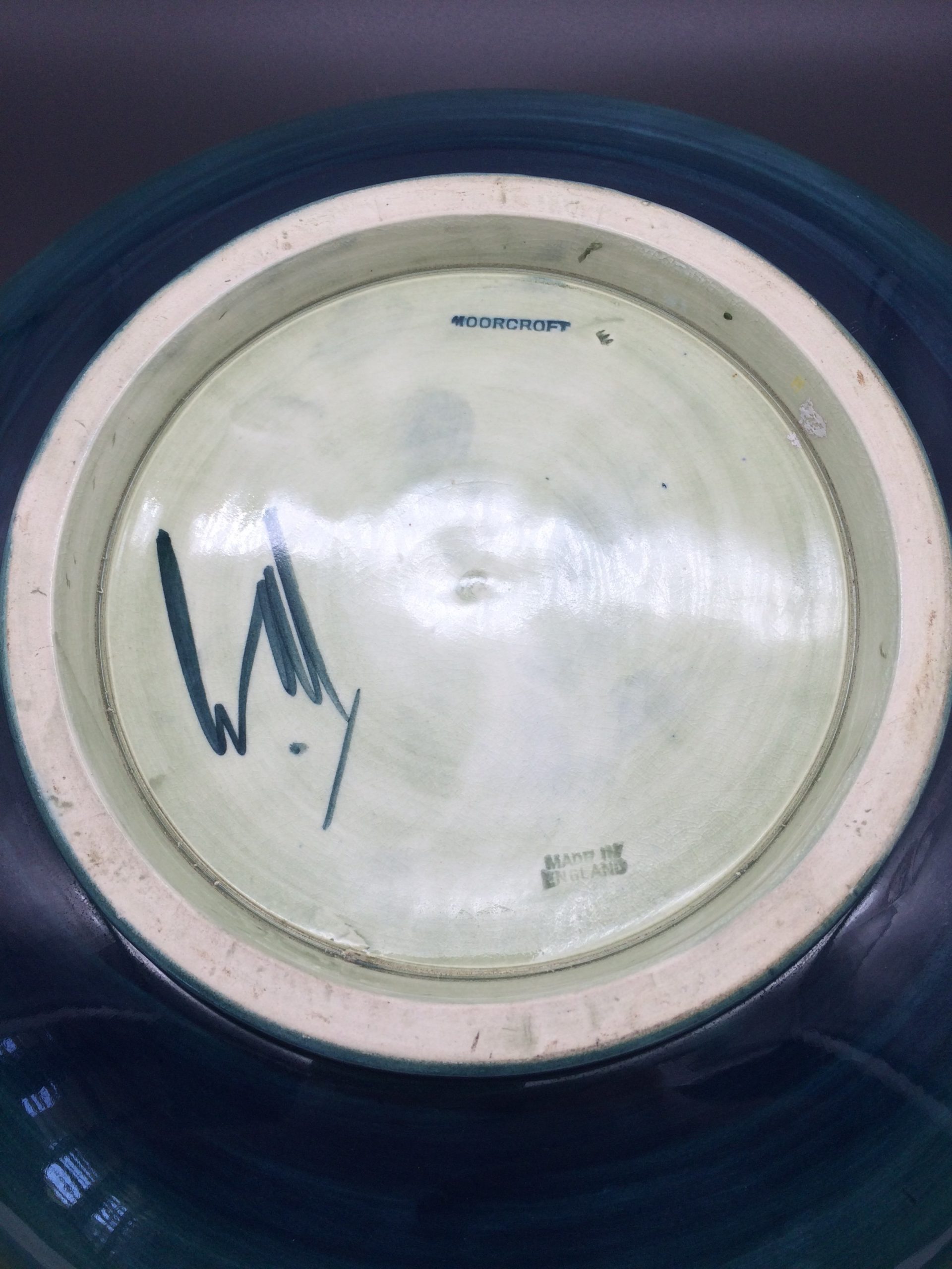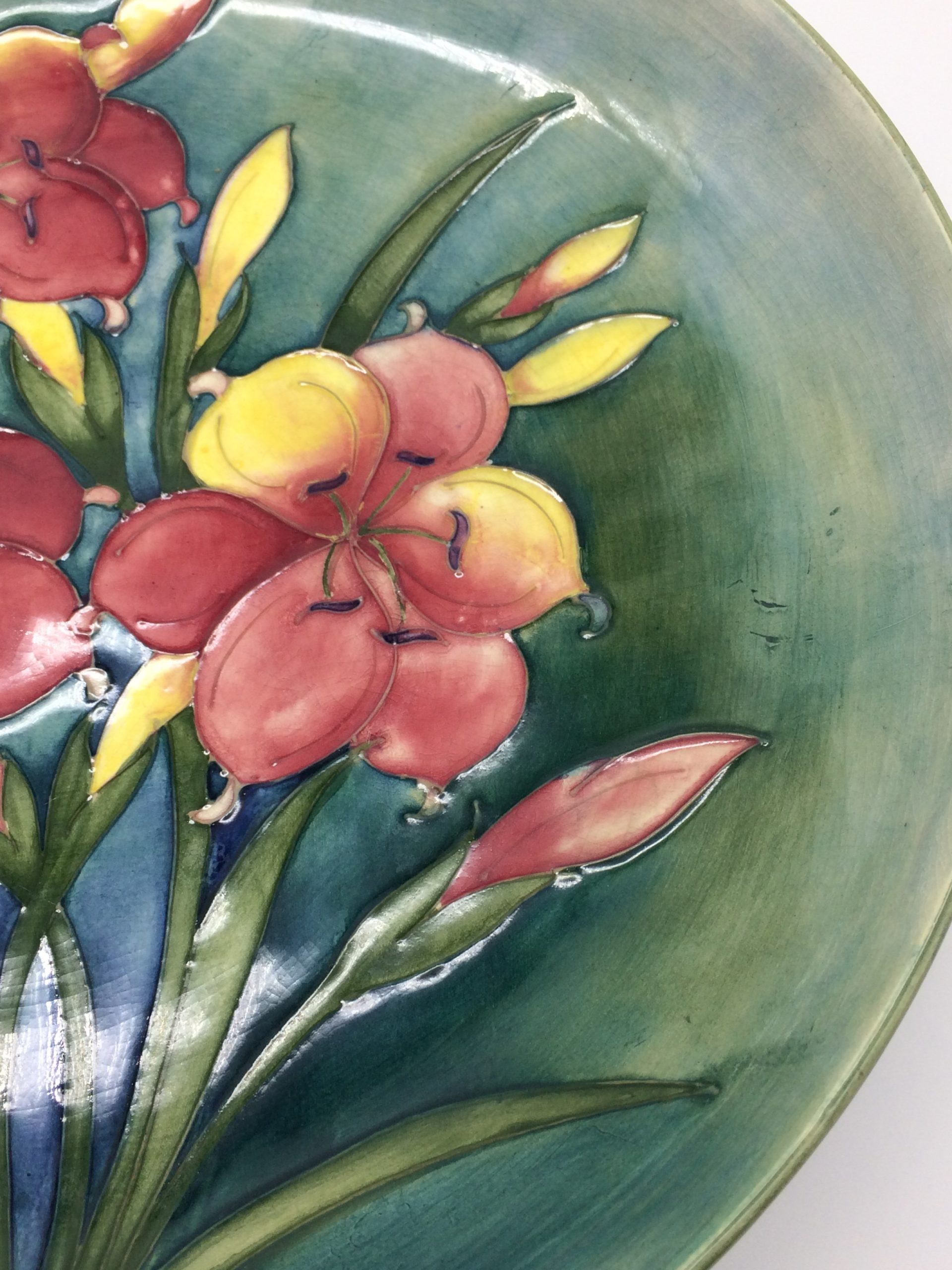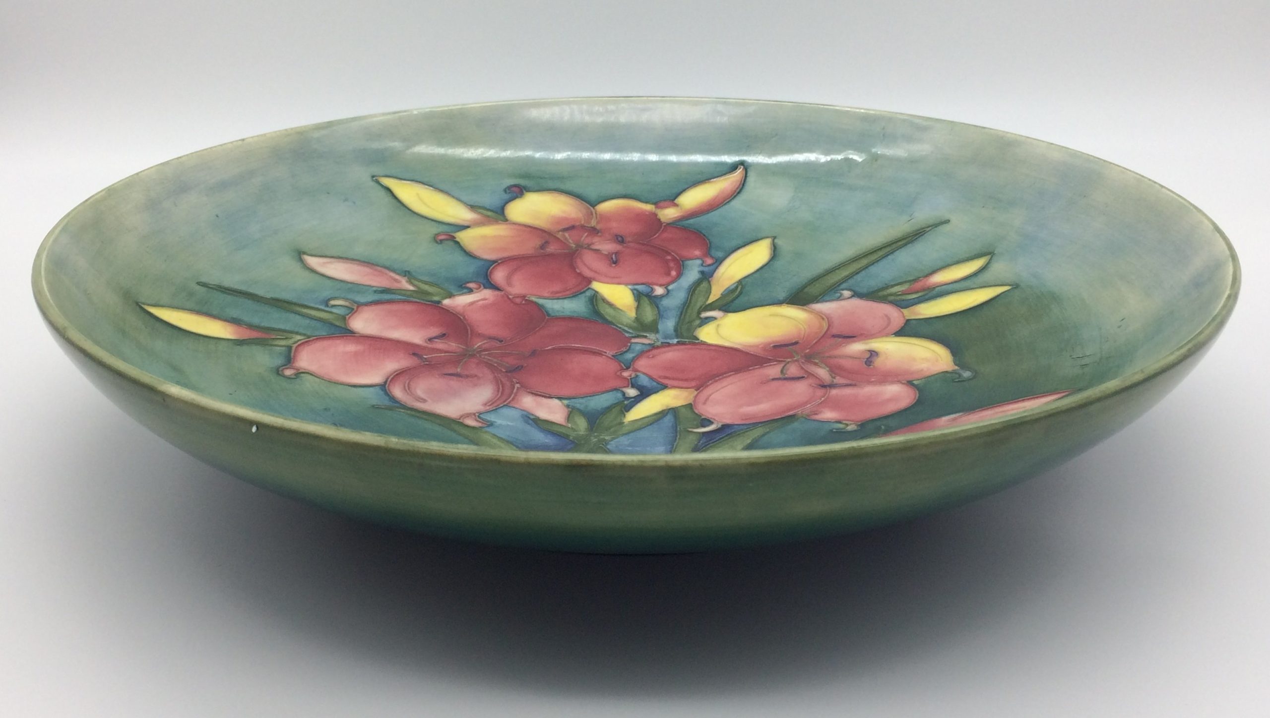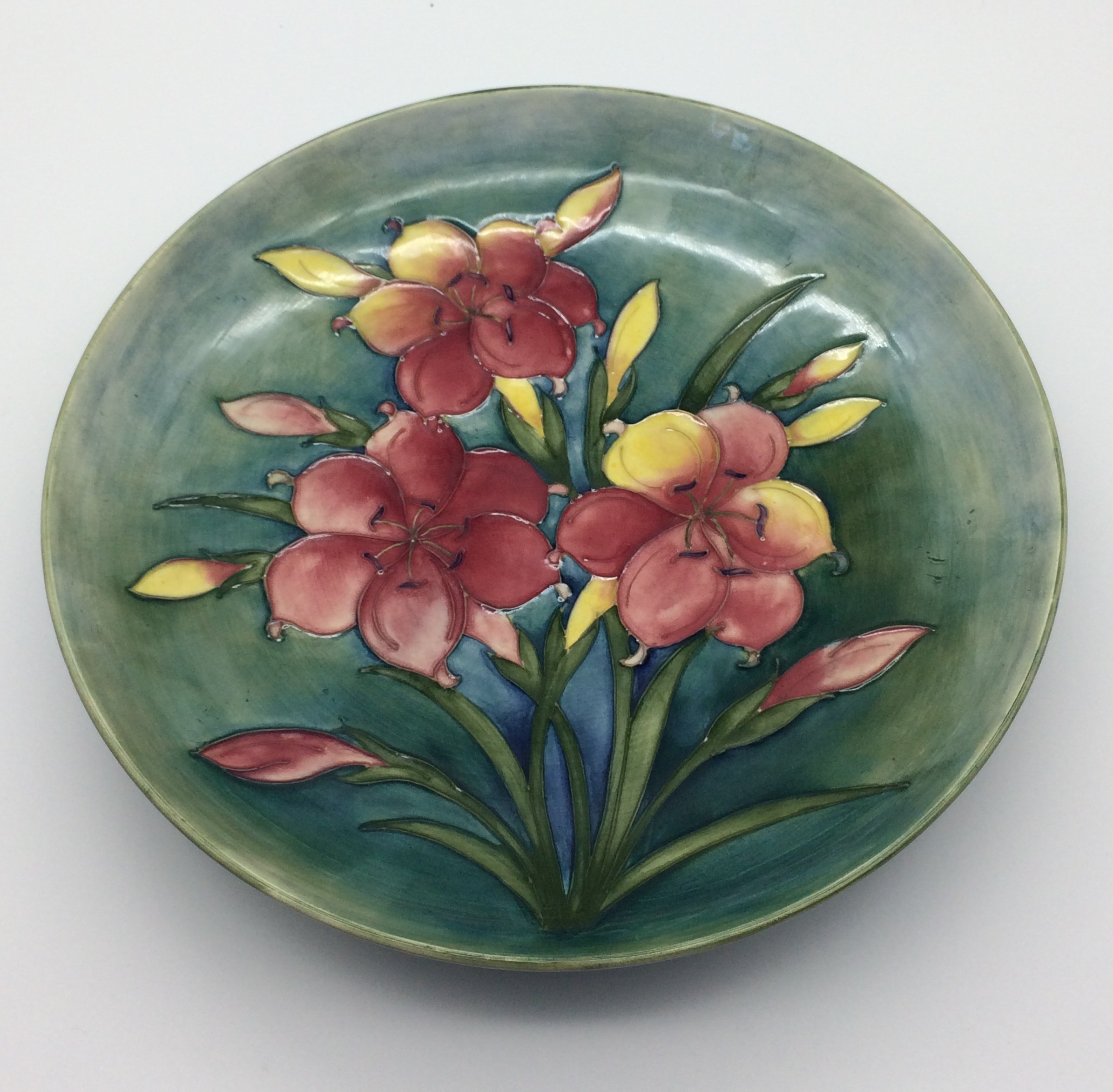 This is a very nice large, flat, shallow Walter Moorcroft ‘Freesia’ pattern bowl with a blue green background. It is signed and stamped on the base and is in excellent condition (with regulation fine clean crazing). Circa 1950’s.