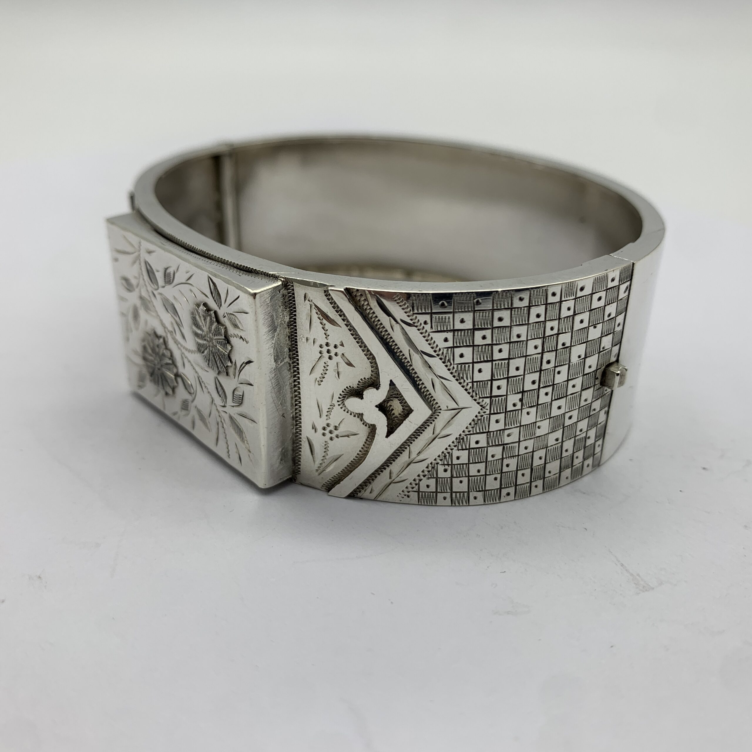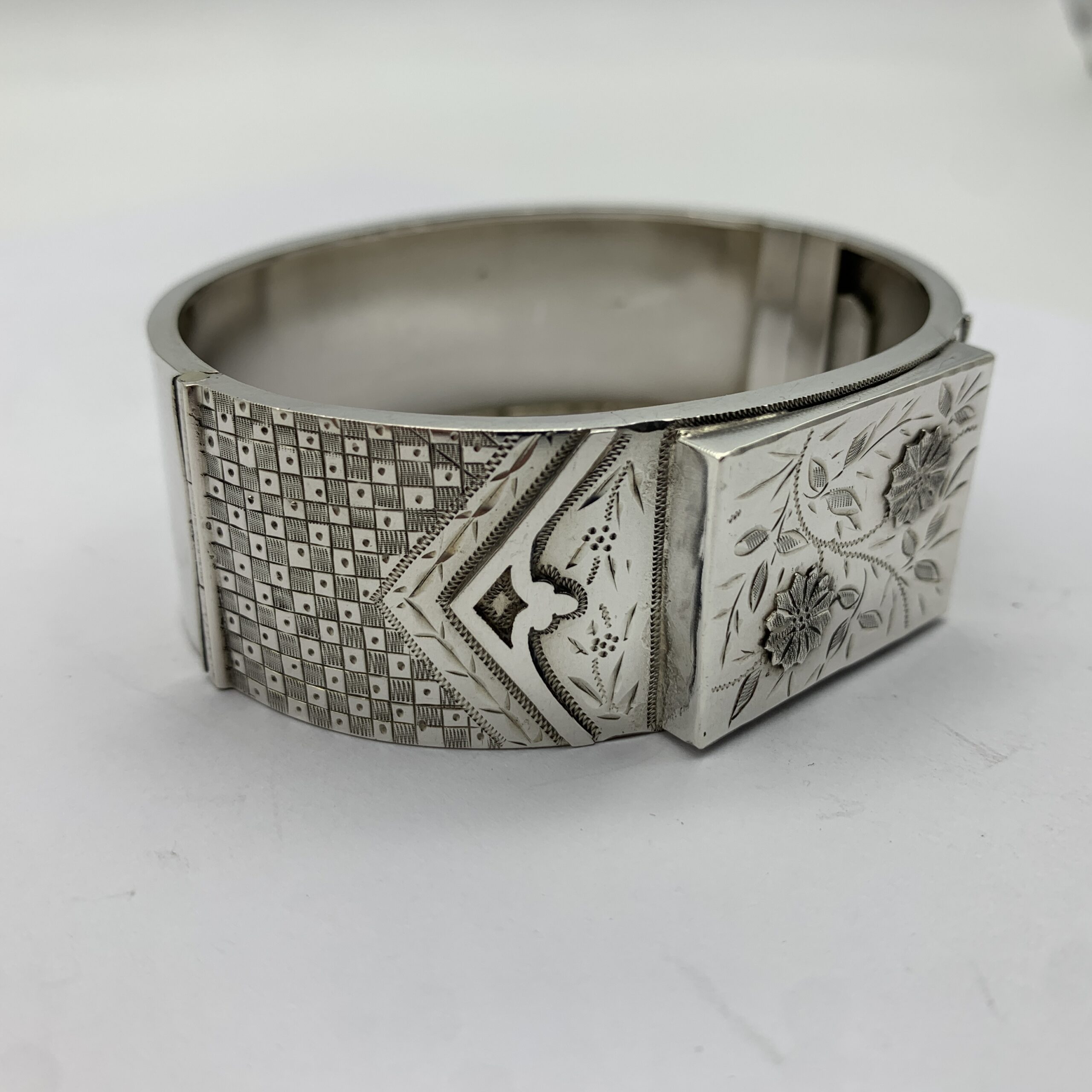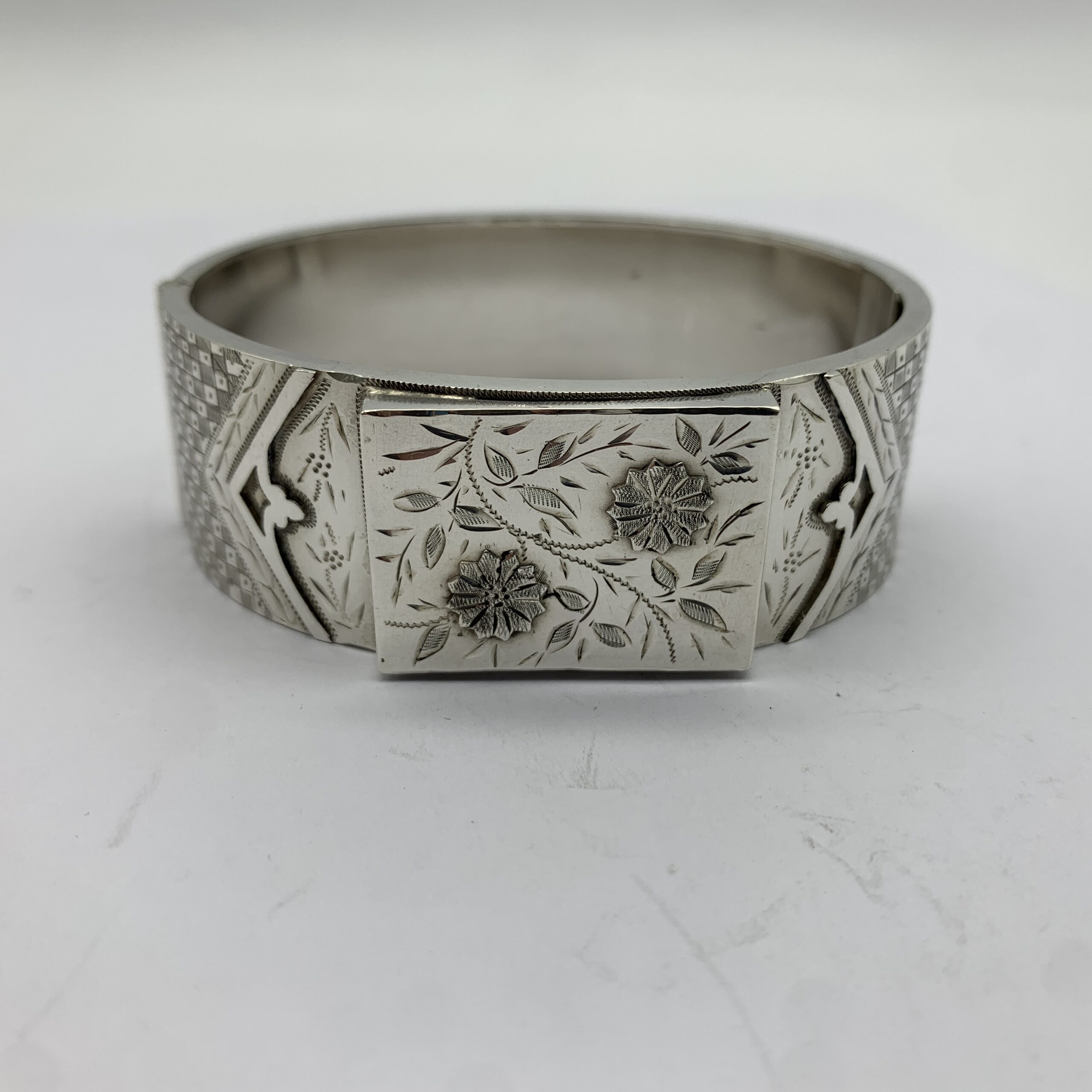 This wonderful, Victorian, sterling silver wide cuff bangle is beautifully decorated along the front half, featuring a raised rectangular shaped panel in the middle, engraved with stems, leaves, and two raised flowers, and on each side, there’s a ‘checkerboard’ style engraved pattern, along with a thin raised border and a few more engraved flowers. This fine quality bangle is in superb condition with a strong hinge and secure push-in clasp, and although there are no assay marks, it has been tested and confirmed sterling silver. The bangle measures 7,5cm x 6,2cm with a width of 2,5cm and weighs 33g.