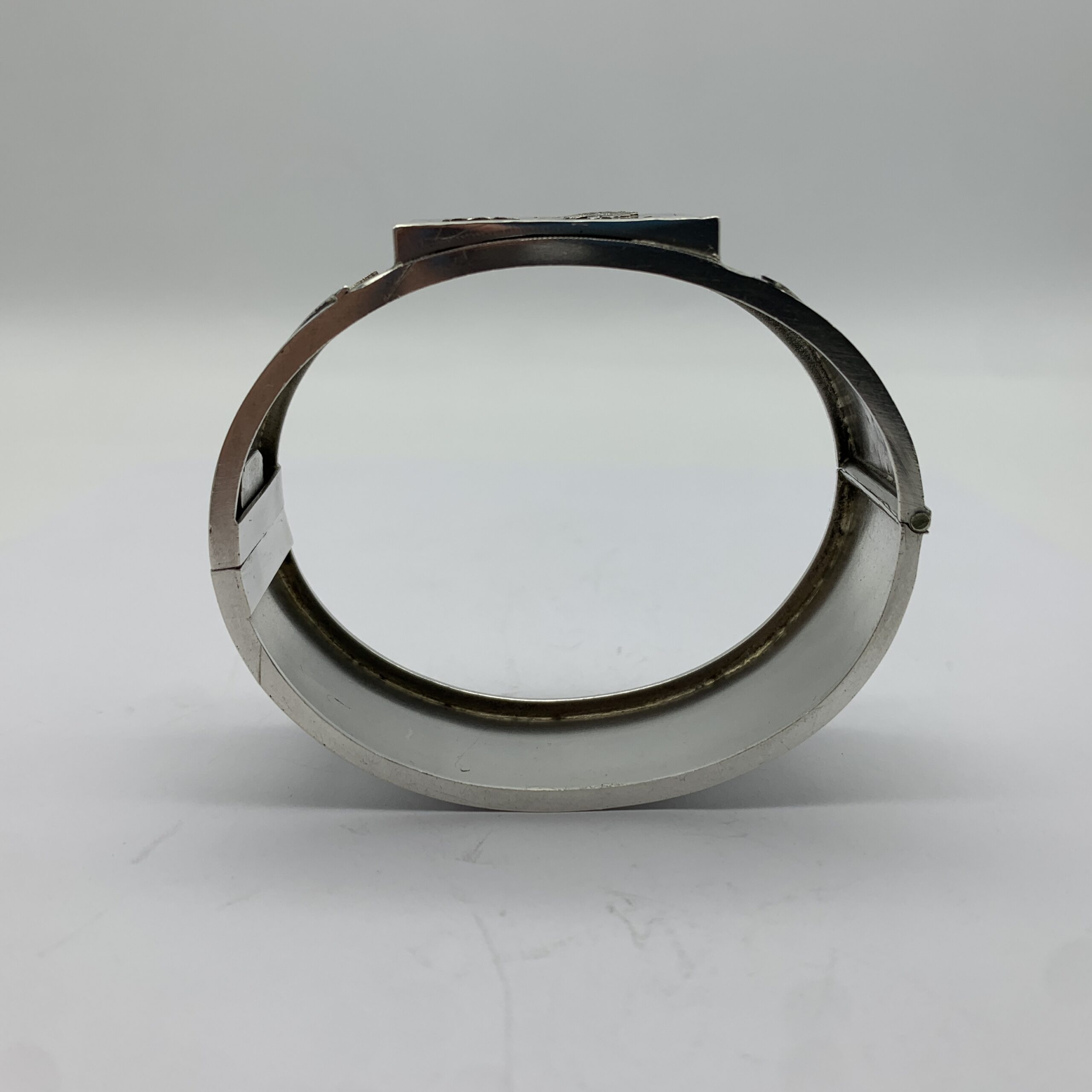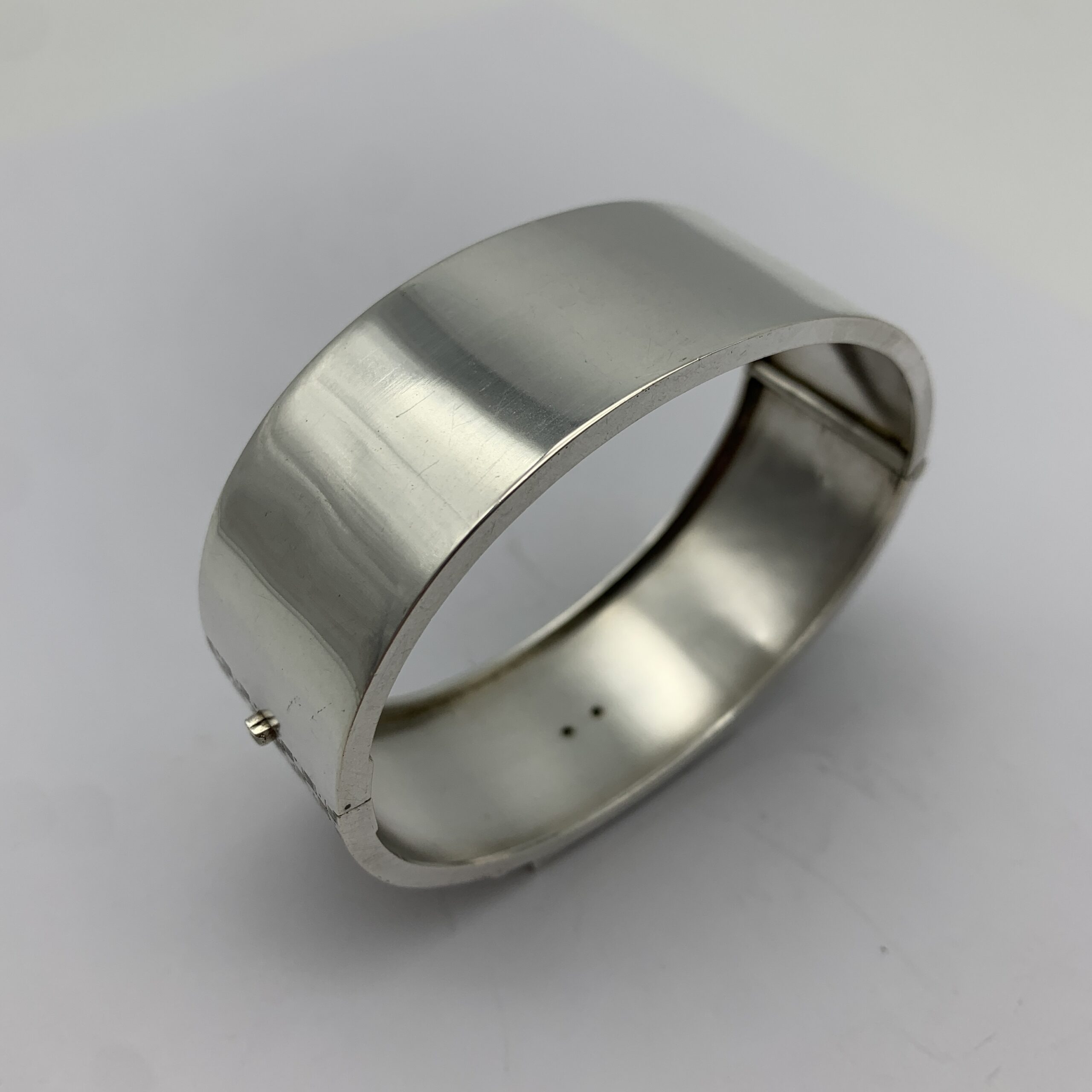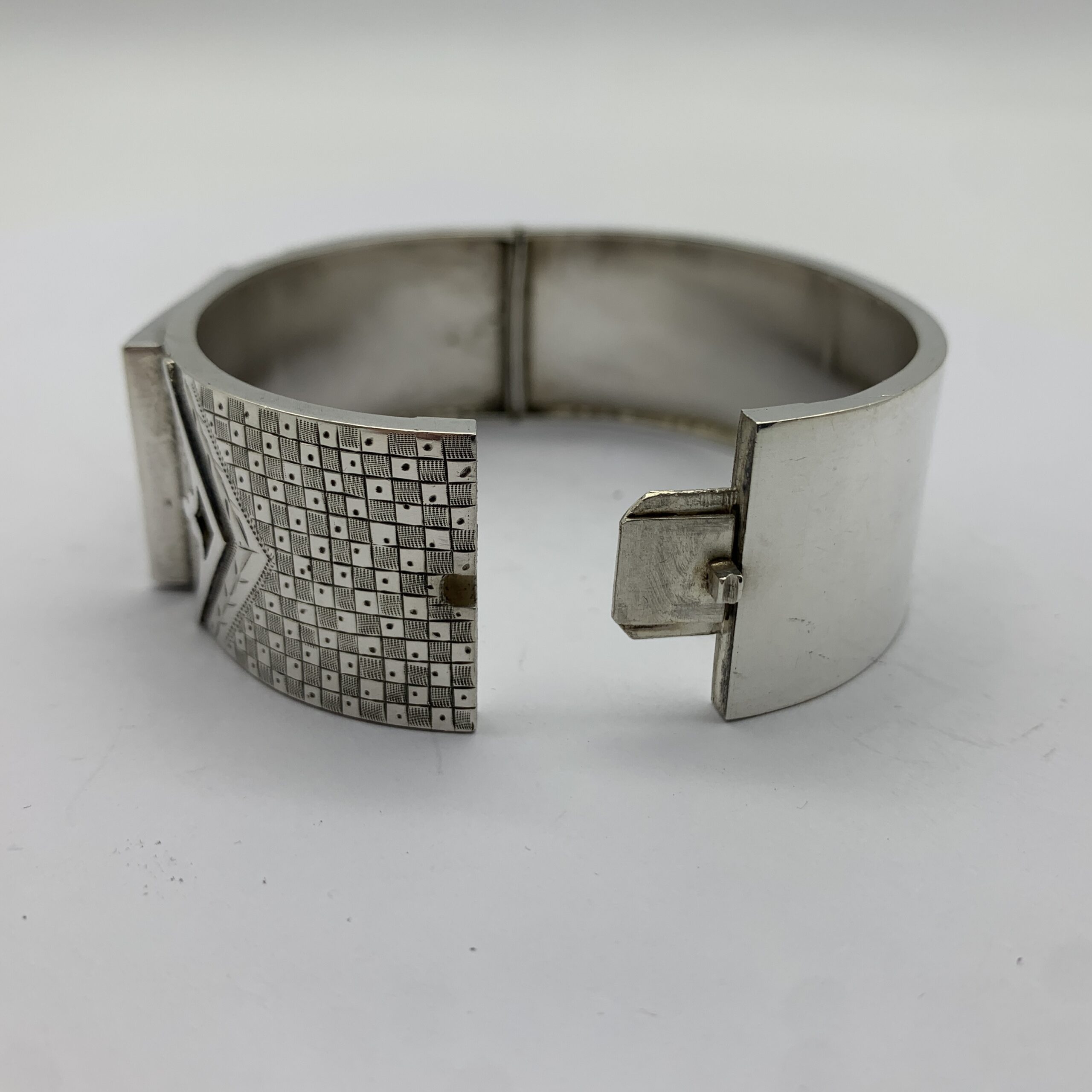 This wonderful, Victorian, sterling silver wide cuff bangle is beautifully decorated along the front half, featuring a raised rectangular shaped panel in the middle, engraved with stems, leaves, and two raised flowers, and on each side, there’s a ‘checkerboard’ style engraved pattern, along with a thin raised border and a few more engraved flowers. This fine quality bangle is in superb condition with a strong hinge and secure push-in clasp, and although there are no assay marks, it has been tested and confirmed sterling silver. The bangle measures 7,5cm x 6,2cm with a width of 2,5cm and weighs 33g.