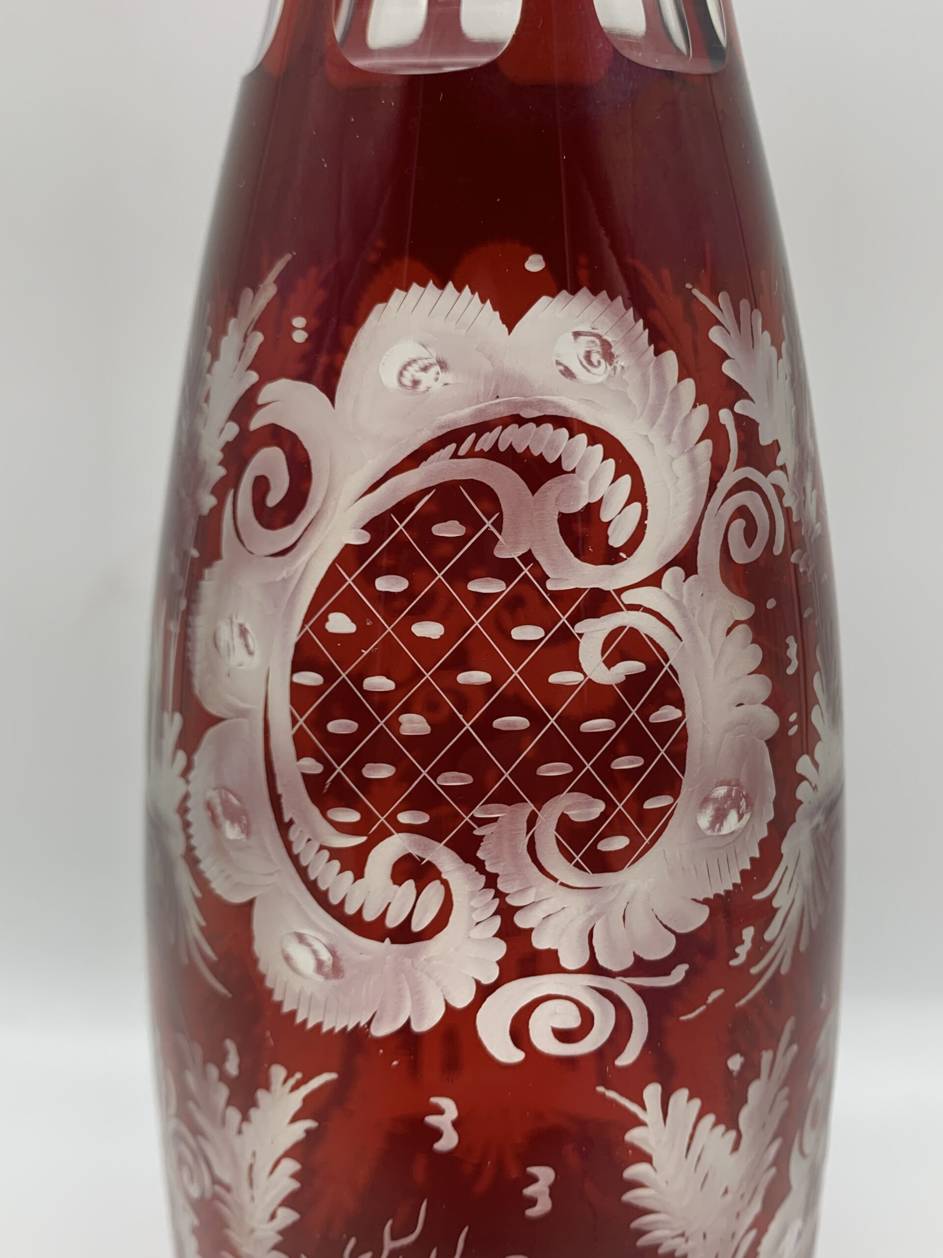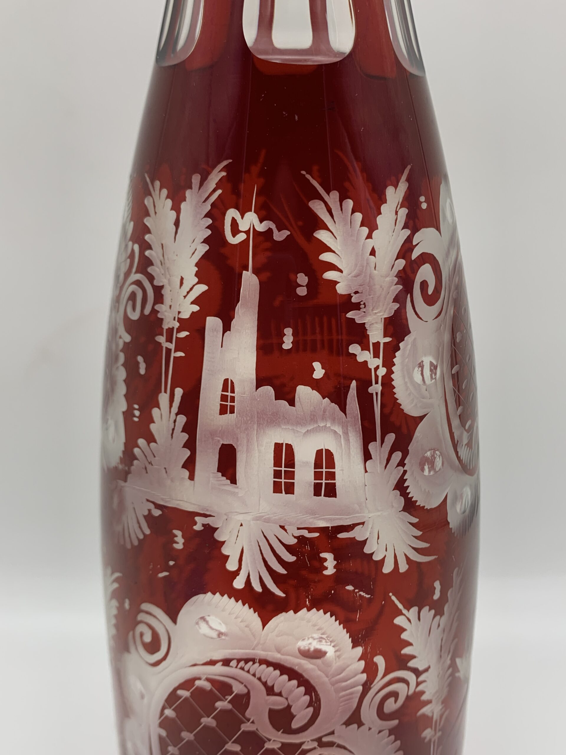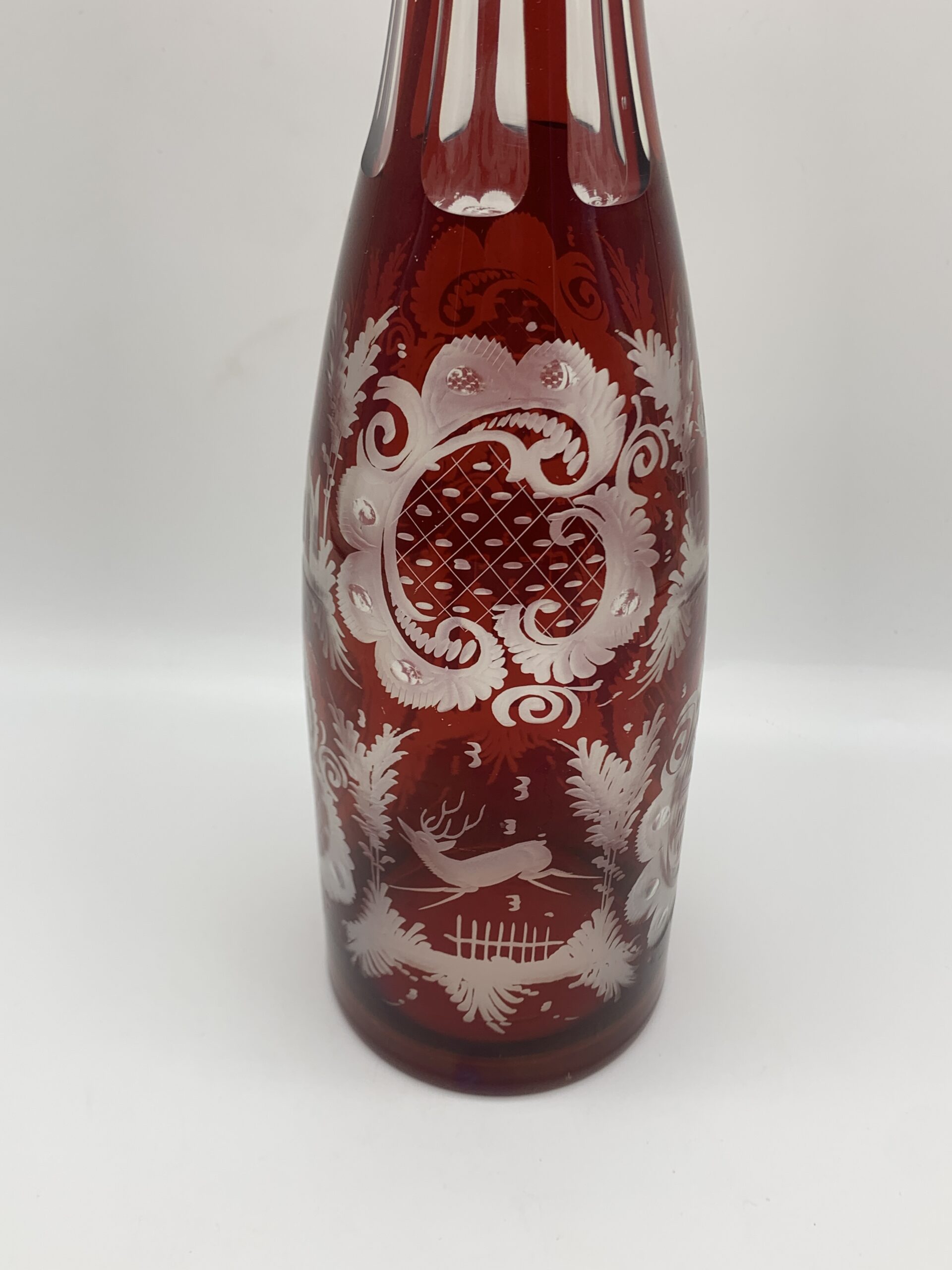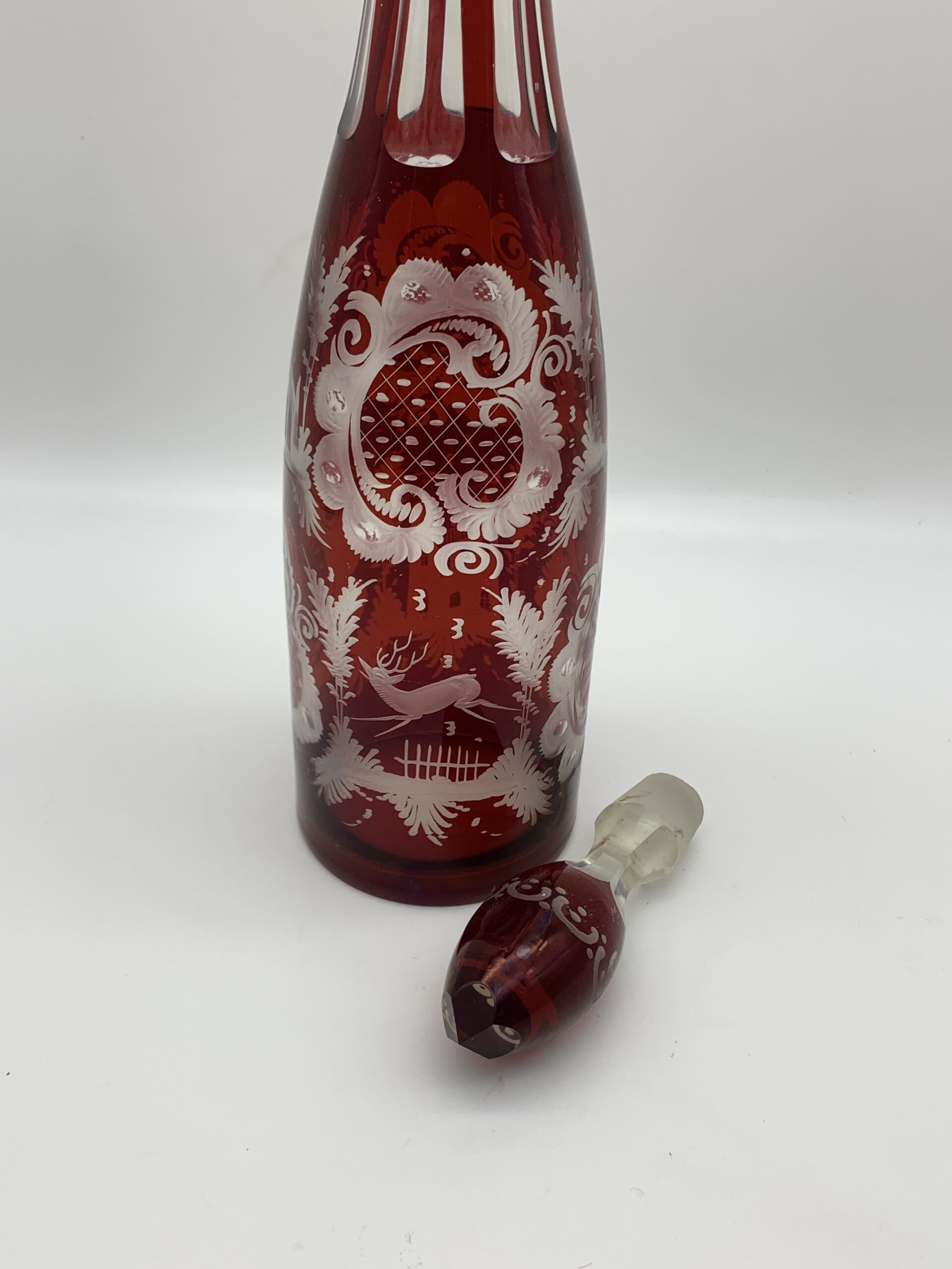 This amazing, lovely quality, garnet-red Bohemian ‘cut-to-clear’ crystal decanter and stopper has an attractive slender shape with seven deep-cut panels along the neck. It is beautifully hand engraved and etched with amazing detail against a garnet-red background, featuring birds, buildings, a deer, amongst trees and other decorative patterns. This wonderful decanter and stopper are in excellent condition and stands 39cm high (32cm without stopper), measures 8cm at its widest and weighs 680g.