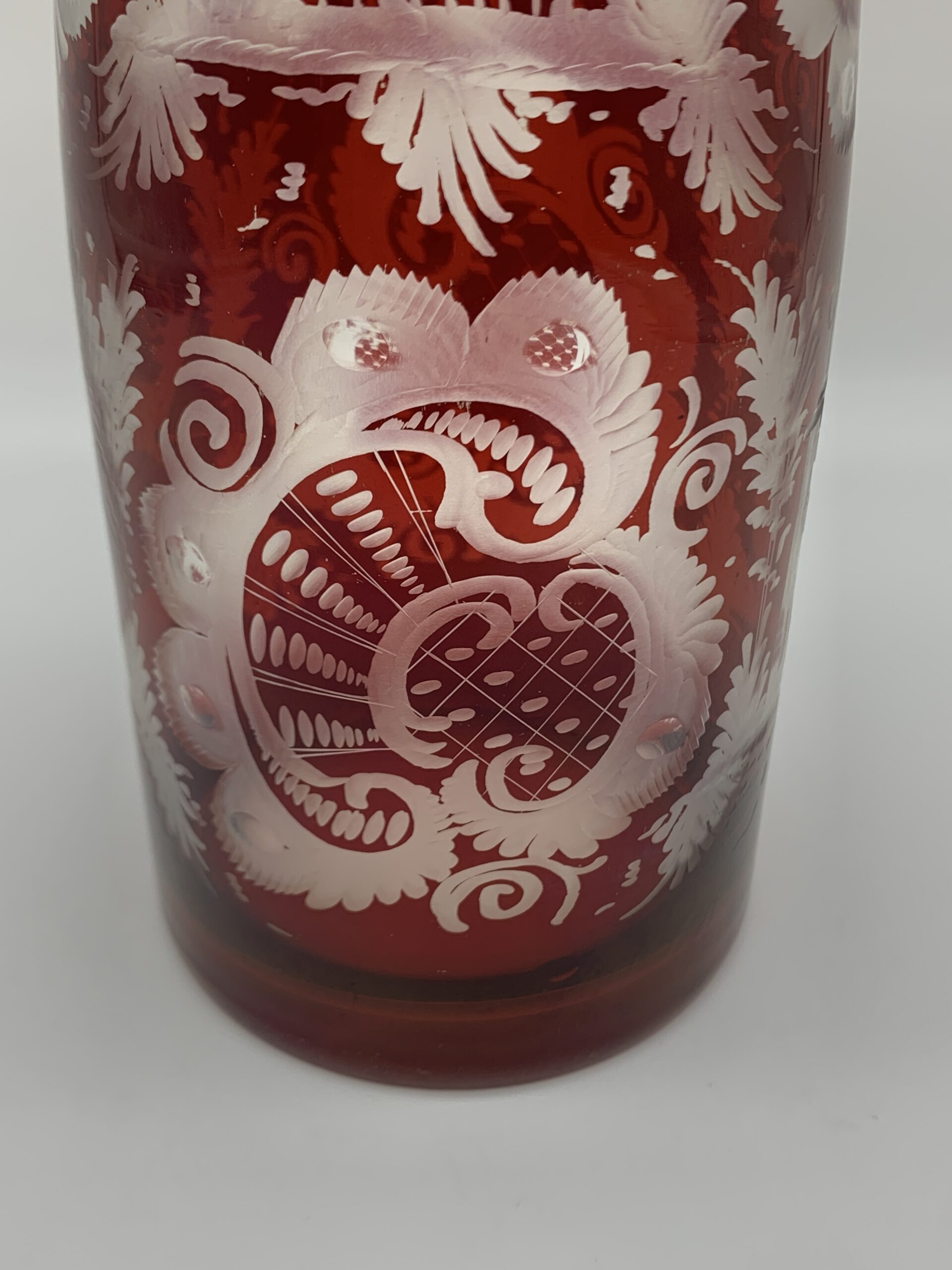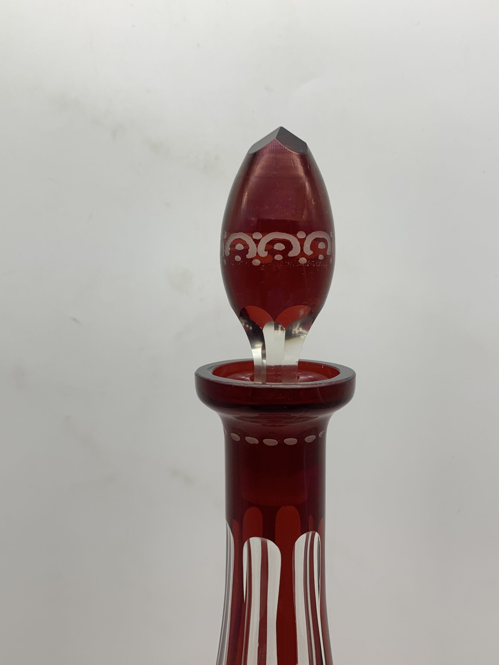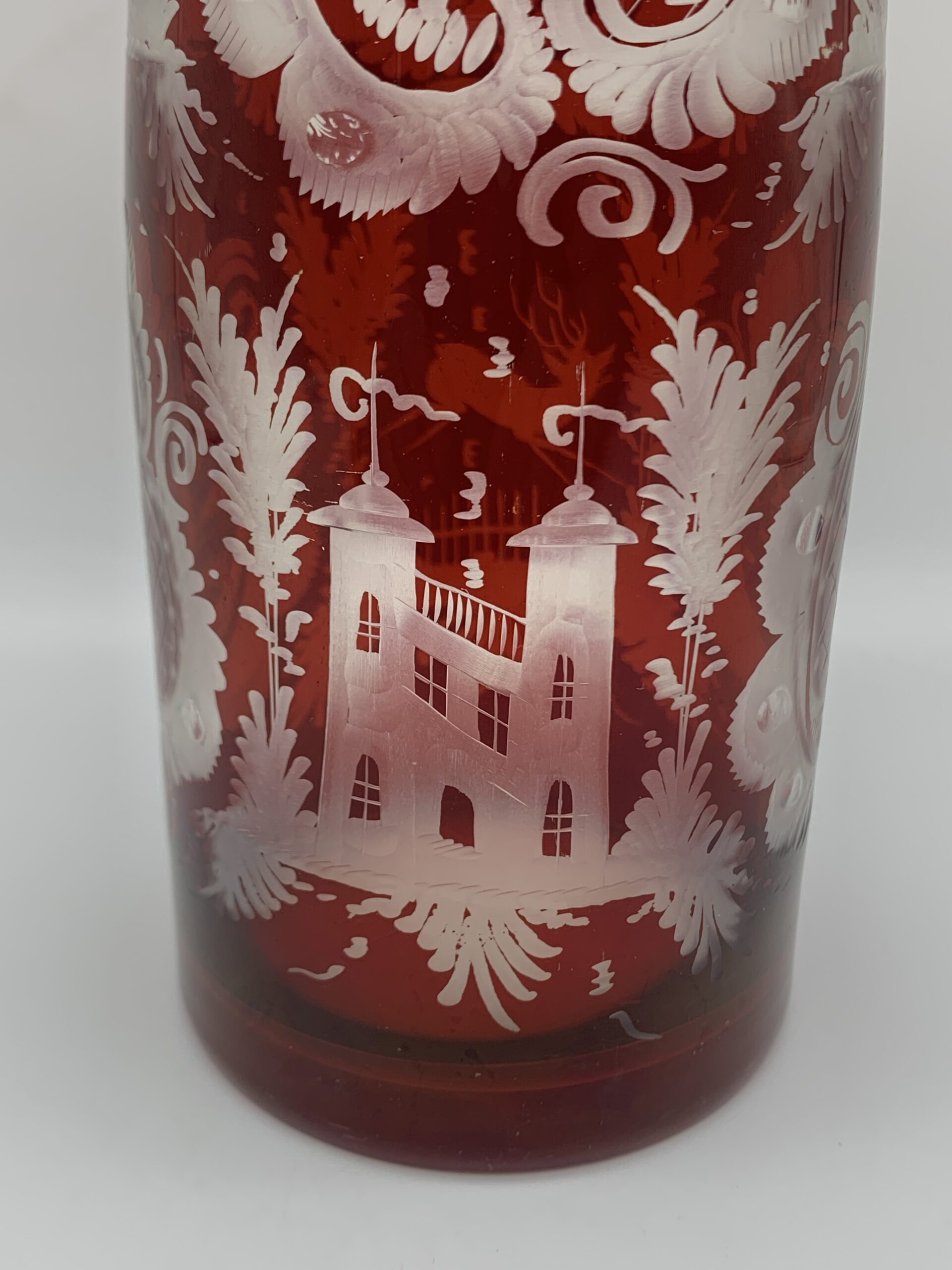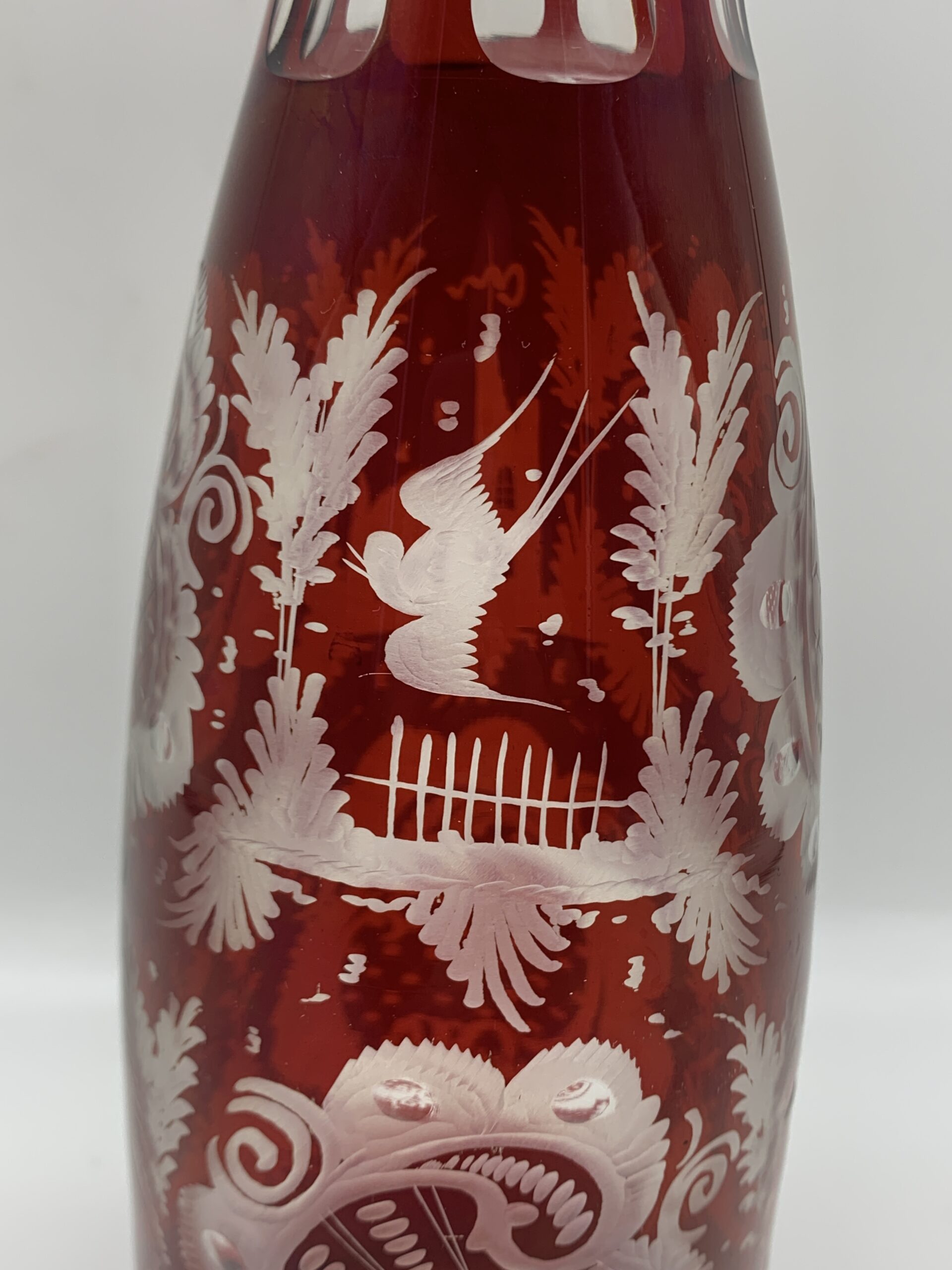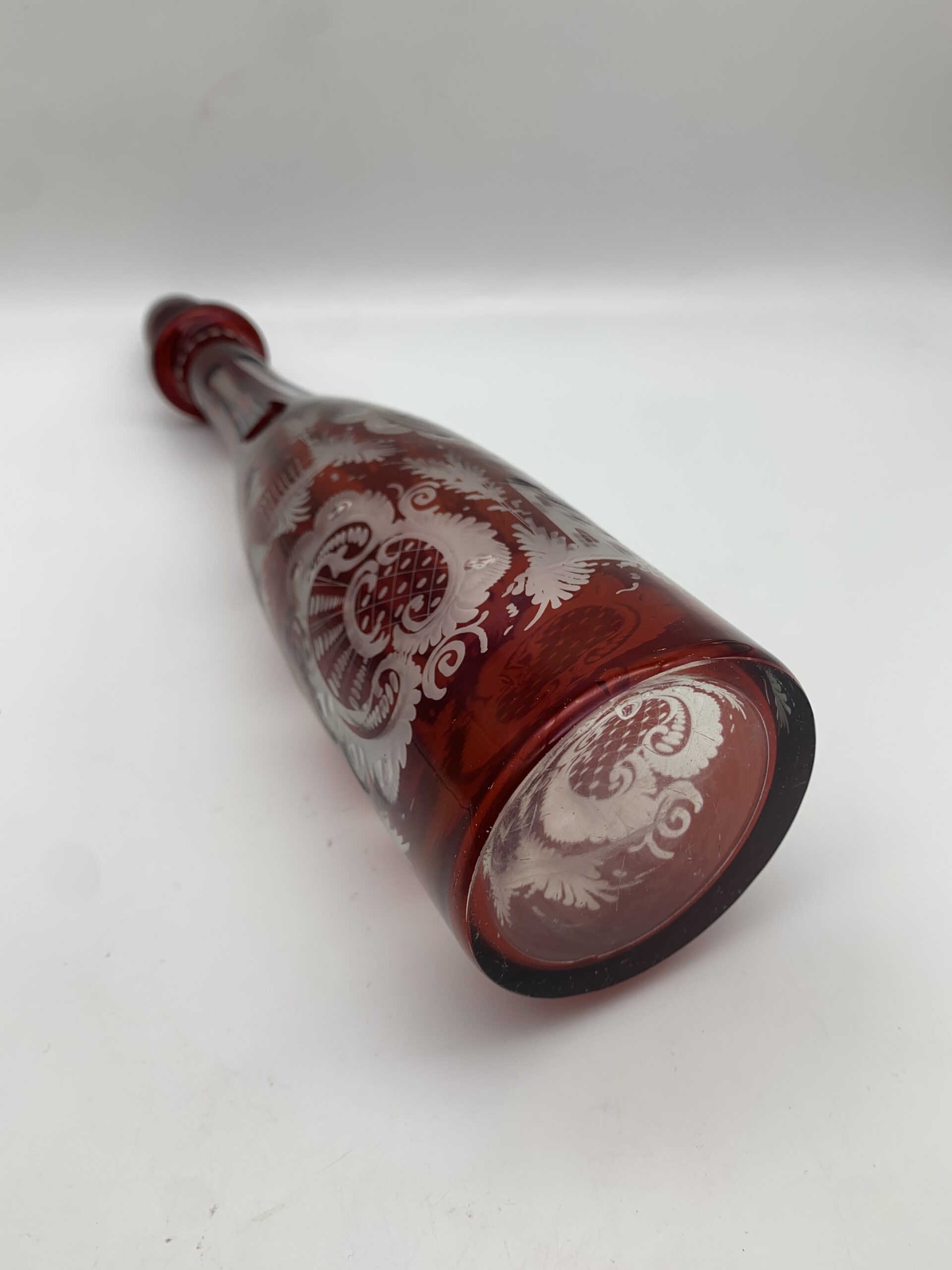 This amazing, lovely quality, garnet-red Bohemian ‘cut-to-clear’ crystal decanter and stopper has an attractive slender shape with seven deep-cut panels along the neck. It is beautifully hand engraved and etched with amazing detail against a garnet-red background, featuring birds, buildings, a deer, amongst trees and other decorative patterns. This wonderful decanter and stopper are in excellent condition and stands 39cm high (32cm without stopper), measures 8cm at its widest and weighs 680g.