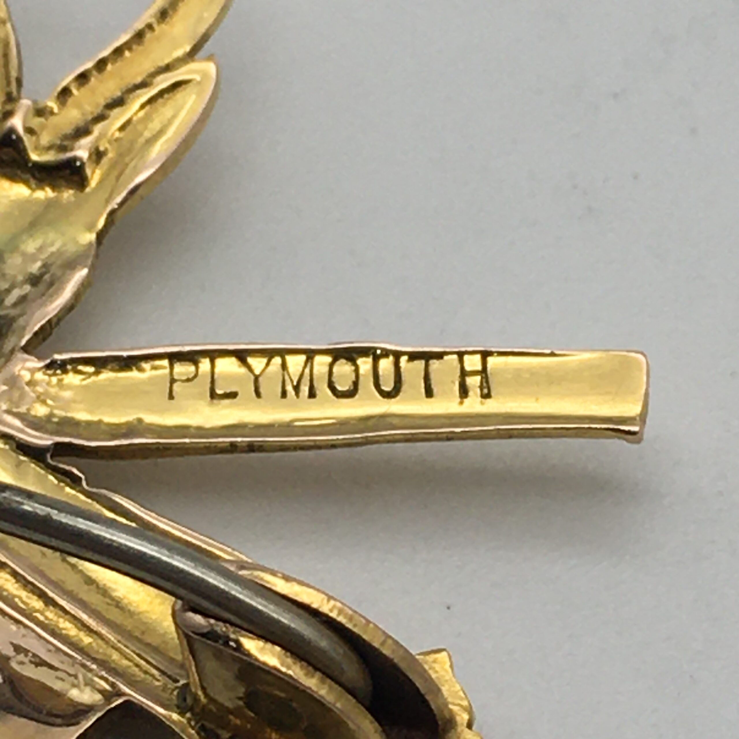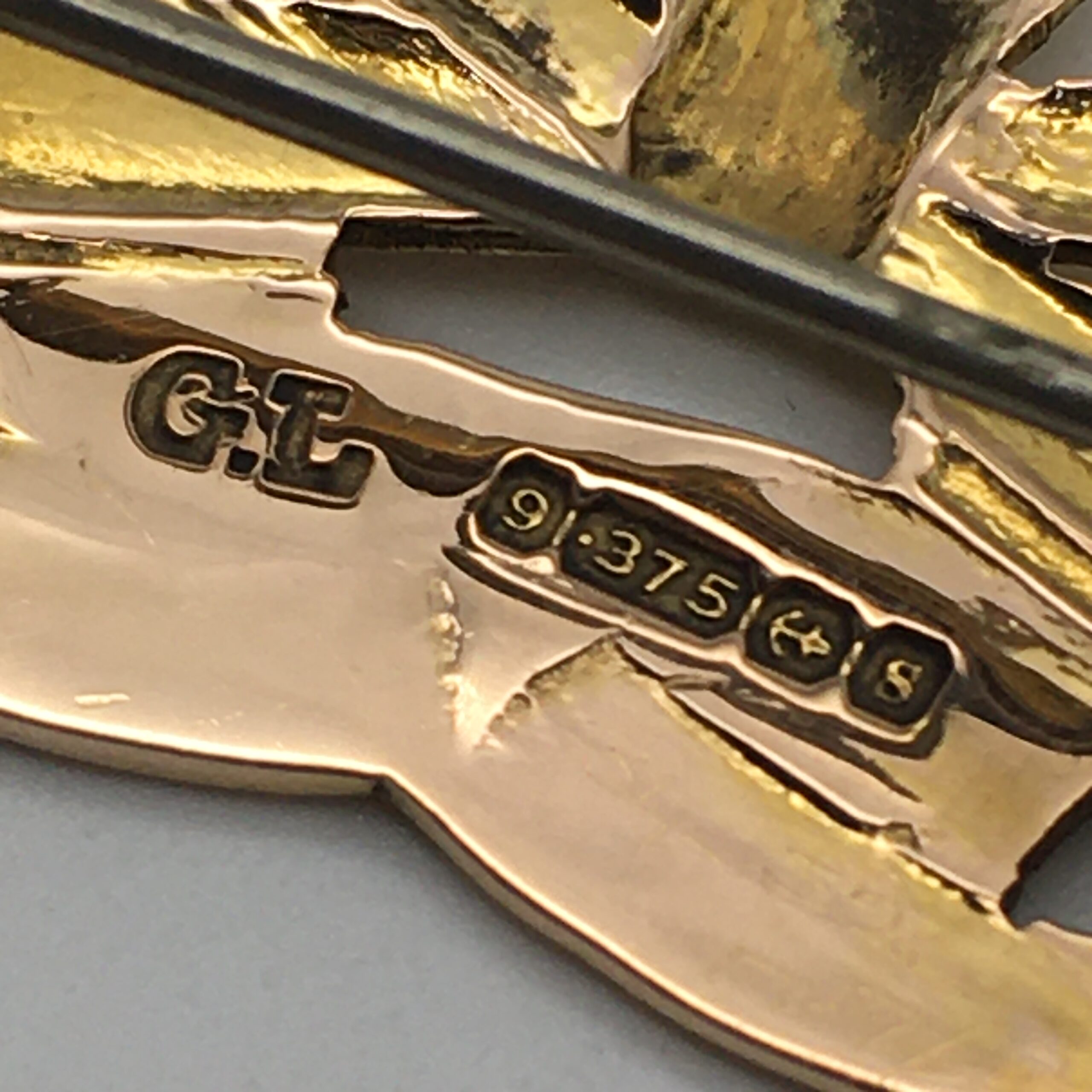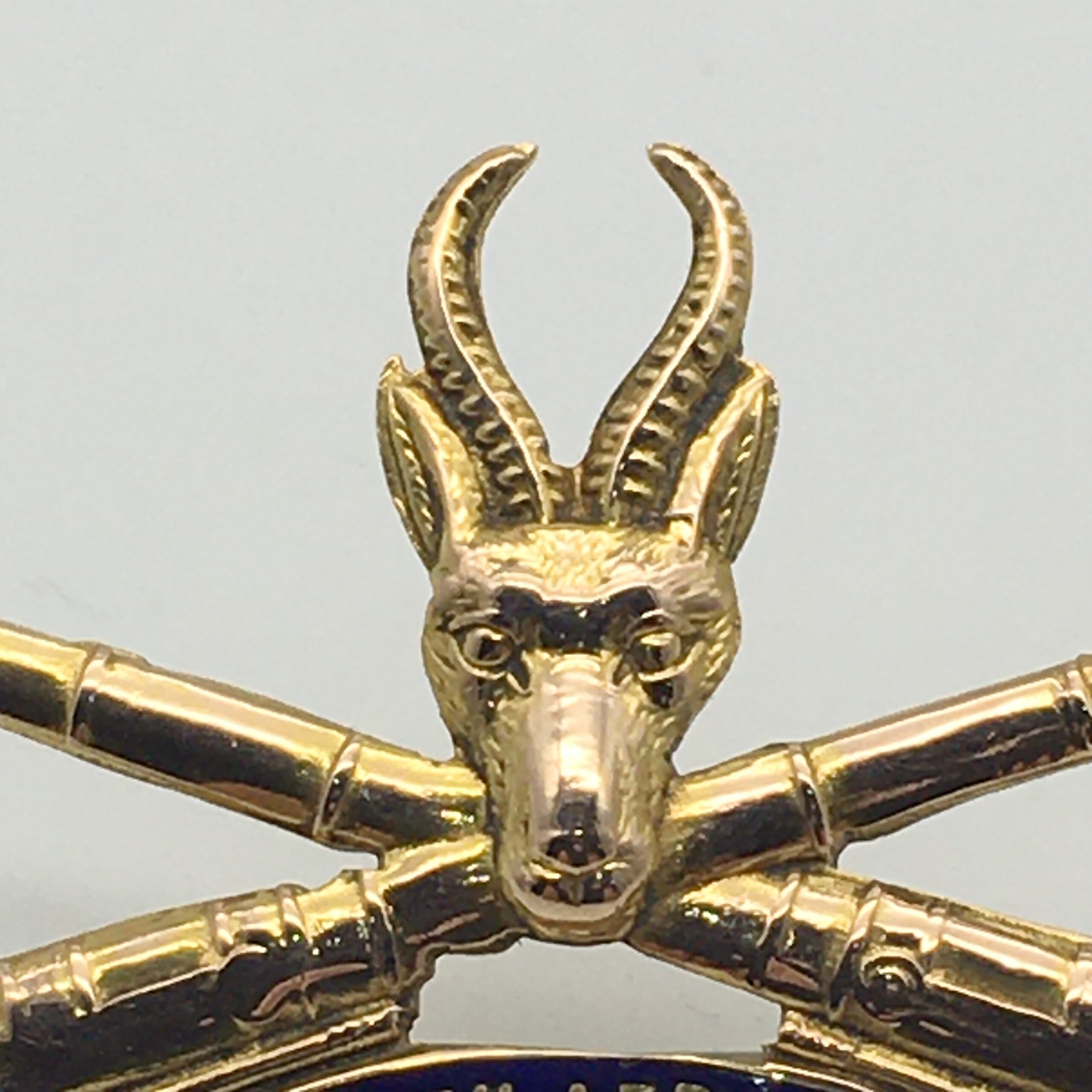 This scarce, WW1 9ct gold and enamel sweetheart brooch of the ‘South African Heavy Artillery’ (S.A.H.A) is in mint condition. It features the springbok head above two crossed heavy artillery guns, with the wording in blue enamel below. The solid gold brooch is identical to the collar badge worn by the S.A.H.A. during the first world war. It is English hallmarked on the back, indicating that it was made in Birmingham in 1919 by jewellers ‘George Loveridge & Co’ (G.L), and is also stamped ‘9’ and ‘.375’ (marks for 9ct gold). The brooch measures 3,2cm x 2,7cm, and weighs 4,2g.