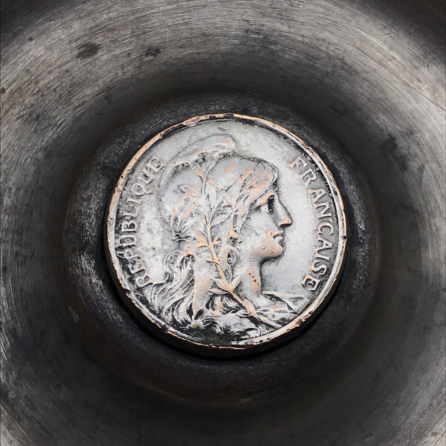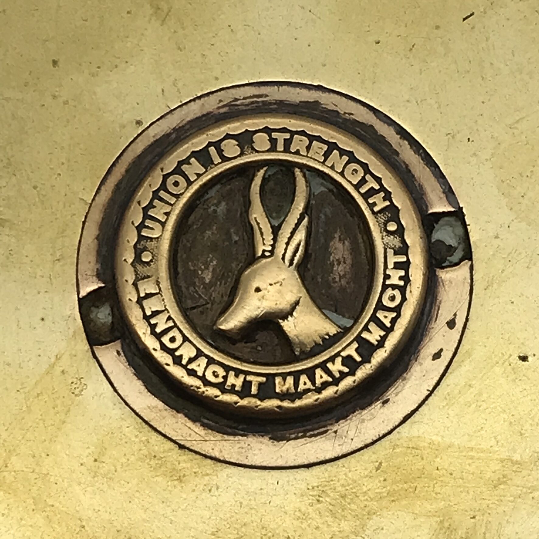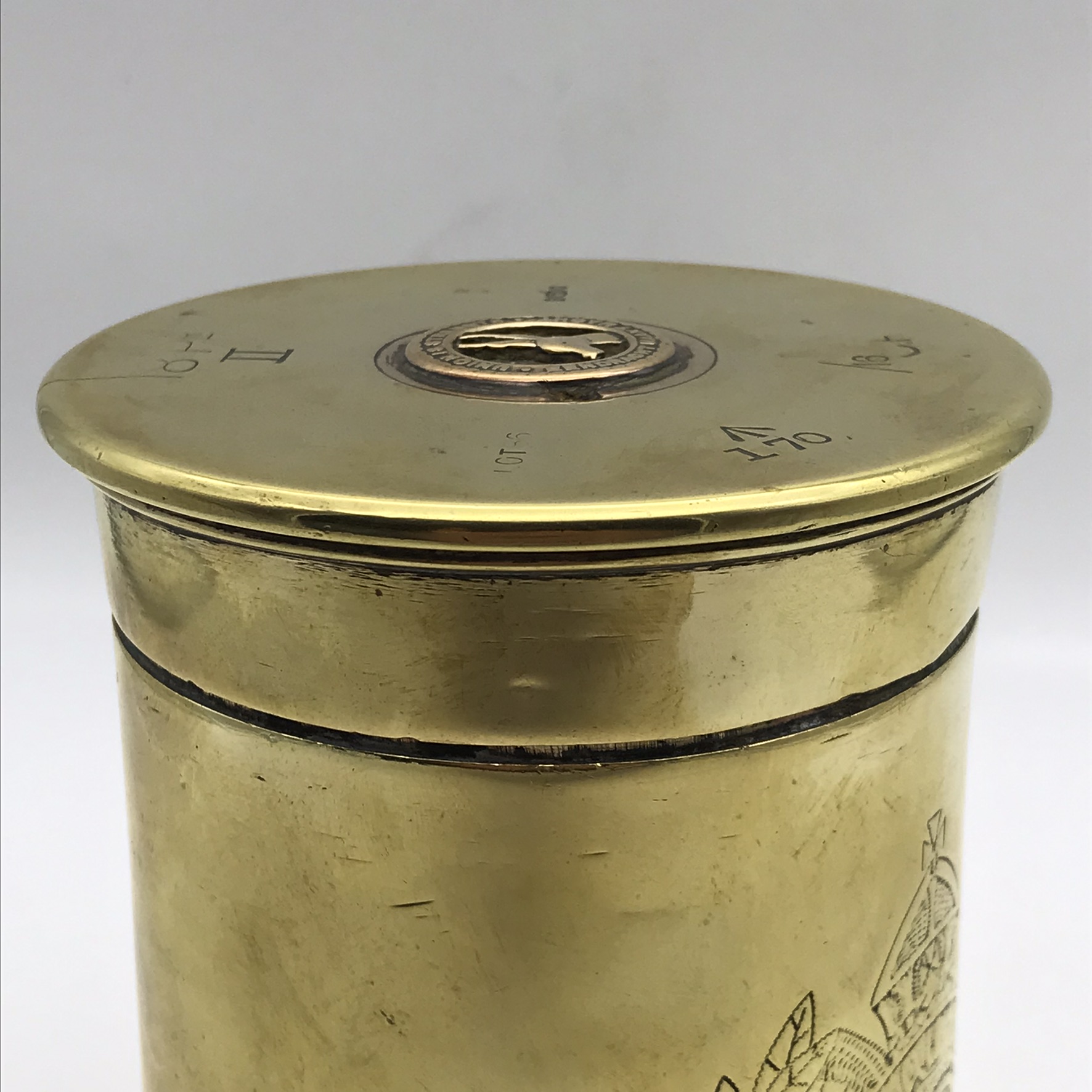 This wonderful, very early, heavy ’Prisoner of War or Trench Art’ container has been hand-crafted out of two ‘18PR Mk II’ brass shell casings and has been beautifully engraved on the front, with a picture of a large WW1 ‘Royal Engineers’ cap badge. It has also been fitted with a ‘Union is Strength’ cap badge on the lid, as well as two coins, one on the inner base and the other in the underside of the lid. There are various shell casing markings on the base and on the lid which I have photographed below. This wonderful piece is in great condition considering its age and stands 15,4cm high, with a base diameter of 10,2cm and a weight of 1,73kg.