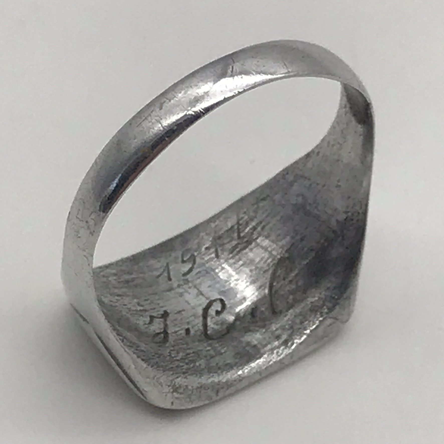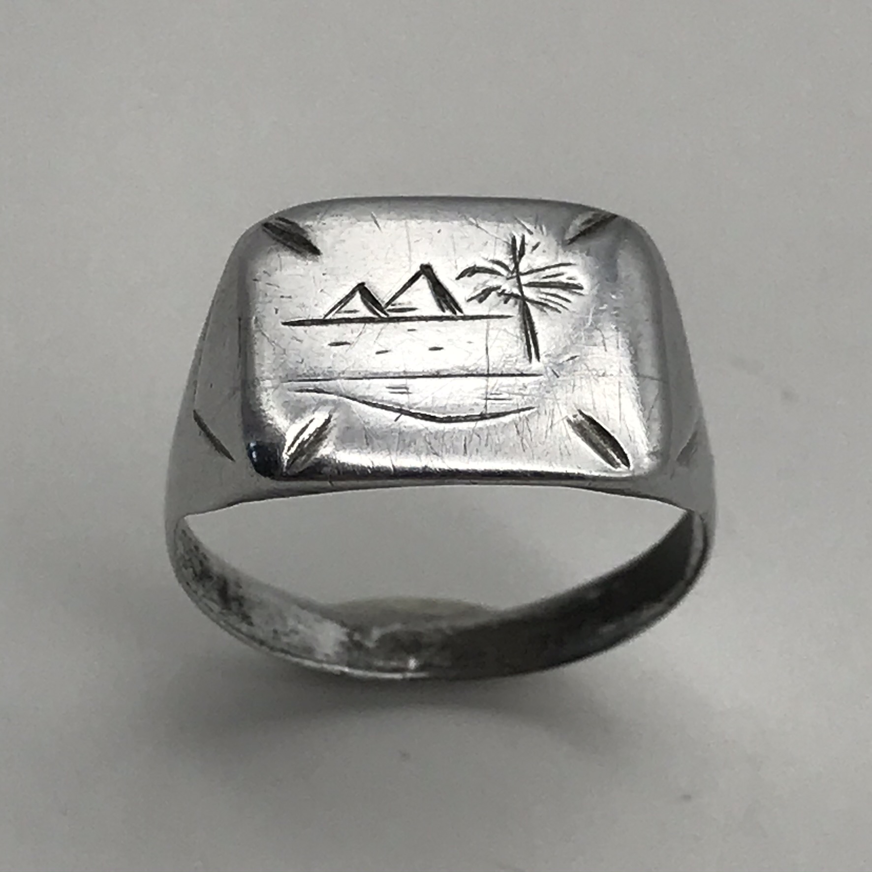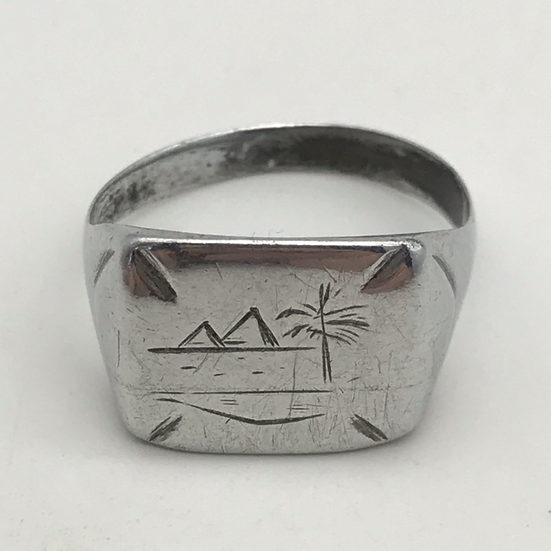 This early WW2, trench art or POW signet ring has been hand-carved and engraved out of a white metal, possibly aluminium. The top of the ring features pyramids and a palm tree and is also engraved with a date and owners initials ‘1941’ and ‘J.C.C’ inside the ring. It is in excellent condition and measures 22mm x 20mm x 12mm.
